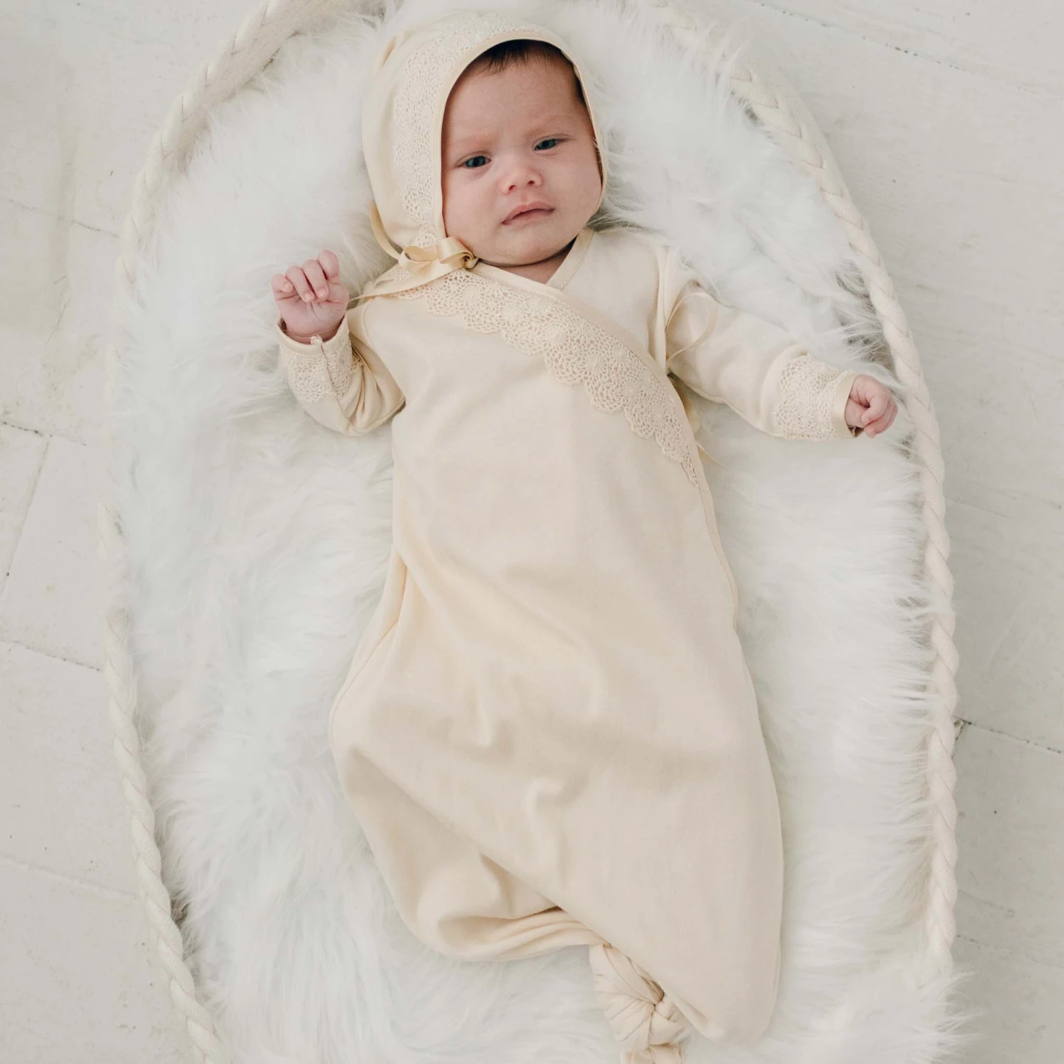 One of our newest layette gowns for newborn girls combines our softest cotton with a functional newborn design. The Mia knot gown is made with 100% pima cotton, known for its soft texture and heirloom quality, in a lovely shade of champagne. Detailed with a beautiful cotton lace on the front bodice and cuffs. 100% silk dupioni trim adds an elegant touch to the design. The kimono style front makes it simple to get your newborn dressed and changed and is secured by gold silk ribbon ties. The bottom of the layette ties into a knot to create the perfect length and keep her newborn toes warm.