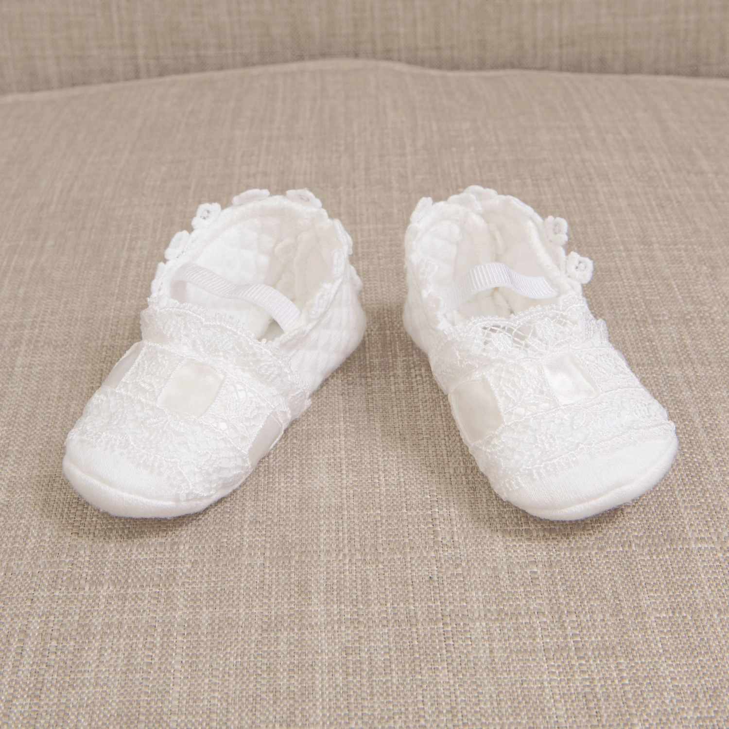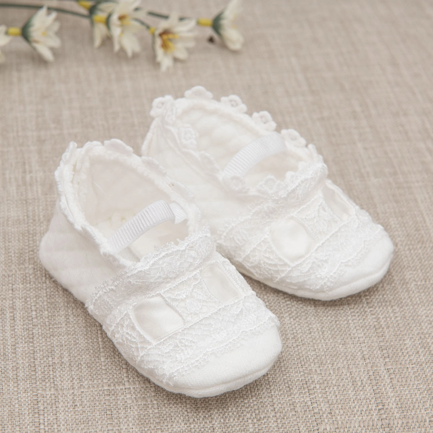 The sweetest little cotton baby shoes to keep her toes warm! The Mila booties are handmade with a soft white quilted cotton for your little girl’s comfort, and are beautifully detailed with lace and silk ribbon woven across the toe for a special detail and touch. These are simply designed, so they can match with any special occasion outfit for baby girls.