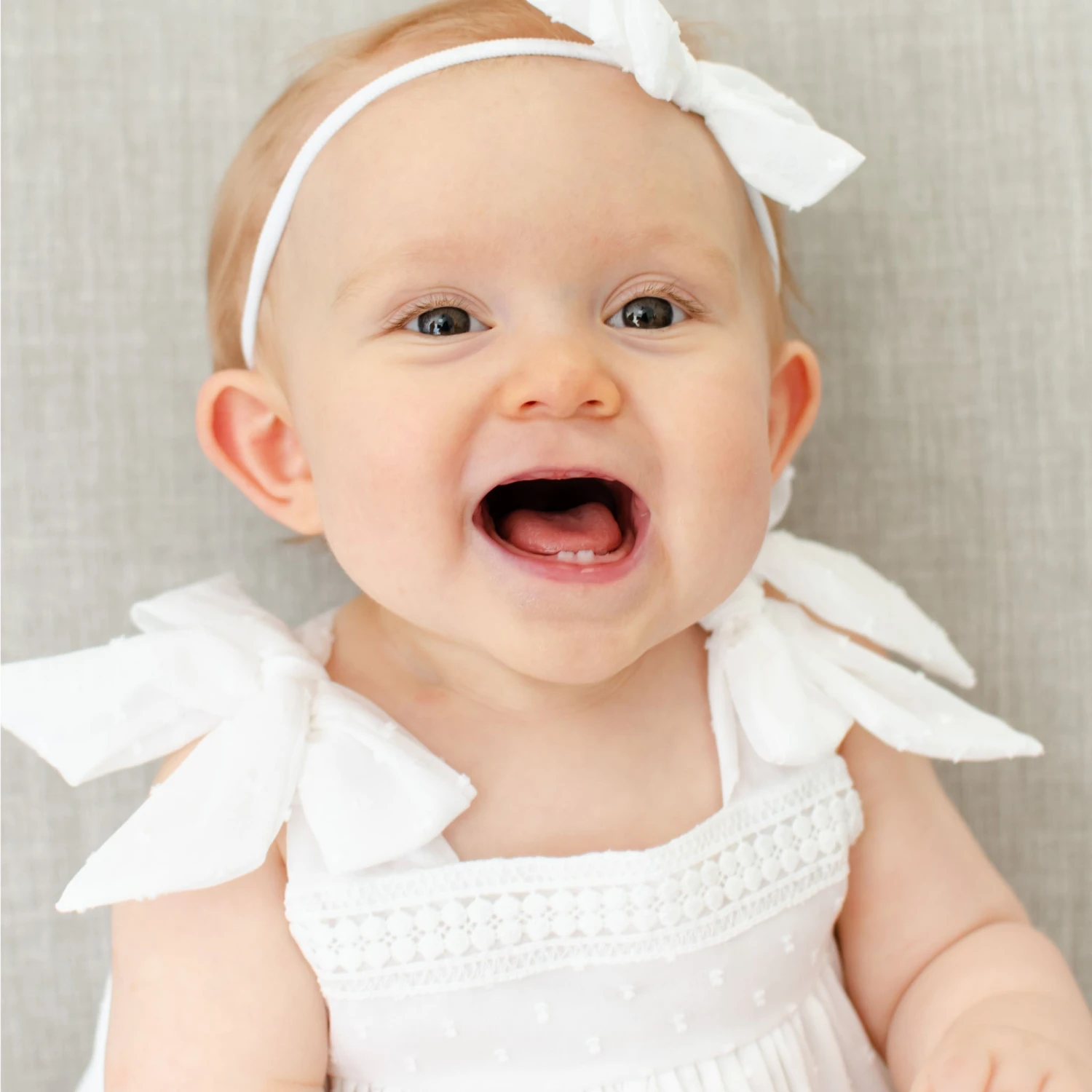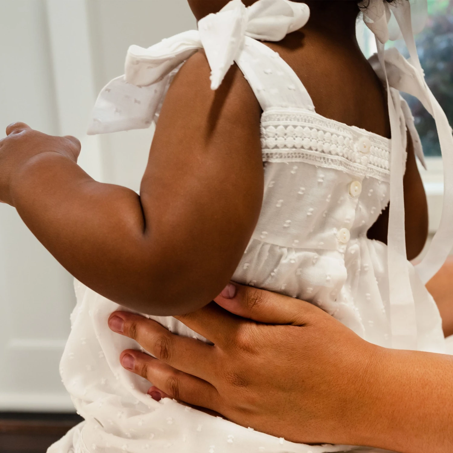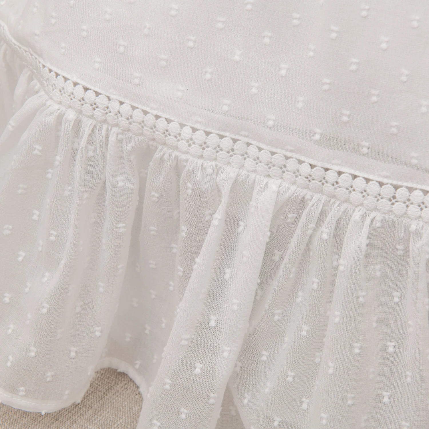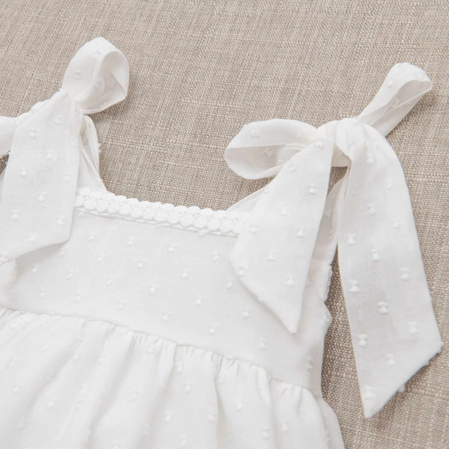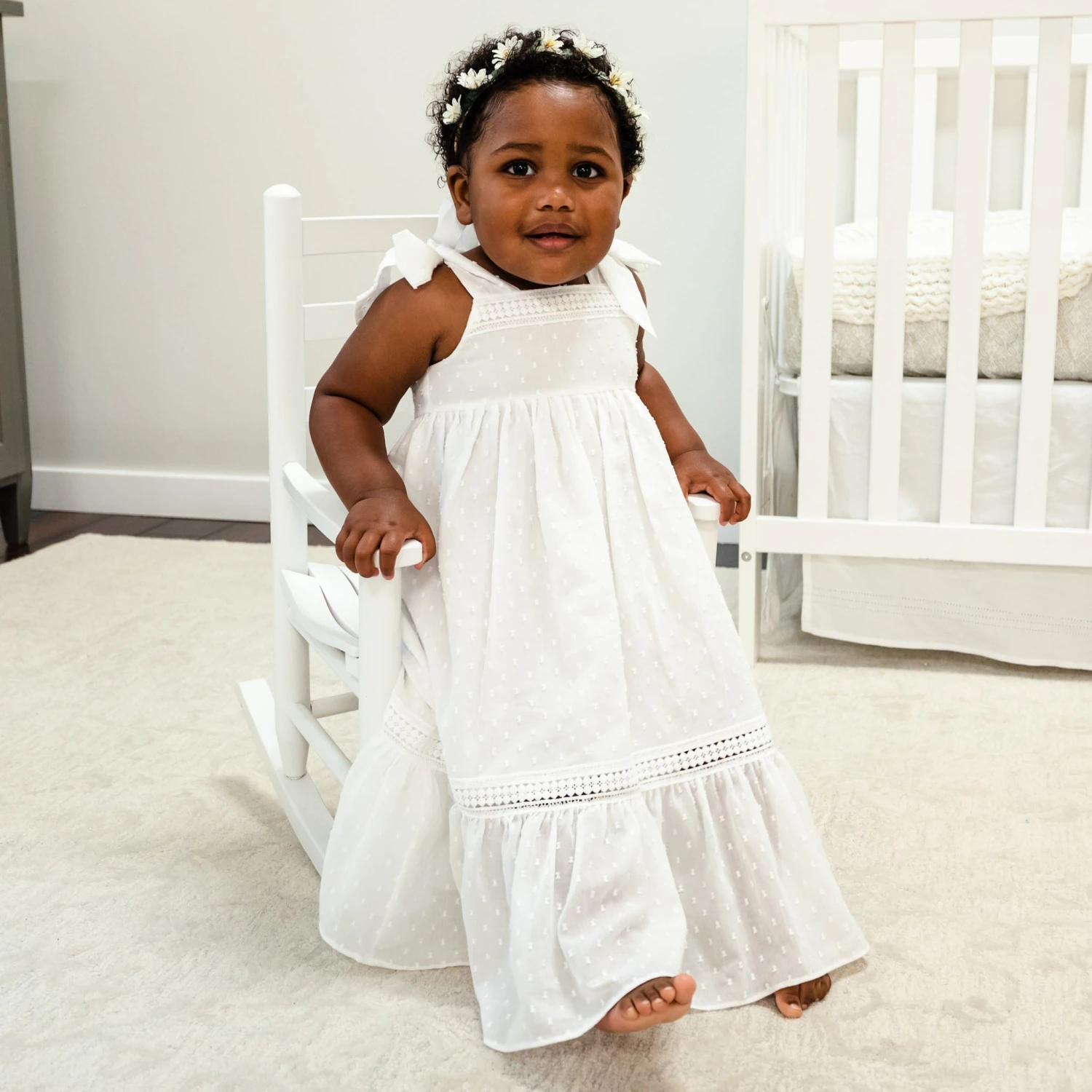 A sweet style that that is sure to be as comfortable as it is adorable! The Mila cotton gown is made with soft Swiss dot cotton in white, the dot pattern and lace trim provides vintage inspired details in a modern style. Lined in a super soft woven cotton which creates a gown that she will be comfortable in all day! Designed to fall just past her toes with functional ties on the shoulders allow for a comfortable fit and summary closure on the back help with easy changes! Pair with the matching Mila bow headband or daisy crown to complete her special look.