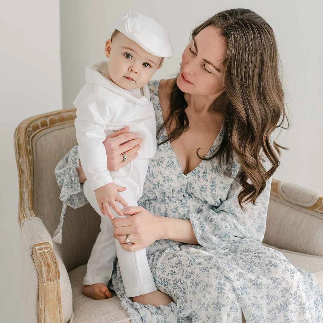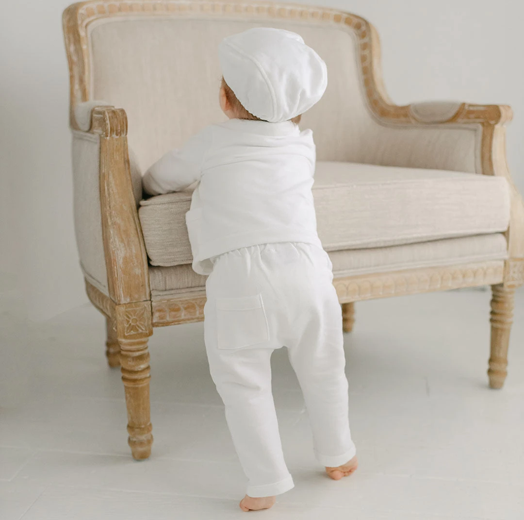 The Miles Baby Boy Suit is crafted with our premium French Terry, a soft material with a beautiful texture. The lovely texture and feel of the material adds a unique take on our beloved baby boy 3-piece suit design. Includes the matching Jacket, Pants & Shirt. The jacket features a fold over collar, pockets and summarys. Pair with the matching newsboy cap and booties to complete the look that is perfect for any special occasion that calls for baby boy dress clothes.