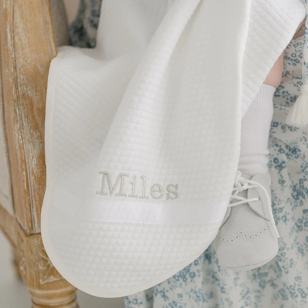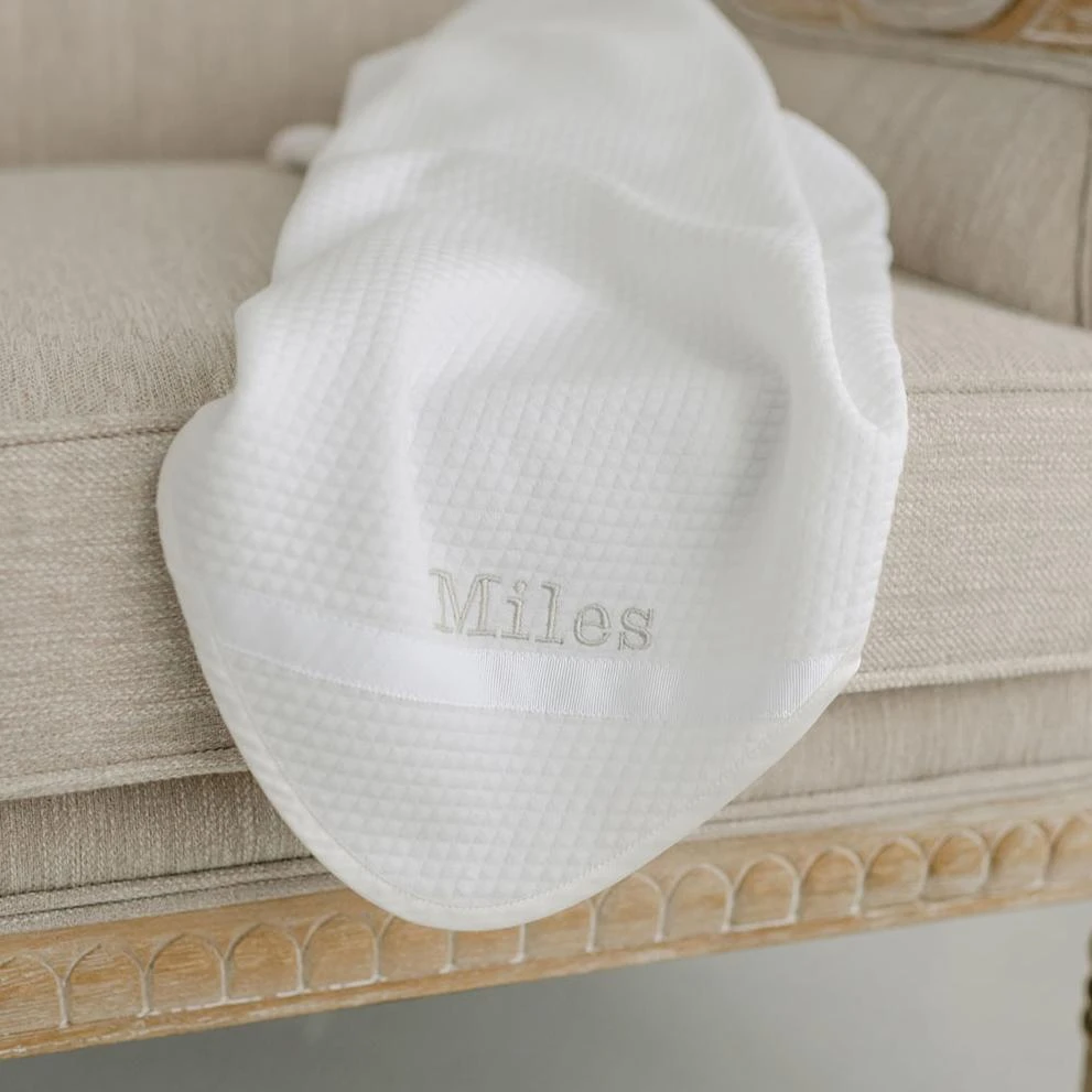 Give him a special blanket to snuggle up with on his big day. The Miles blanket is made with soft 100% quilted cotton, one corner is detailed with ribbon for a handsome look. The edges are finished with silk piping. We offer the option to embroider his name above the corner for a personalized touch that he will cherish for years to come. Makes a wonderful baby shower gift, take-me-home blanket, or even for a christening or baptism gift.