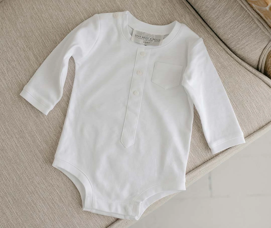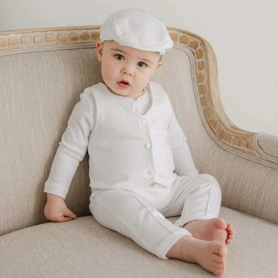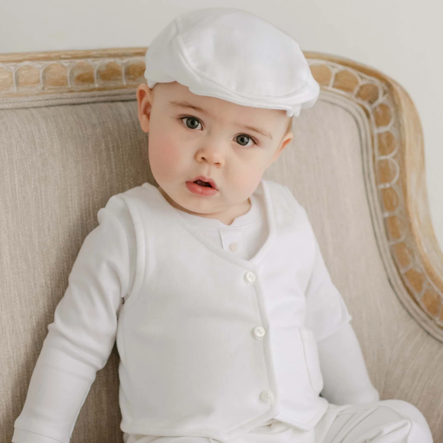 The Miles Terry Vest Baby Boy Suit is made with our luxurious french terry in white. The terry vest features a pocket detail and summary closure. Beautiful hand crafted details on the terry pants, including a fold over hem and cute back pocket. Includes the soft long sleeved shirt. Pair the matching newsboy cap and booties for the complete look. The perfect baby boy suit for wedding, baptism, first birthday, or any special occasion that calls for baby boy formal wear.