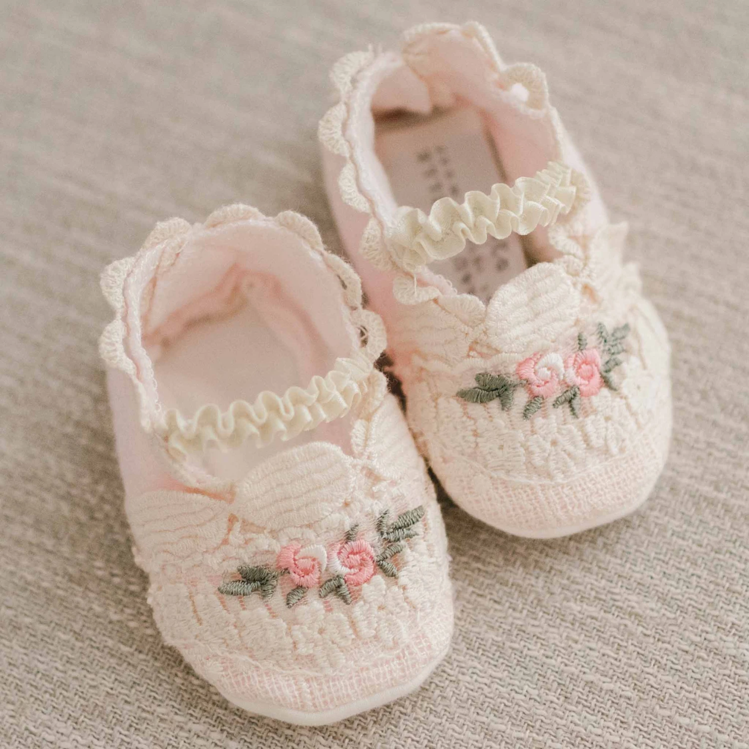 The Natalie booties are made with a beautiful pink cotton and a vintage natural cotton lace featuring embroidered pink rosettes and olive green leaf. Soft elastic makes for a perfect fit. Makes a great gift while completing her outfit.