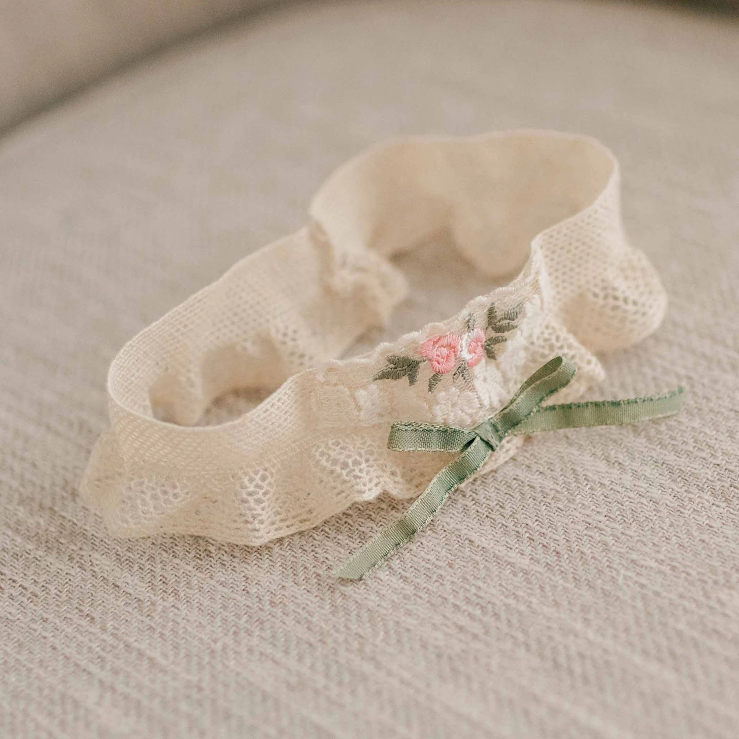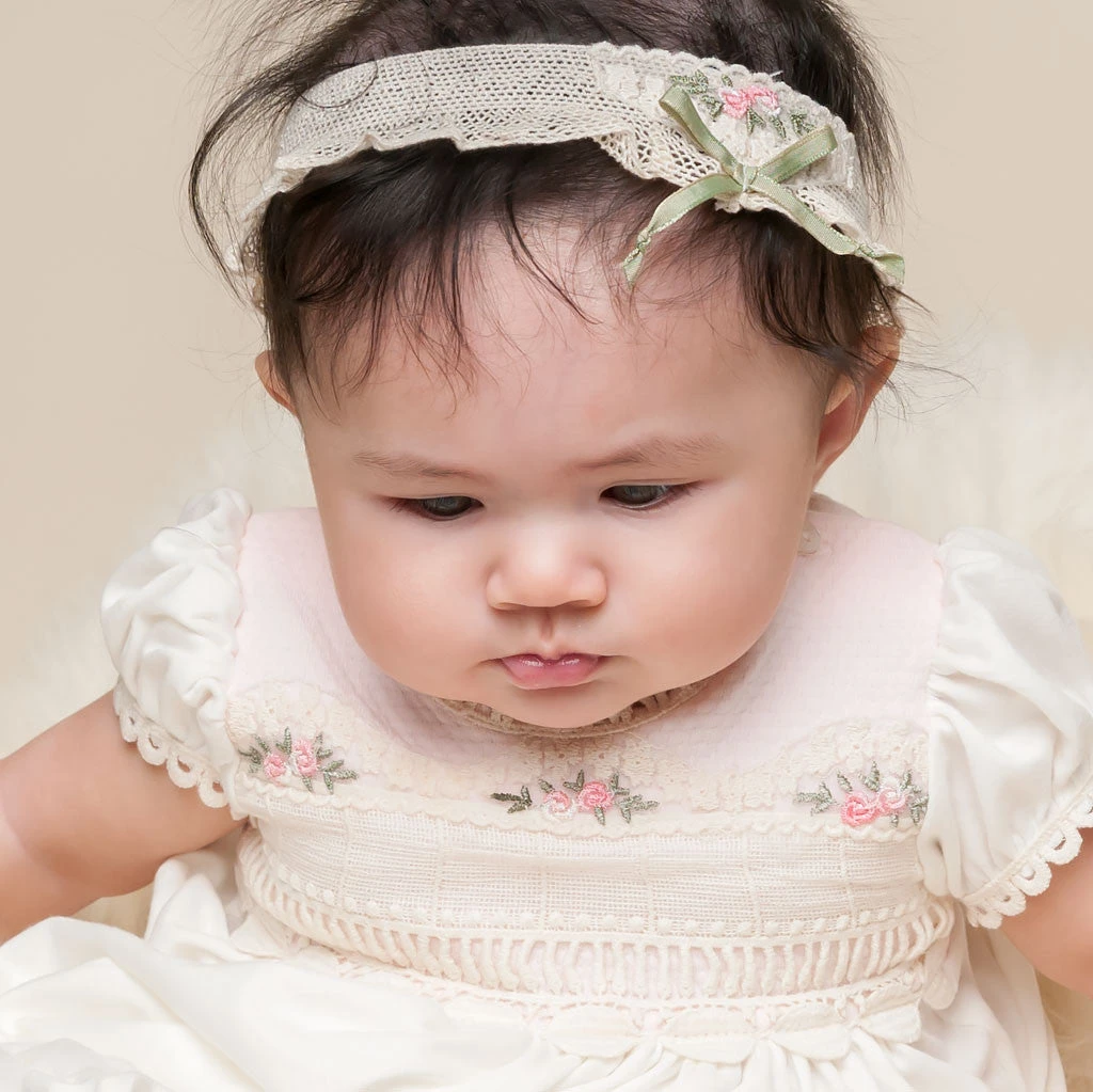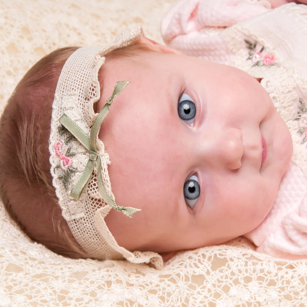 Such a cute headband! The Natalie headband is made with a beautiful cotton netting with a vintage natural cotton lace featuring embroidered pink rosettes and olive green leaf. Green ribbon tie completes the look. Complete her Natalie outfit with this beautiful headband.