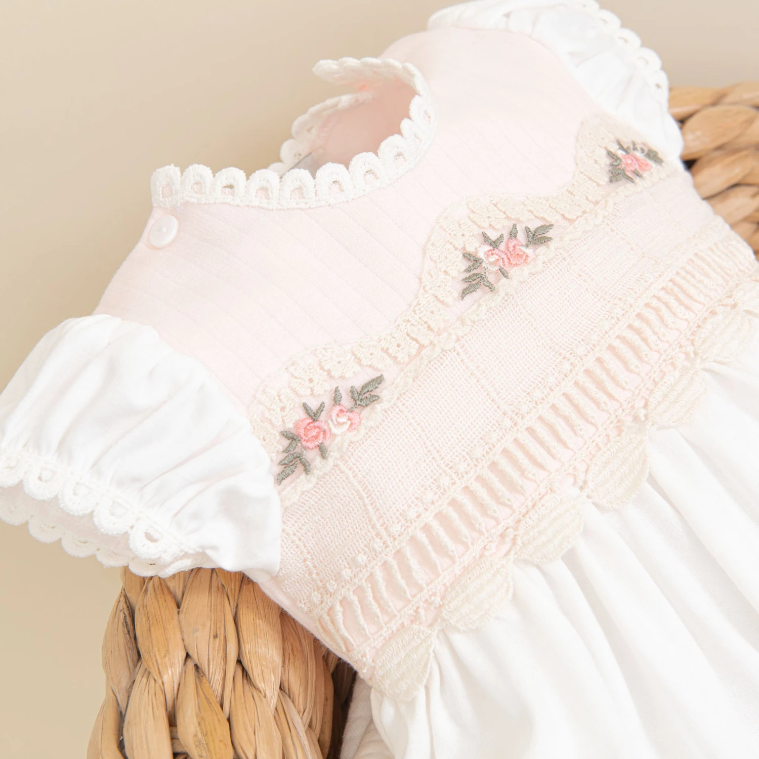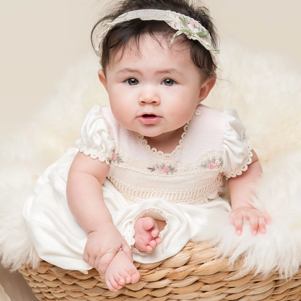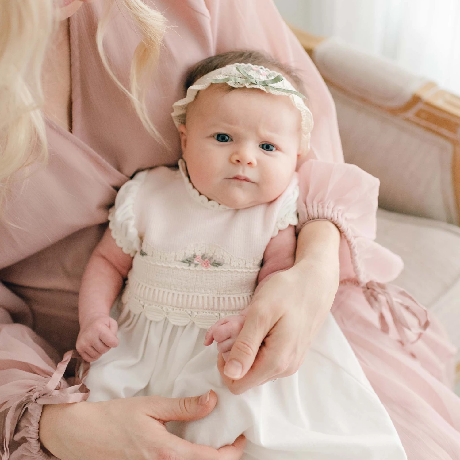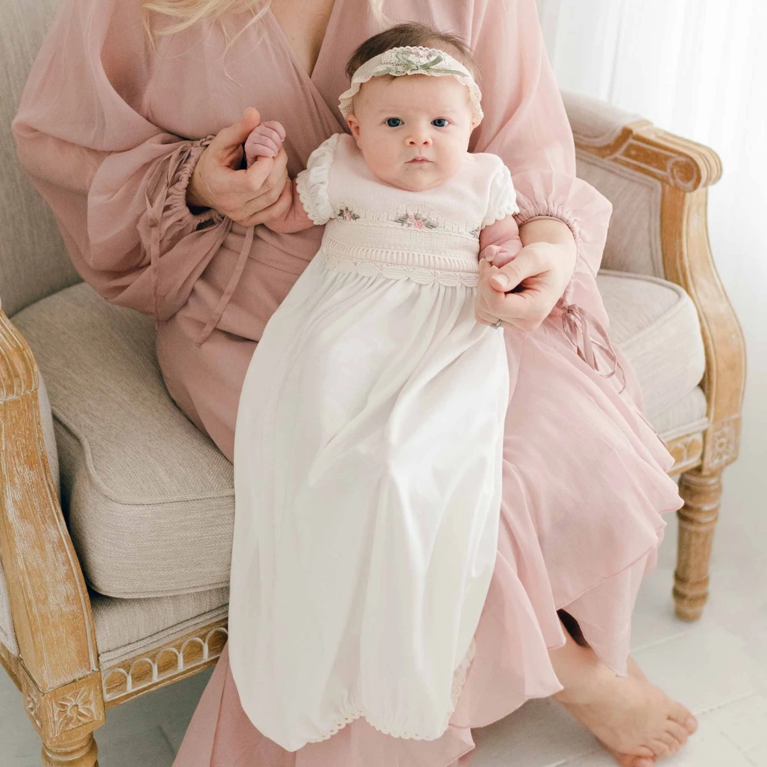 This elegant layette is made with ivory pima cotton and pink “super soft” Supima textured cotton bodice with a vintage natural cotton lace featuring embroidered pink rosettes and olive green leaf, summarys on shoulders make it easy to get on and off. The perfect coming home outfit or boutique heirloom for your special occasion. Also includes the matching Natalie headband for the perfect set!