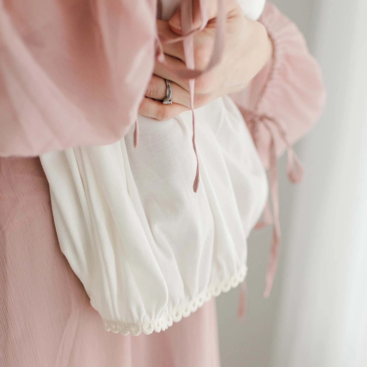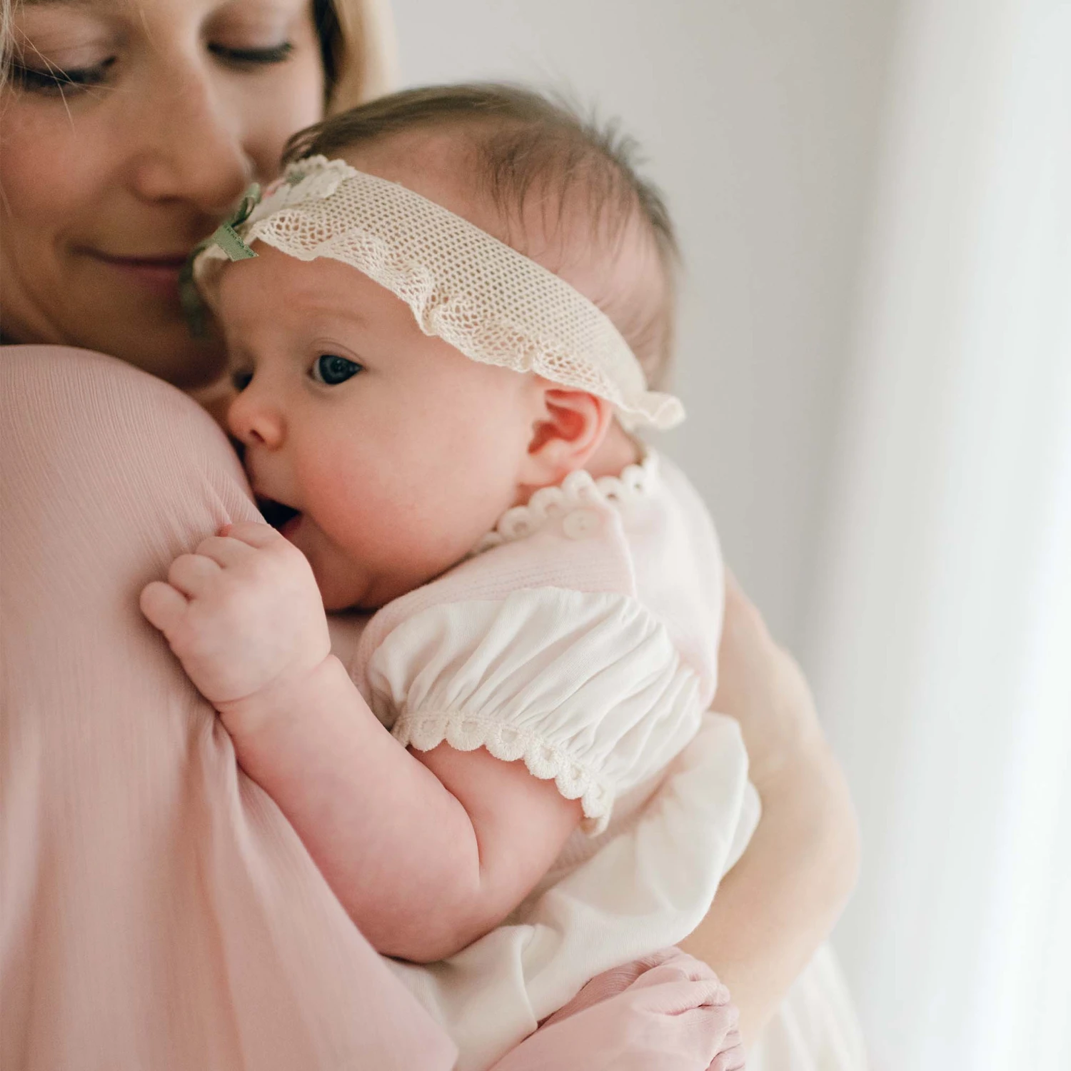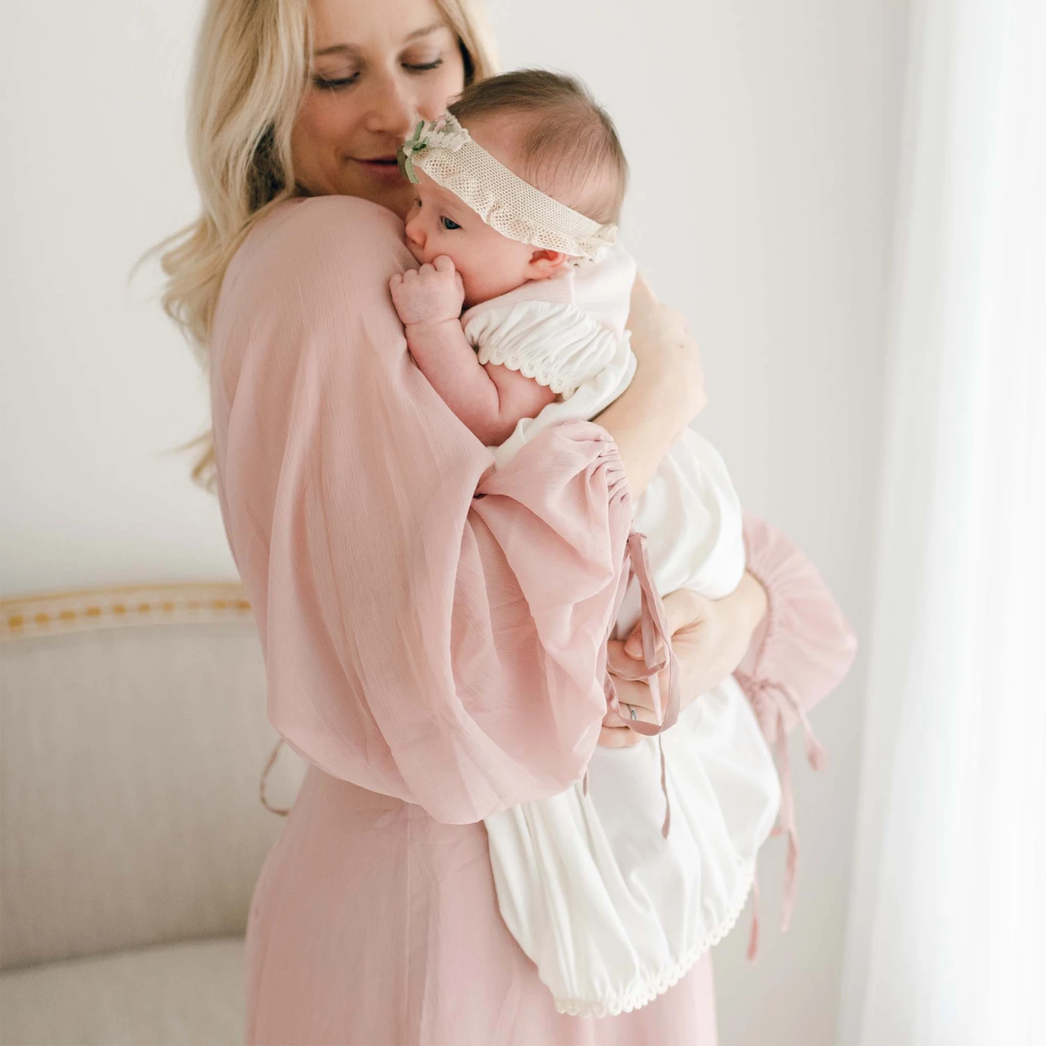 This elegant layette is made with ivory pima cotton and pink “super soft” Supima textured cotton bodice with a vintage natural cotton lace featuring embroidered pink rosettes and olive green leaf, summarys on shoulders make it easy to get on and off. The perfect coming home outfit or boutique heirloom for your special occasion. Also includes the matching Natalie headband for the perfect set!