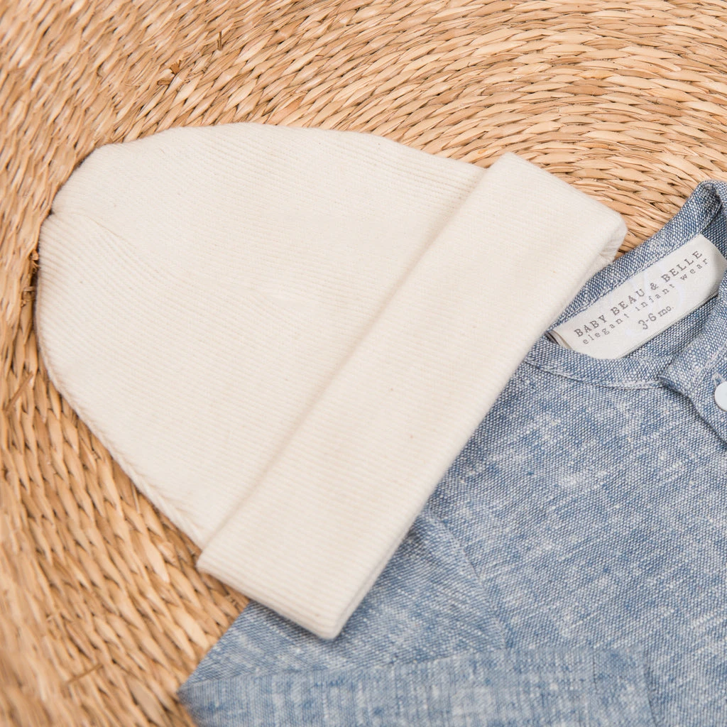 Cute and cozy, this beanie made in our super soft ribbed textured beanie in natural ivory is the perfect pairing with the matching top and leggings, and is a lovely accessory with any of our new linen styles!