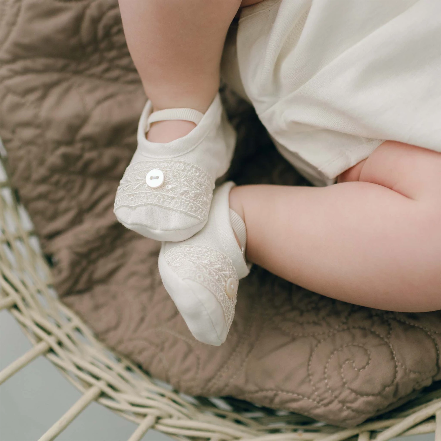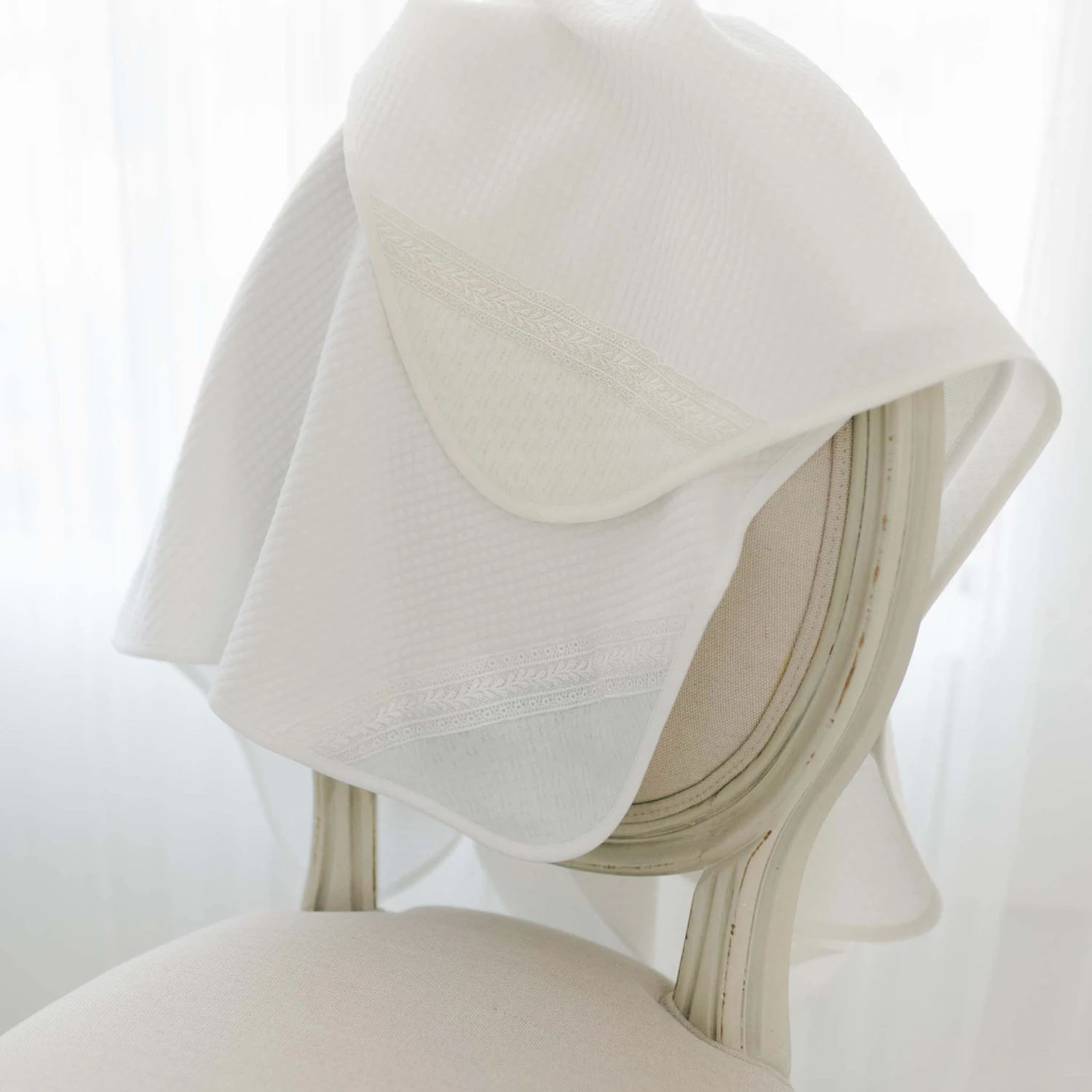 All the pieces needed to complete your Oliver baby boys romper are available here in this convenient package at a discounted price. This accessory set includes his matching linen cap and linen booties so he has a tailored look from head to toe. It also includes the Oliver quilted bib to protect his blessing clothes from messes, and his personalized quilted blanket with his name embroidered on the corner for a special baby gift he will cherish for years, whether his ensemble is used for a baptism outfit, blessing outfit for baby boy, or first birthday outfit. Save 15% over purchasing these pieces separately.