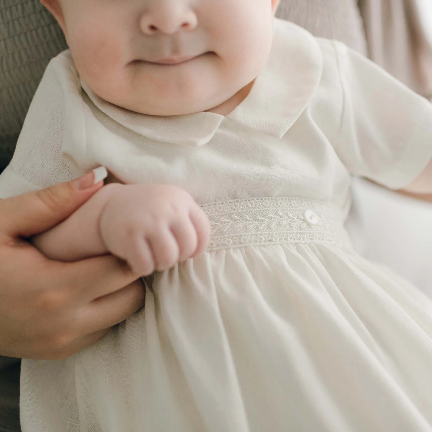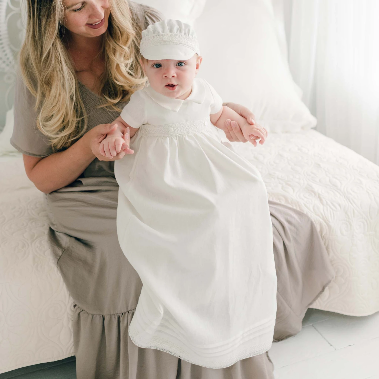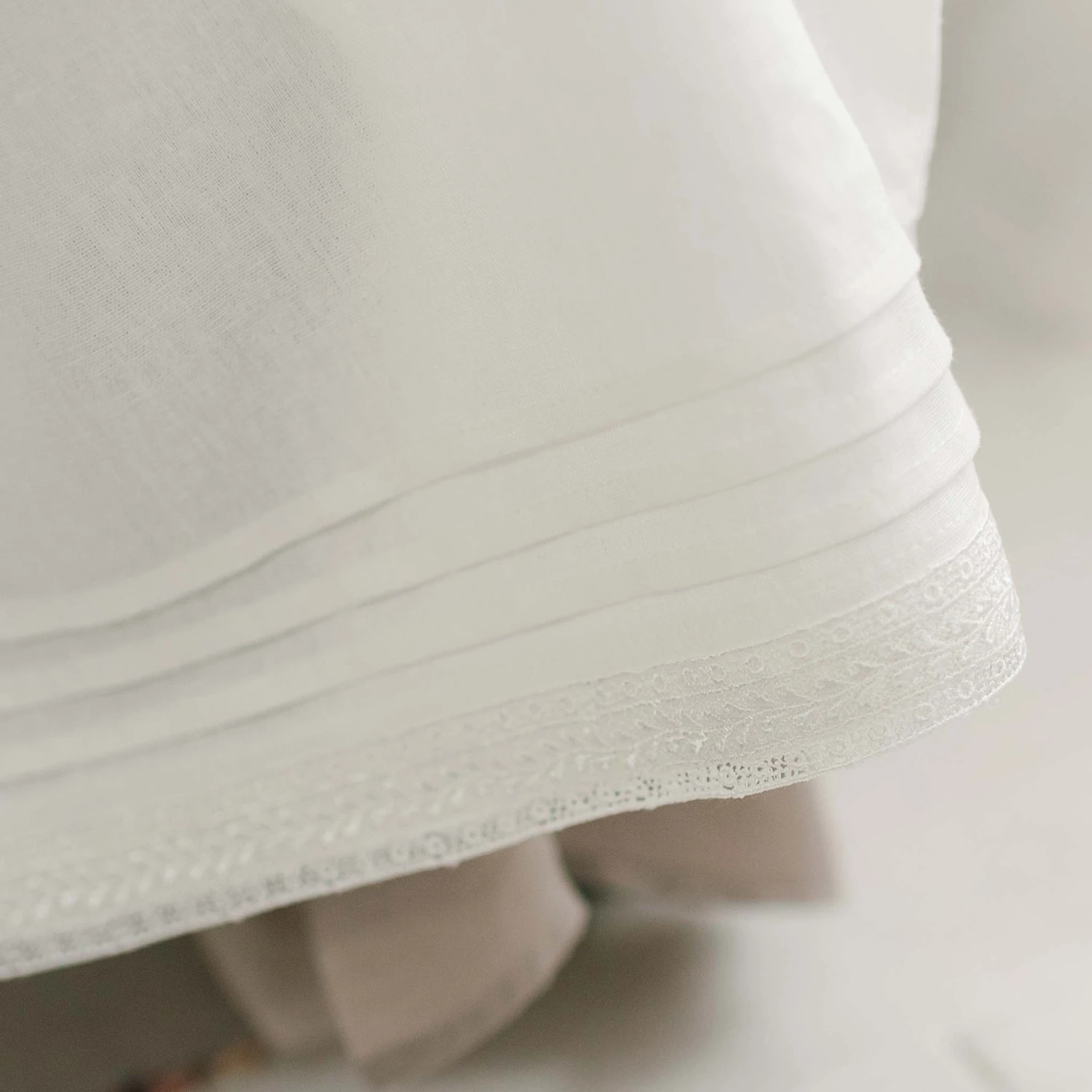 A unique convertible baptism gown for boys. The Oliver baby romper is cute on its own, made with the finest linen and detailed with Venice lace adding to the elegant design. The Oliver convertible skirt is crafted with same lovely linen as the romper, and is designed to easily attach to the Oliver romper with an elastic waist that turns his romper into a traditional christening gown. On the bottom of the skirt, three intricate pintucks add a special detail that adds to the heirloom baptism look. The perfect boys christening gown to use for his special day, and simply remove the skirt to wear the romper alone for a completely different look!