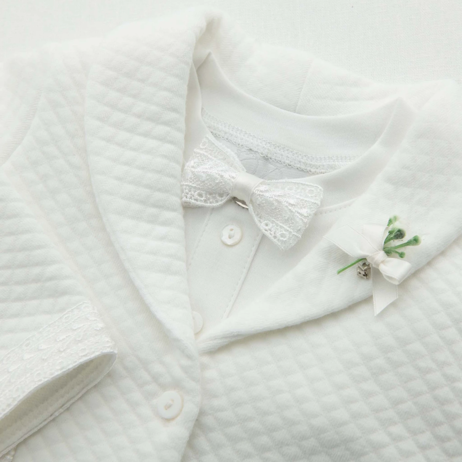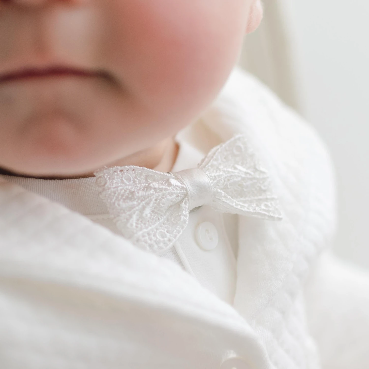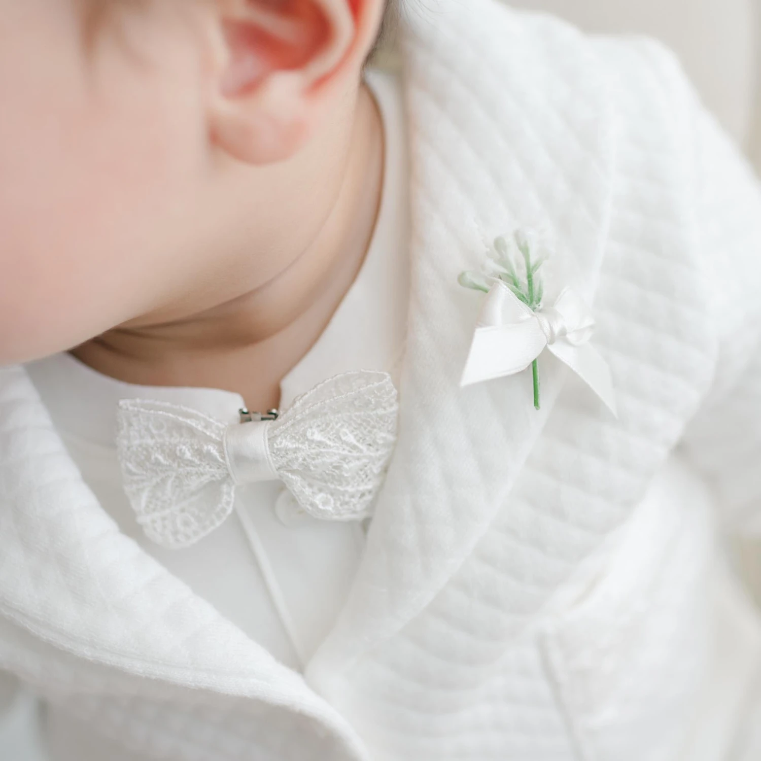 This darling lace bow tie and matching boutonniere are the perfect accompaniment for any outfit. Whether paired with an Oliver suit for a polished look, or added to an entirely different ensemble for a unique touch, these pieces are sure to add charm and class. The bow tie fastens with a small alligator clip and the boutonniere is securely held by a locking pin back. Ready to style and impress!