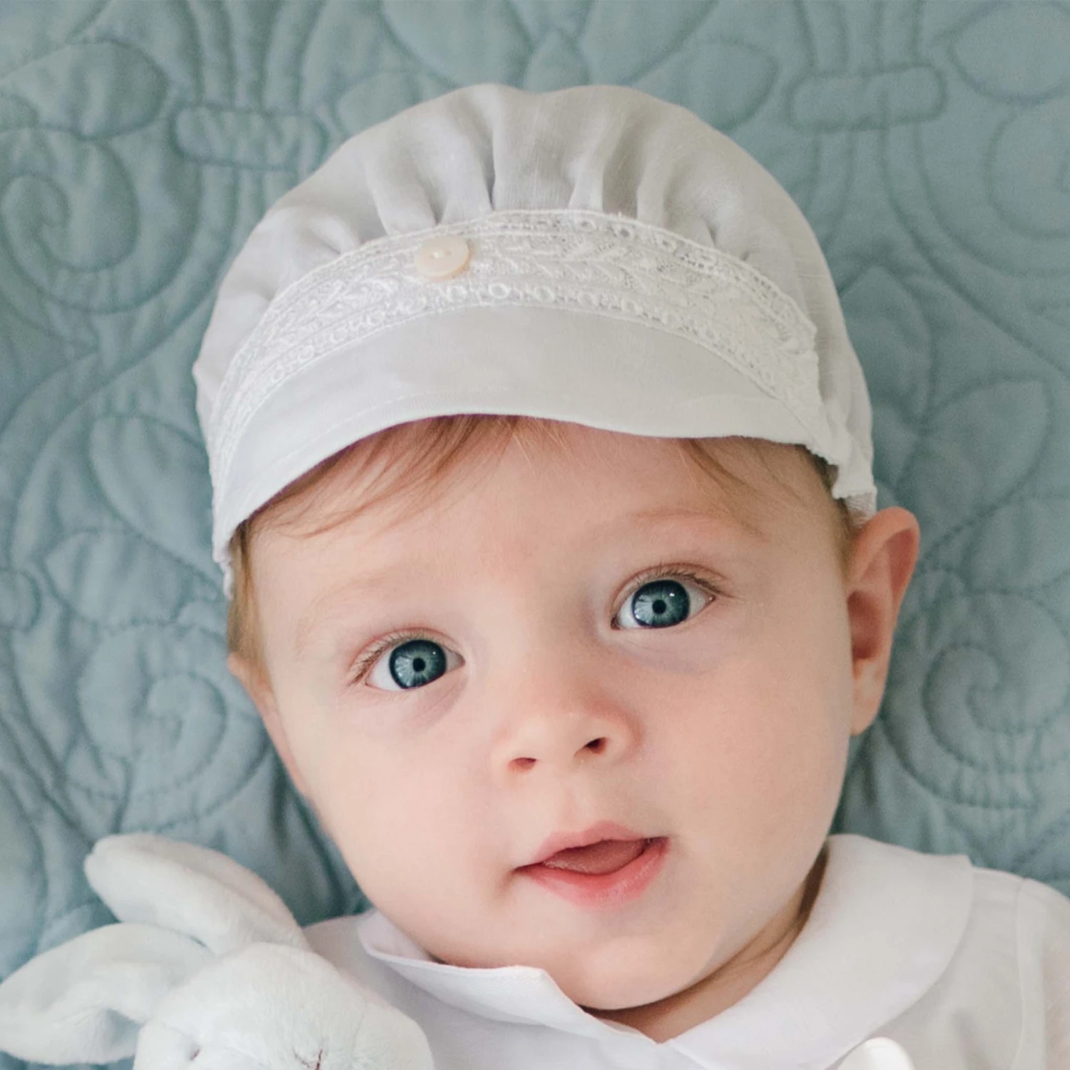 The Oliver linen hat is an elegant hat that will be the finishing touch to his Oliver bubble romper. Made with the same linen blend used to make the Oliver romper, this hat is a wonderful complement to his outfit. Featuring our elegant Venice lace across the front and a summary for added detail. The back half of the hat features a soft elastic to ensure a snug and comfortable fit to help his hat stay with ease throughout the day.