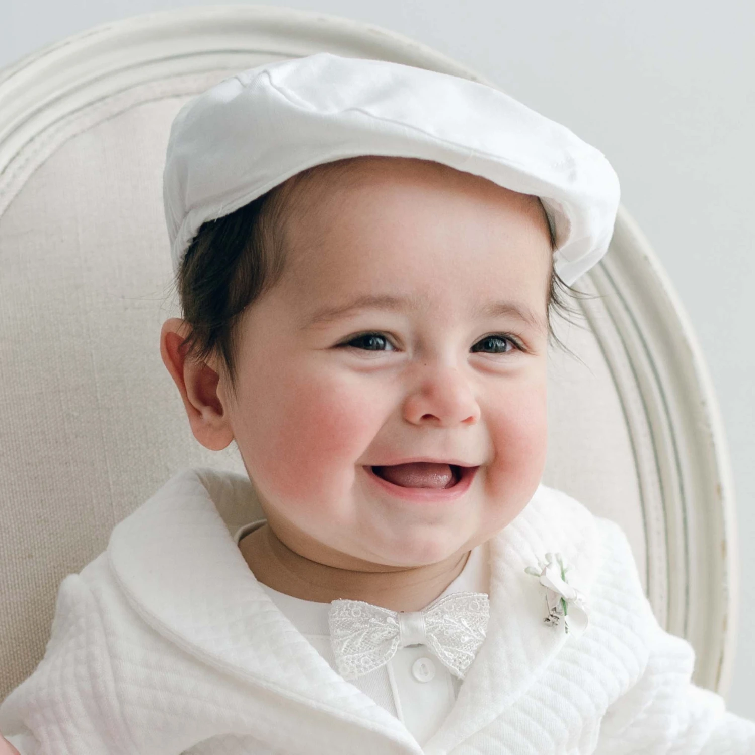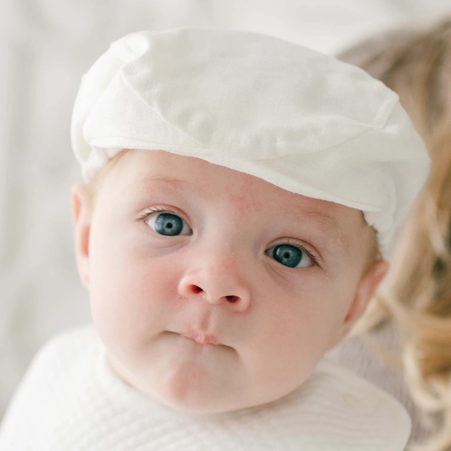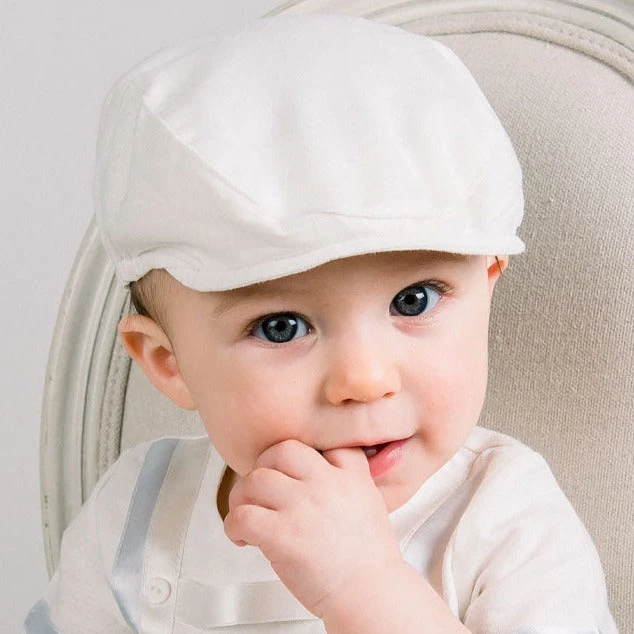 The perfect way to complete his Oliver Christening outfit! Using the same linen used to make the Oliver romper, this newsboy style hat is the perfect match to wear for his very special day. Fully lined and featuring a soft elastic band around the back half to ensure a snug and comfortable fit that he will be able to wear all day.