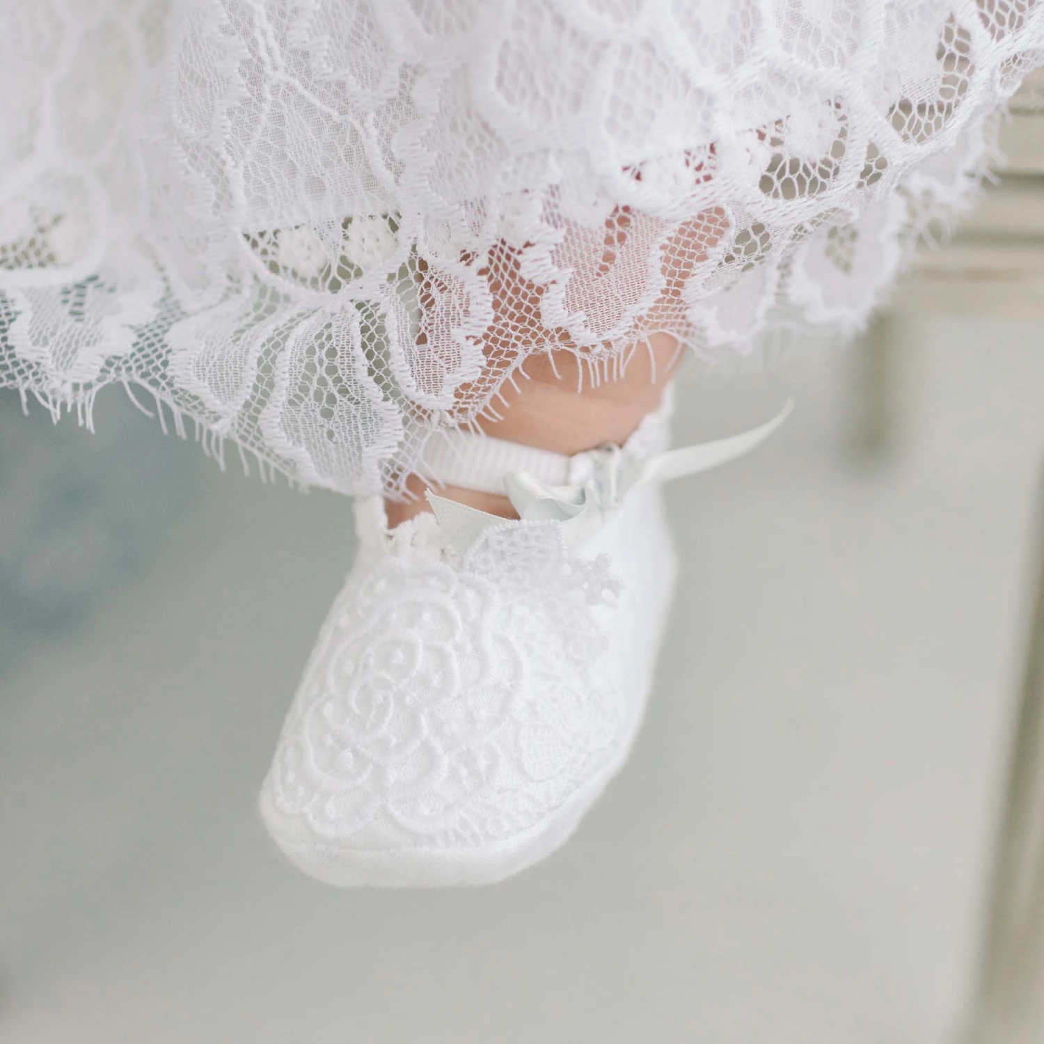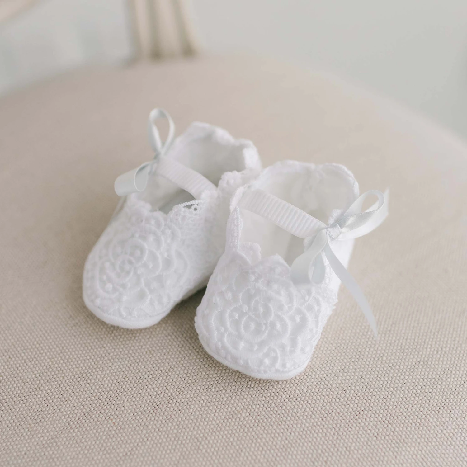 The Olivia Booties are handmade with a soft quilted cotton in white, perfect for the little feet that will be wearing them. Detailed with a beautiful white floral lace applique, and pale blue silk ribbons bows are the perfect accent. A soft white elastic lace strap help to keep her booties in place throughout the day. A lovely match to her Olivia Gown or Dress!