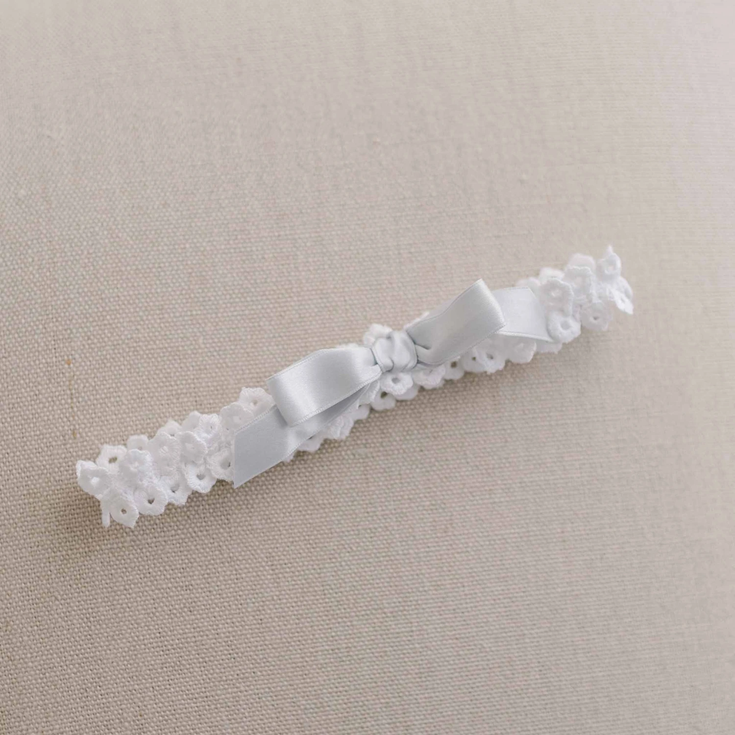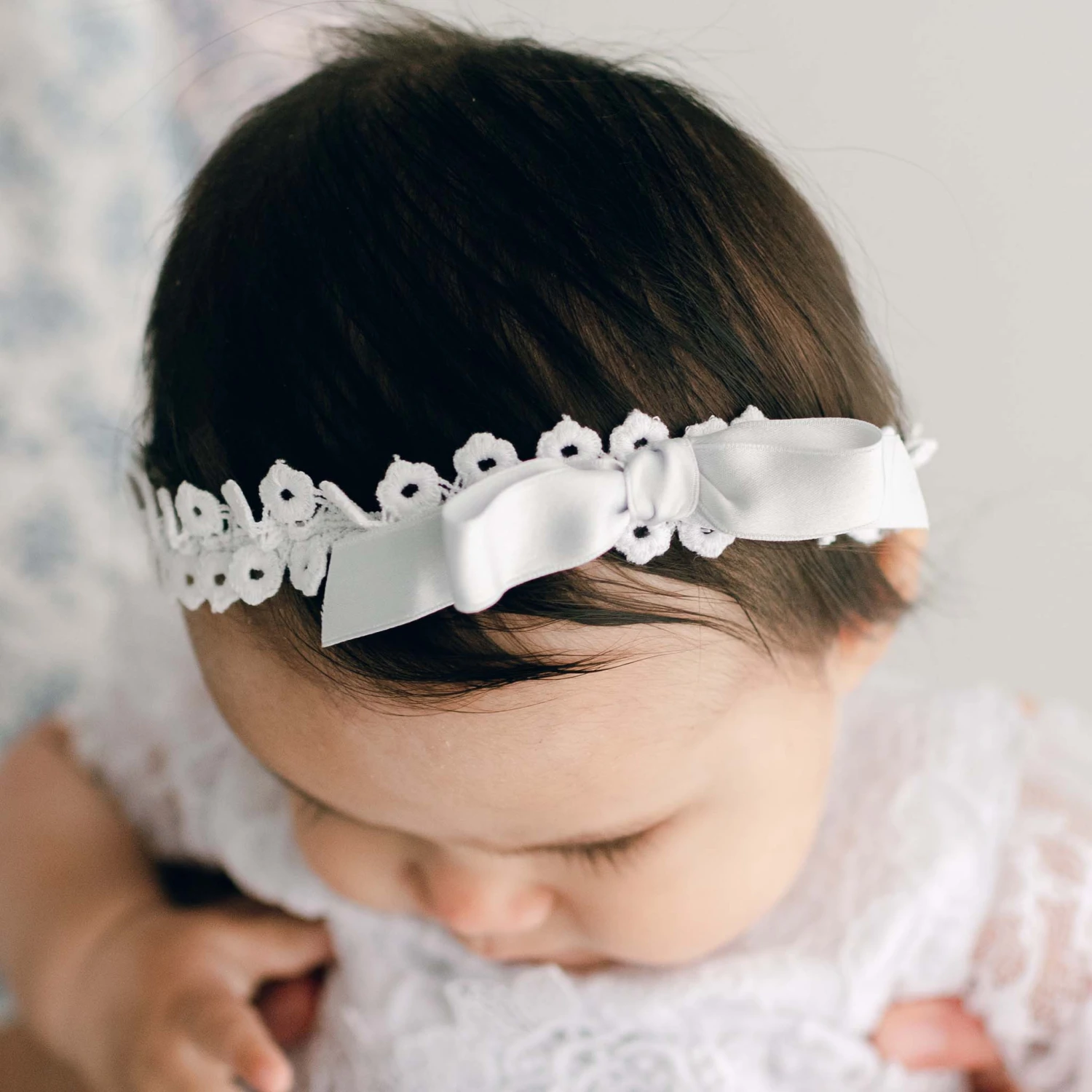 This beautiful headband is the perfect match to her Olive gown and dress. A soft, cotton lace in White with elastic for a perfect fit is topped with a gorgeous pale blue silk ribbon bow. Also makes a great gift that can match to any outfit.