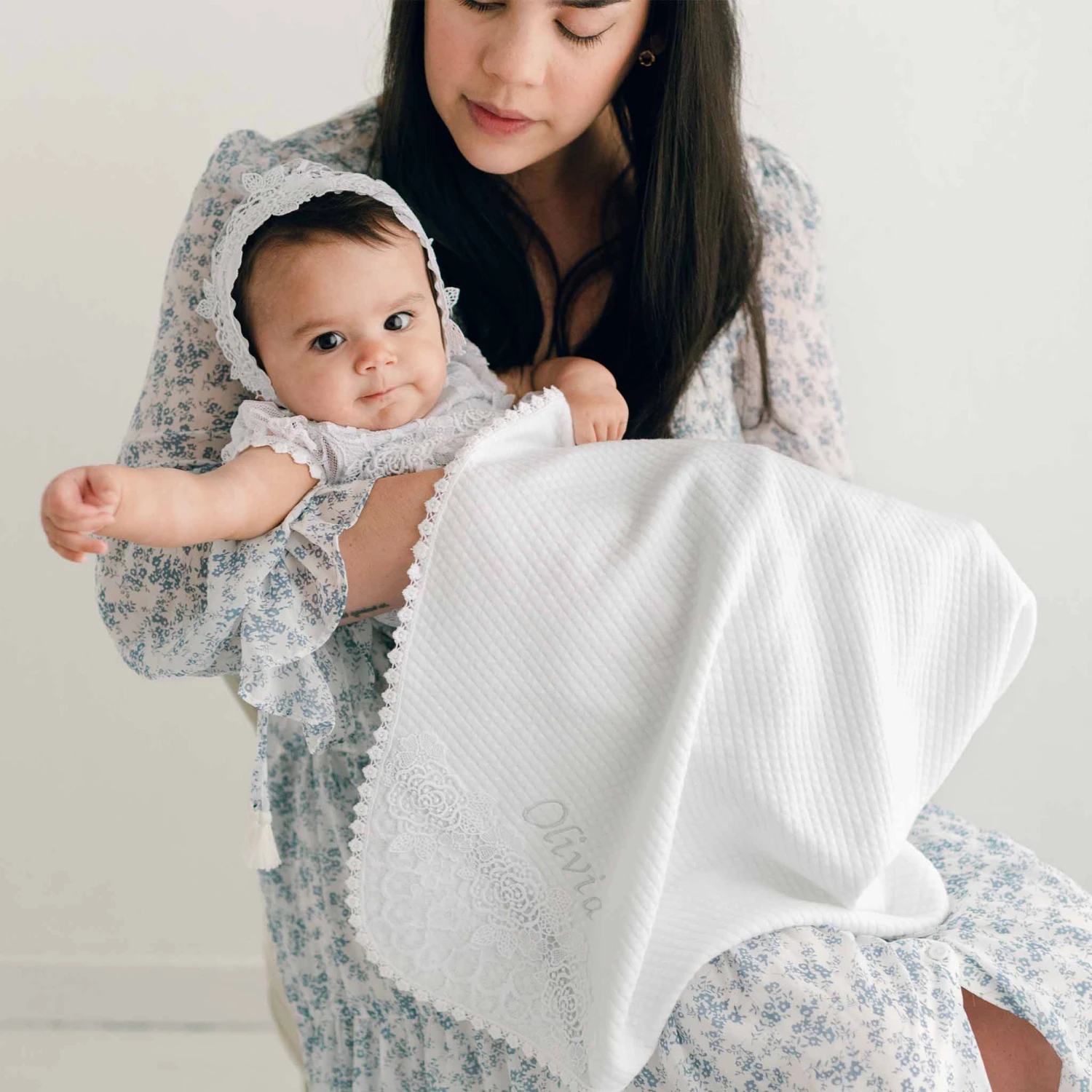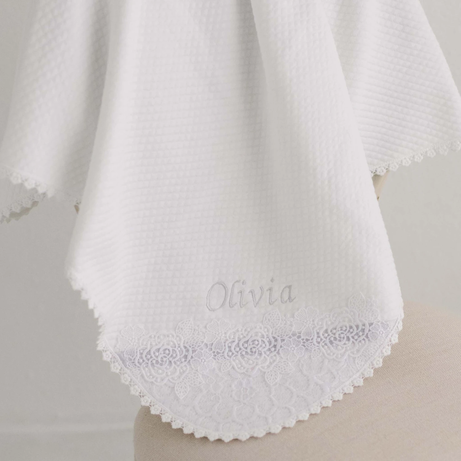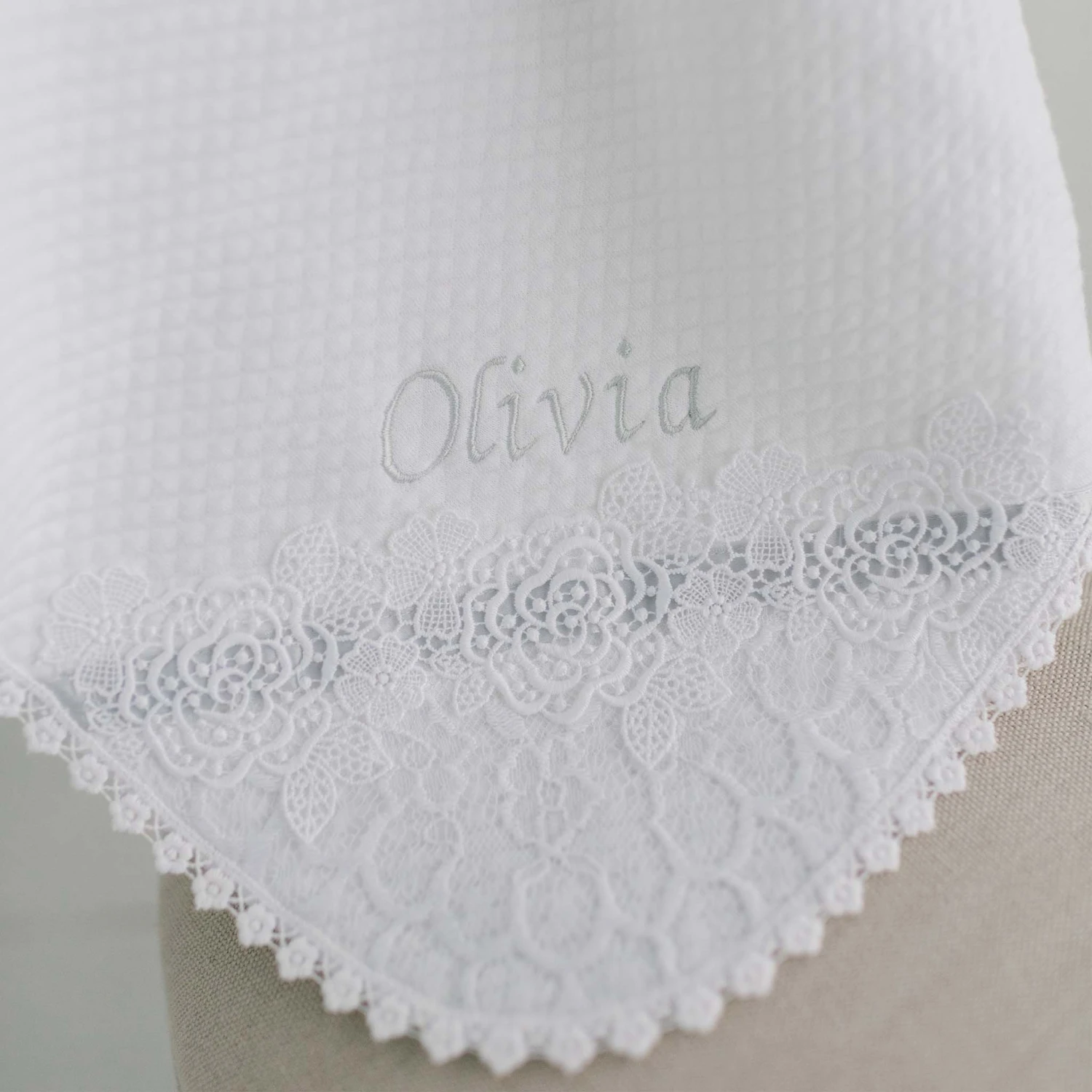 A soft and simple Christening Blanket to complement her Olivia Christening Set! The Olivia blanket is made from our softest cotton, a lovely 100% cotton with a plush quilted texture in white that makes it perfect for her to snuggle up to. Our floral lace is featured around the edges and matching Olivia lace and pale blue silk ribbon on one corner for the perfect designer touch are a beautiful complement to the floral lace on her dress. Optional embroidery to add her name for a personalized touch that will make this blanket a true heirloom piece.