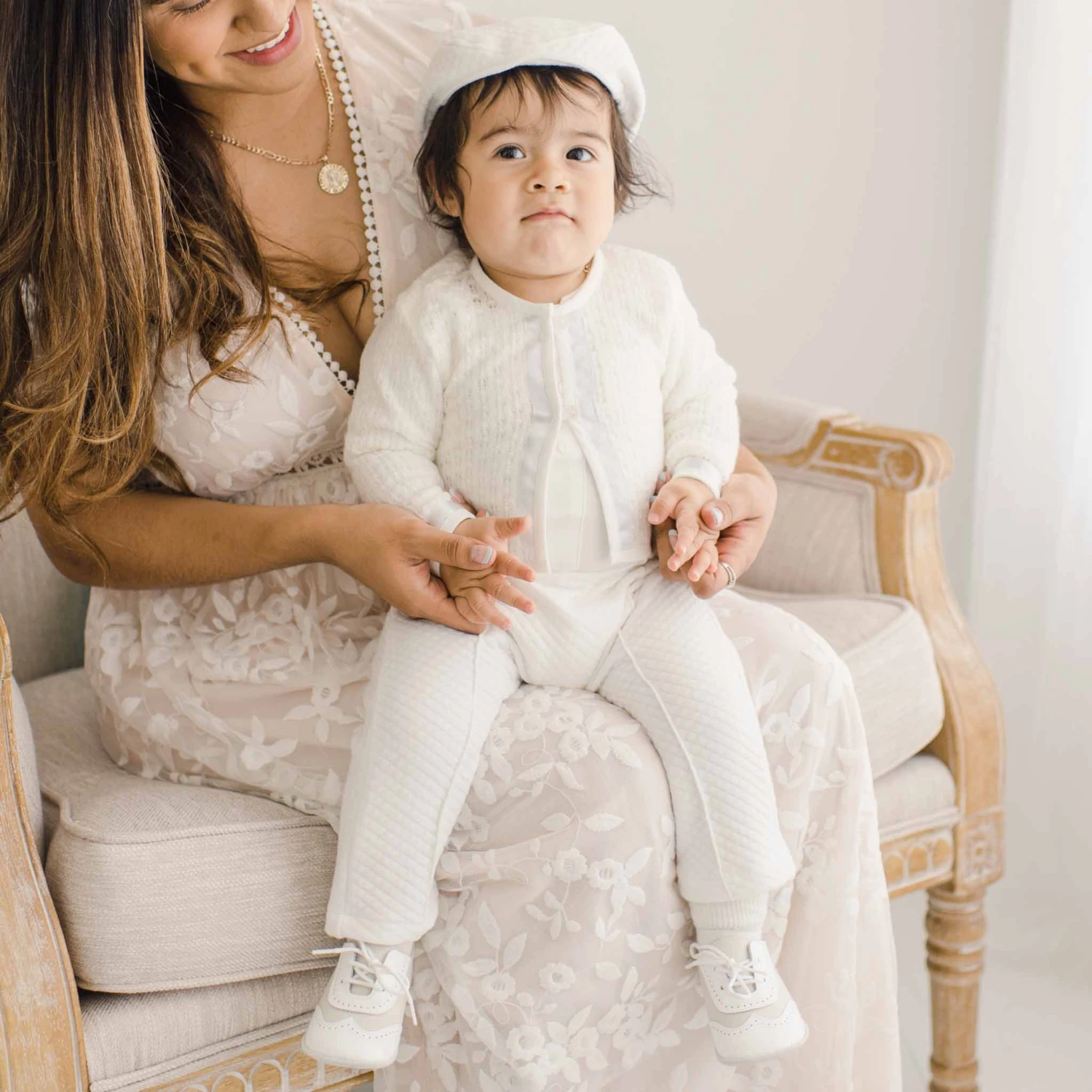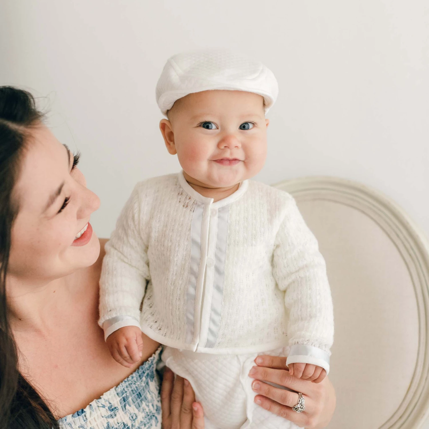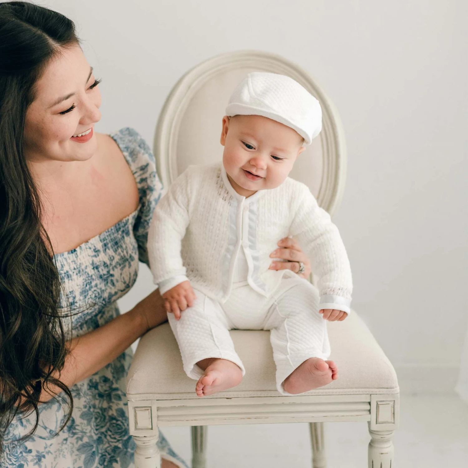 Designer styling and heirloom quality, this very inspired baby boy suit has been created with ivory quilted cotton pants with pleated detail and soft elastic waist. Ideal for any special occasion that calls for baby boy dress clothes. Pants should fall mid-calf to ankle length depending on his height. The shirt is made from luxuriously soft ivory cotton. The sweater is made with soft ivory knit and blue silk ribbon trim. The perfect baby boy suit to ensure your little dude is handsome and comfortable all day long.