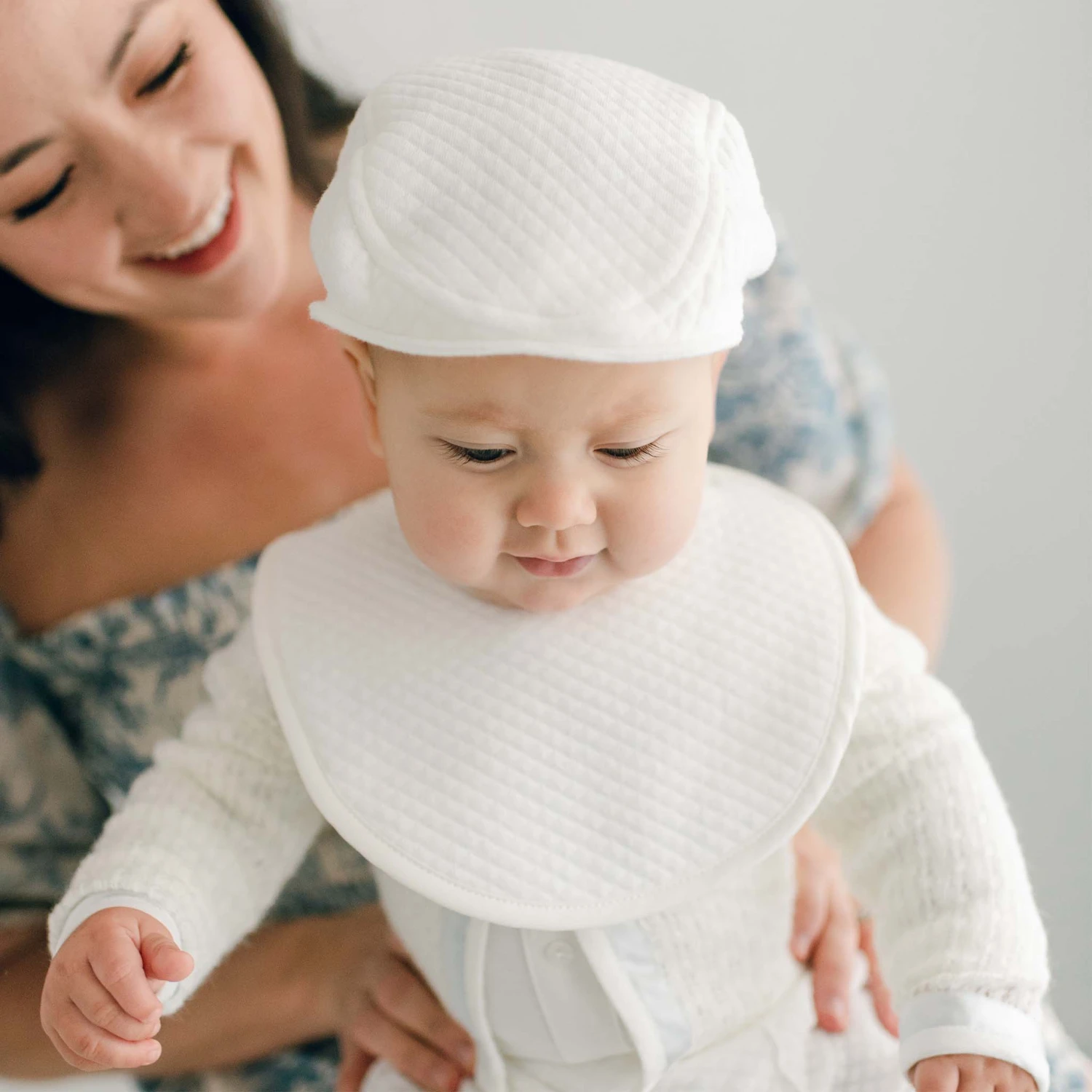 Just in case! Made with a very soft 100% ivory Supima quilted cotton with linen binding around the perimeter. Perfect to keep his outfit safe!
