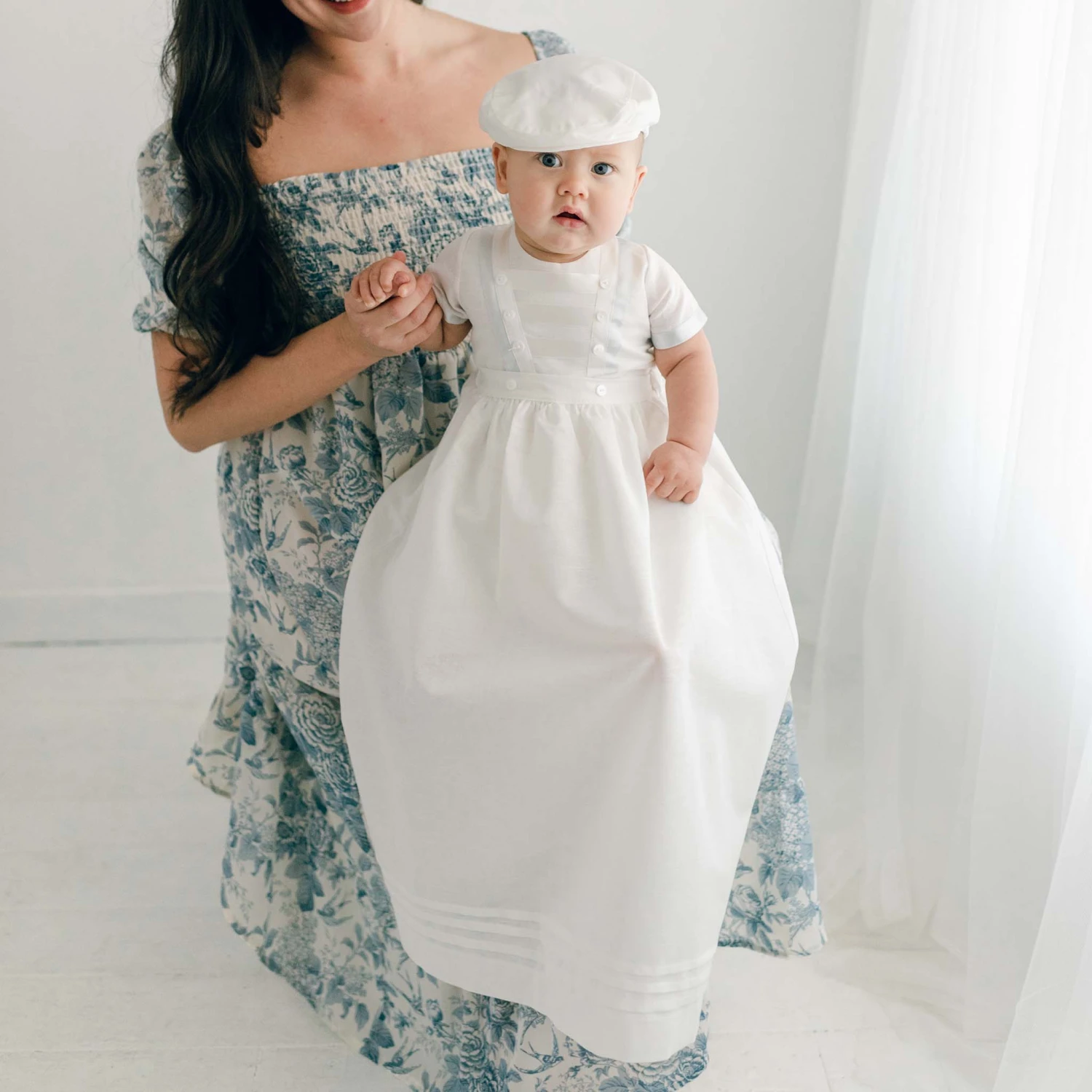 The Owen Convertible Set has been created with the finest linen in a lovely shade of light ivory. The skirt is designed to easily slip over the Owen romper with an elastic waist that creates a comfortable and secure fit to wear throughout the baptism ceremony. On the bottom of the skirt, three intricate pintucks add a special detail that adds to the heirloom christening look. The romper, designed to fall mid-calf to ankle length, is detailed with blue and ivory silk ribbon. The perfect addition to use for his special day and simply remove the skirt for his after party!