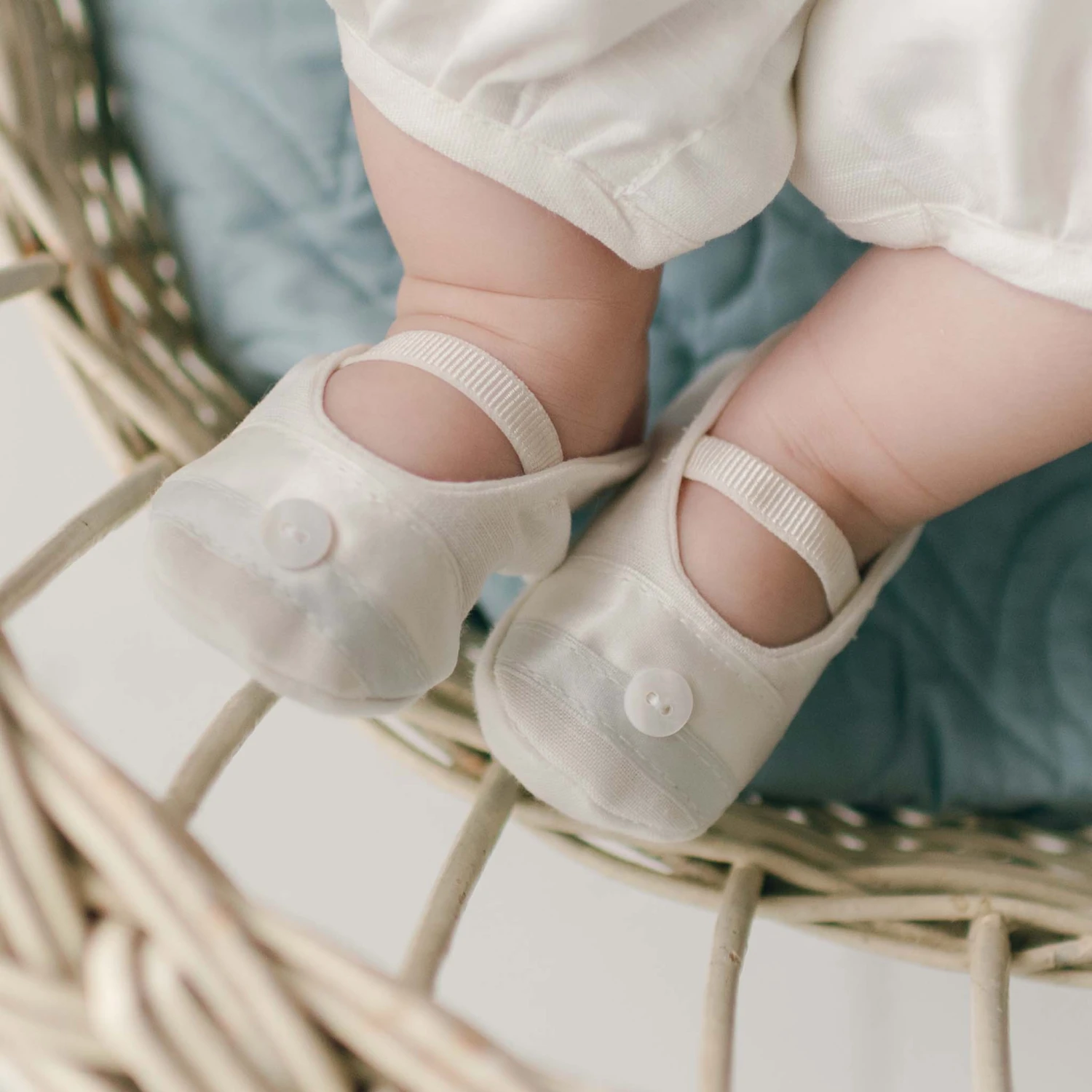 The Owen Booties are made with the same linen as the Owen jumpsuit in a beautiful shade of ivory. The bottoms are made with a soft cotton blend, adding to the comfort of the design. They are kept on with detailed elastic ribbon across the foot and embellished with blue silk ribbon and summarys. Absolutely princely!