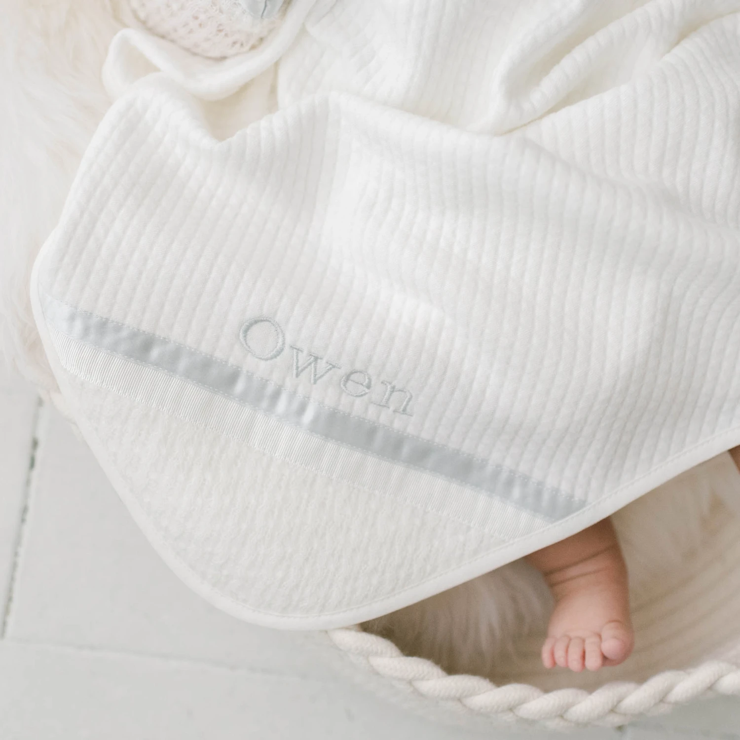 We’ve created this darling newborn set from our Owen collection that would make a handsome baby shower gift or for your little boys’s special take me home outfit! The set features our Owen Newborn Gown – made with soft pima cotton in ivory, and features a plush ivory quilt bodice that was selected with baby’s comfort in mind. The ivory grosgrain and blue silk ribbon accent along the bodice adds a subtle special detail. This classic baby gown is as stylish as it is functional-the open skirt design keeps baby covered while also allowing easy diaper changes.