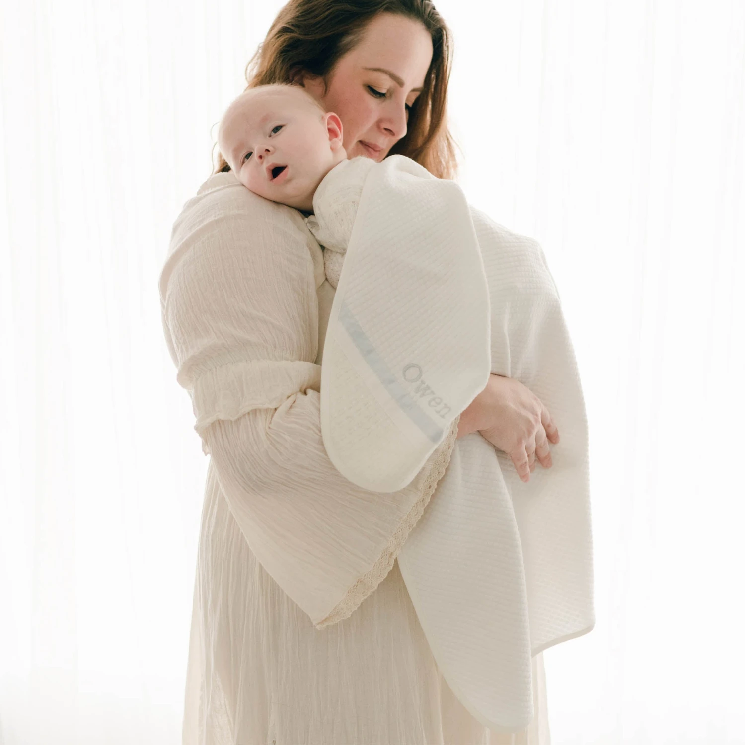 This receiving blanket will keep your little one very comfortable on his special day! Made with a very soft 100% ivory quilted cotton with an ivory linen edge. The corner features an ivory knit and ivory ribbon accent. A beautiful heirloom piece to add to his Christening outfit.