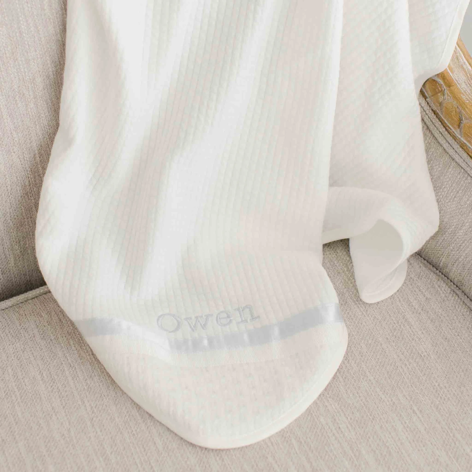 - Optional personalization in light blue thread