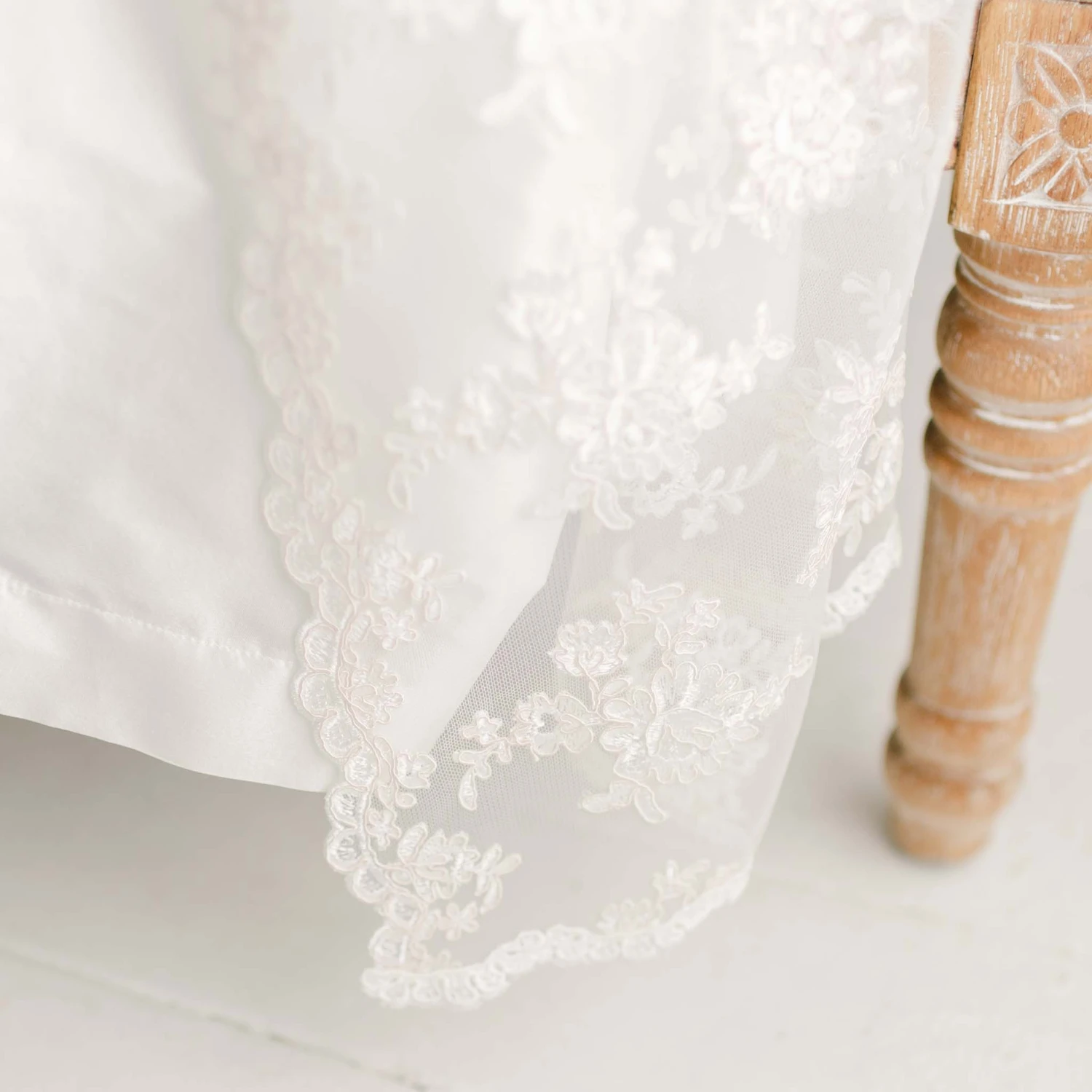 This girls Baptism gown is so gorgeous and so detailed, it’s not a stretch to say that it is truly a work of art. The lace overlay on this baptism gown is both stunning and special, made of embroidered netting with a rich floral design featuring embroidered flowers in a pretty shade of ivory with champagne cording, adding depth and richness. Trimmed in ivory Venice edging and long ivory silk ribbon bows flowing down the skirt. This beautiful gown can be passed down and appreciated for generations to come. Includes her matching sheer Penelope lace bonnet for a head to toe look. Pair with any of our Penelope accessories, including booties, headband, blanket, bib and sweater, to complete her Heirloom Christening Set.