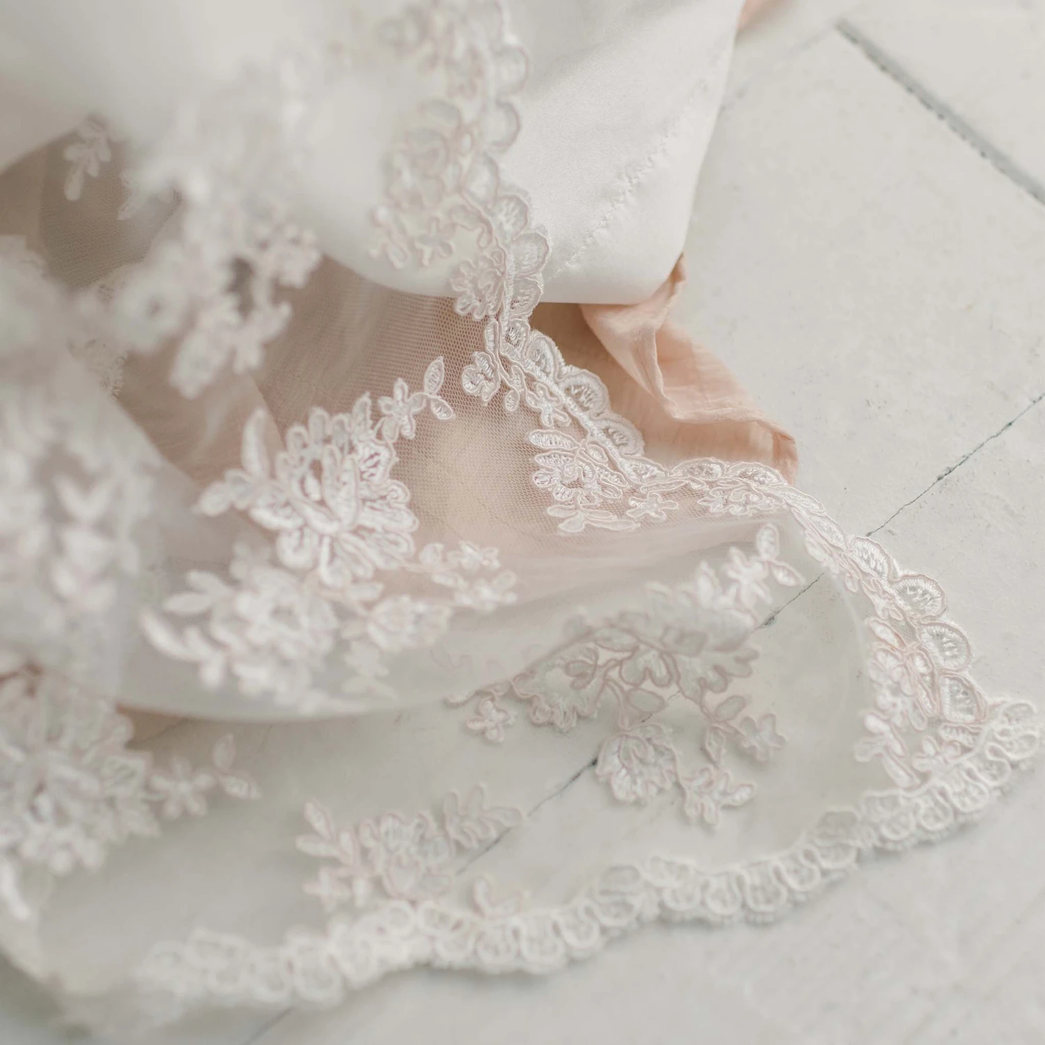 - Two-tone embroidered floral netting in ivory with champagne cording