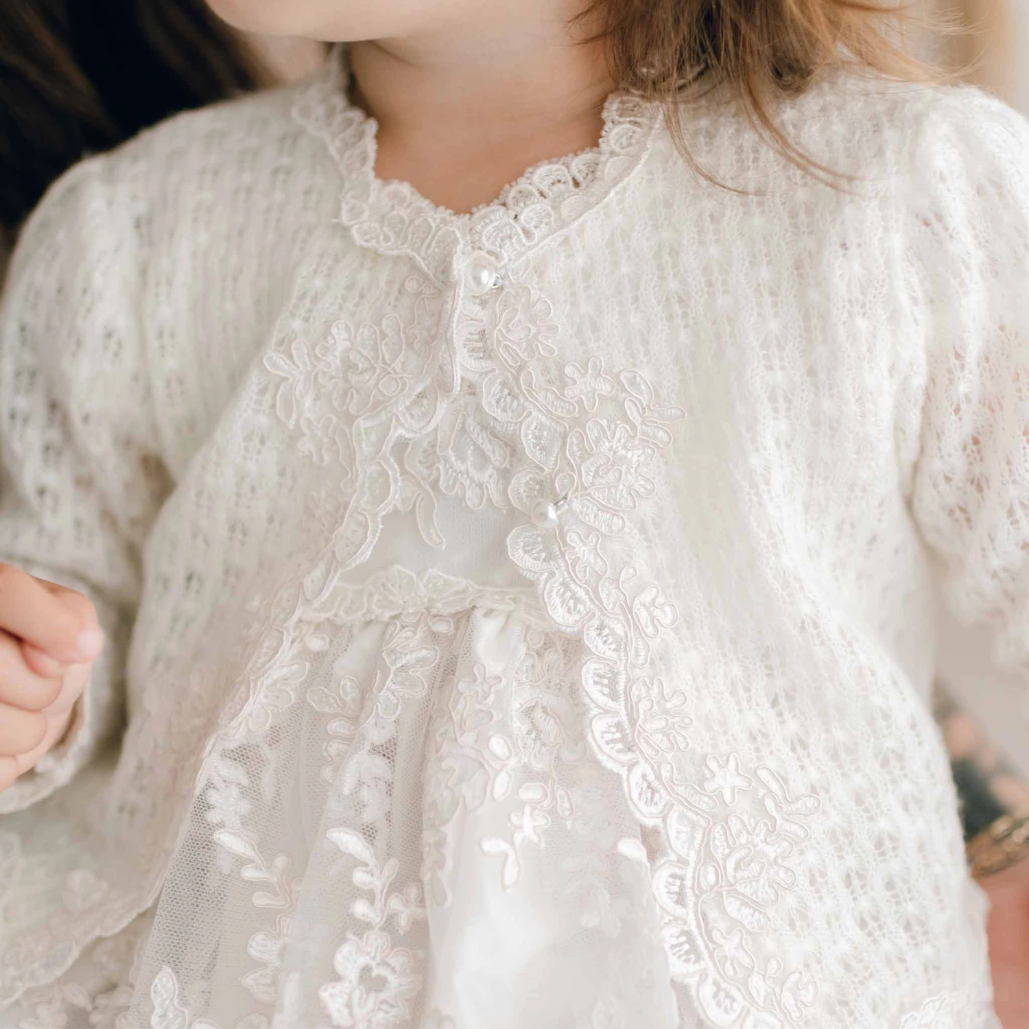 The Penelope Knit Sweater is a wonderful addition to your Penelope outfit. Made of 100% knit in ivory. Venice lace trim with floral embroidered lace and pearl style summarys. The bonnet also features Venice lace trim all the way around the edge. Soft elastic stretches for a comfortable fit for baby. Ivory silk ribbon ties are a beautiful extra touch. So special and pretty, perfect to keep her warm and it will look gorgeous with any outfit.