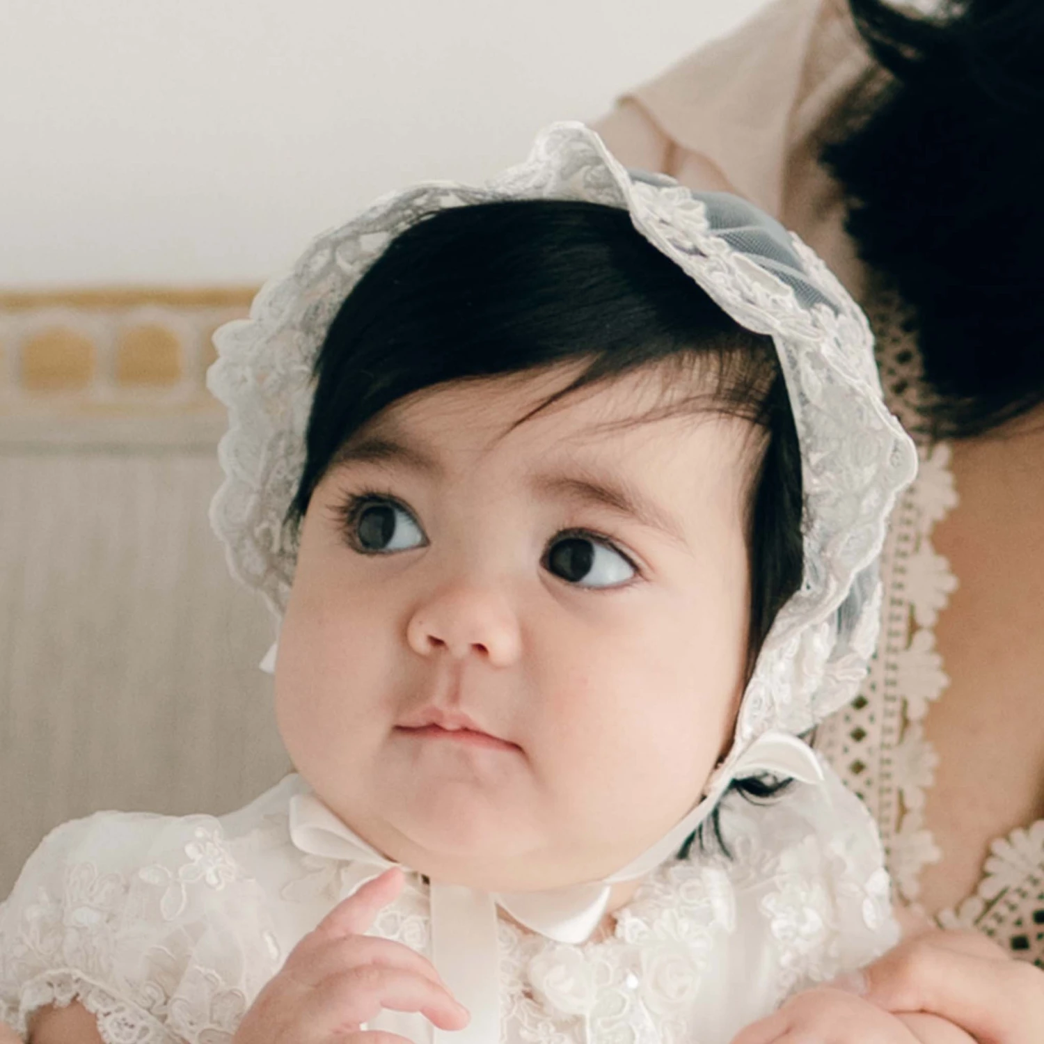 Made with our stunning Penelope lace, featuring embroidered netting with a gorgeous floral pattern in ivory and champagne. A soft elastic creates a darling ruffle to frame her sweet face and ivory silk ribbon ties to keep it secure. A perfect pairing with her Penelope dress!