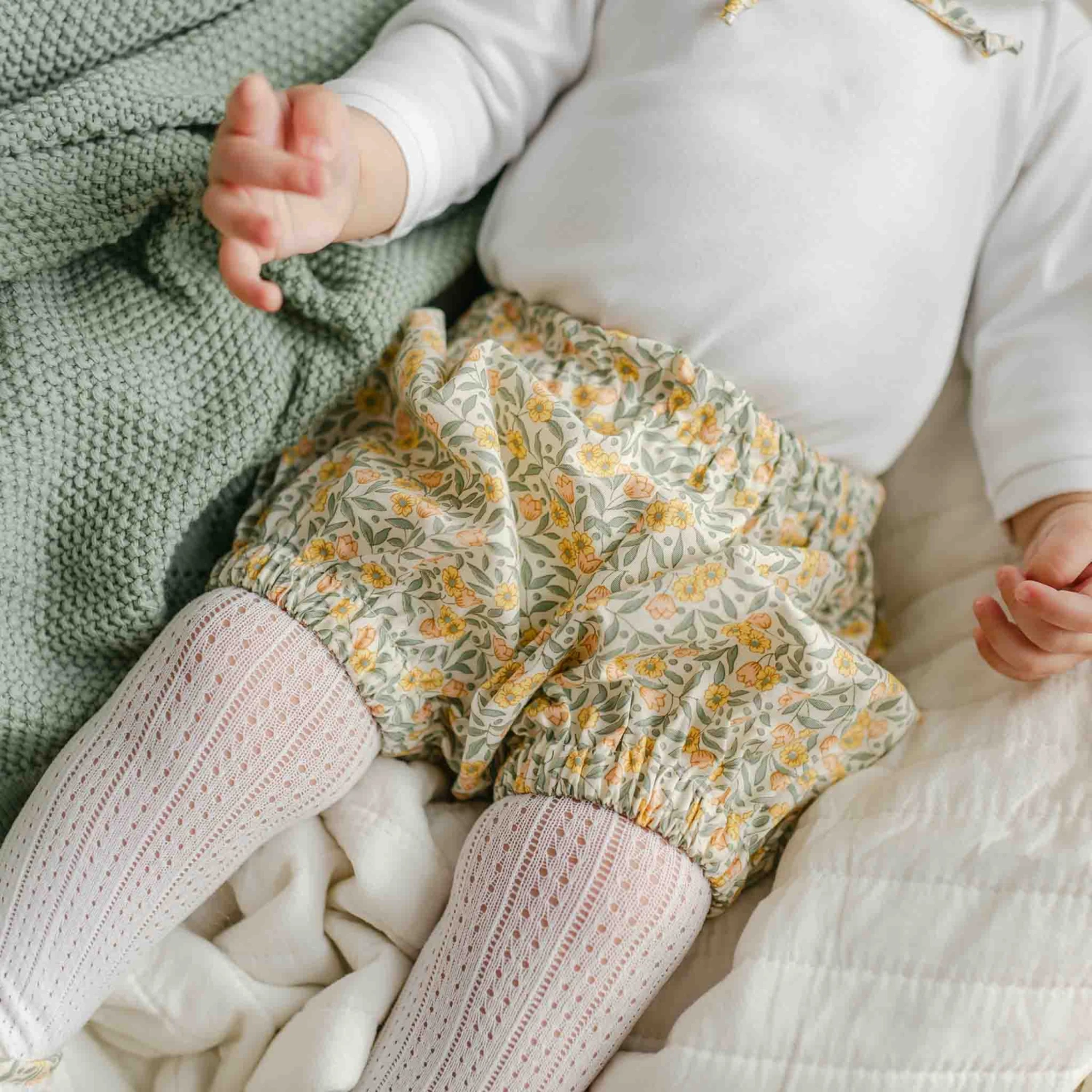 A cheery floral patterned bloomer and bodysuit set will be perfect for all her party needs! Adorable blue or yellow floral cotton bloomers, with soft elastic in the waist allows for an easy and comfortable fit. Set includes a rounded collar bodysuit and matching Petite Fleur skinny bow detail on the collar. Pair with her matching Petite Fleur bow or flower headband, booties or bonnet to complete her look!