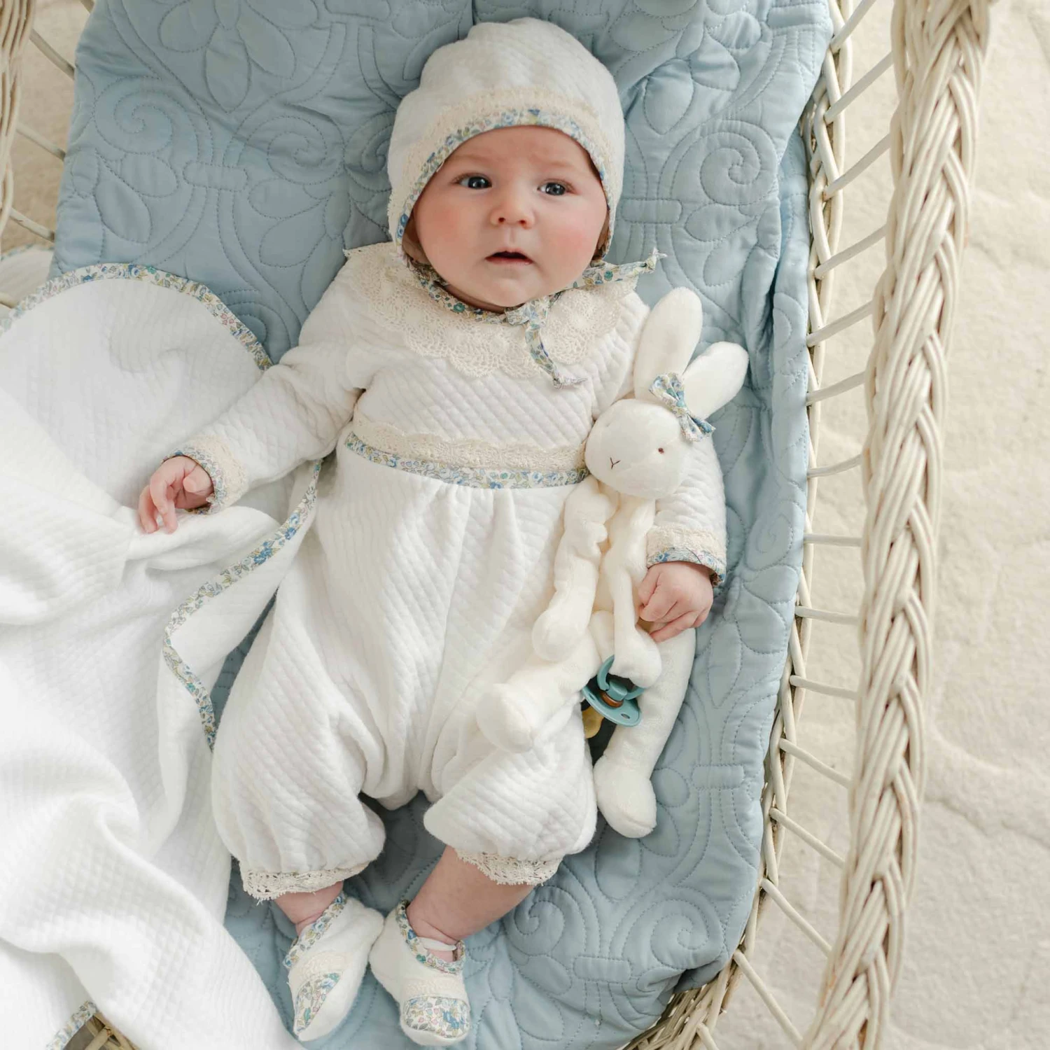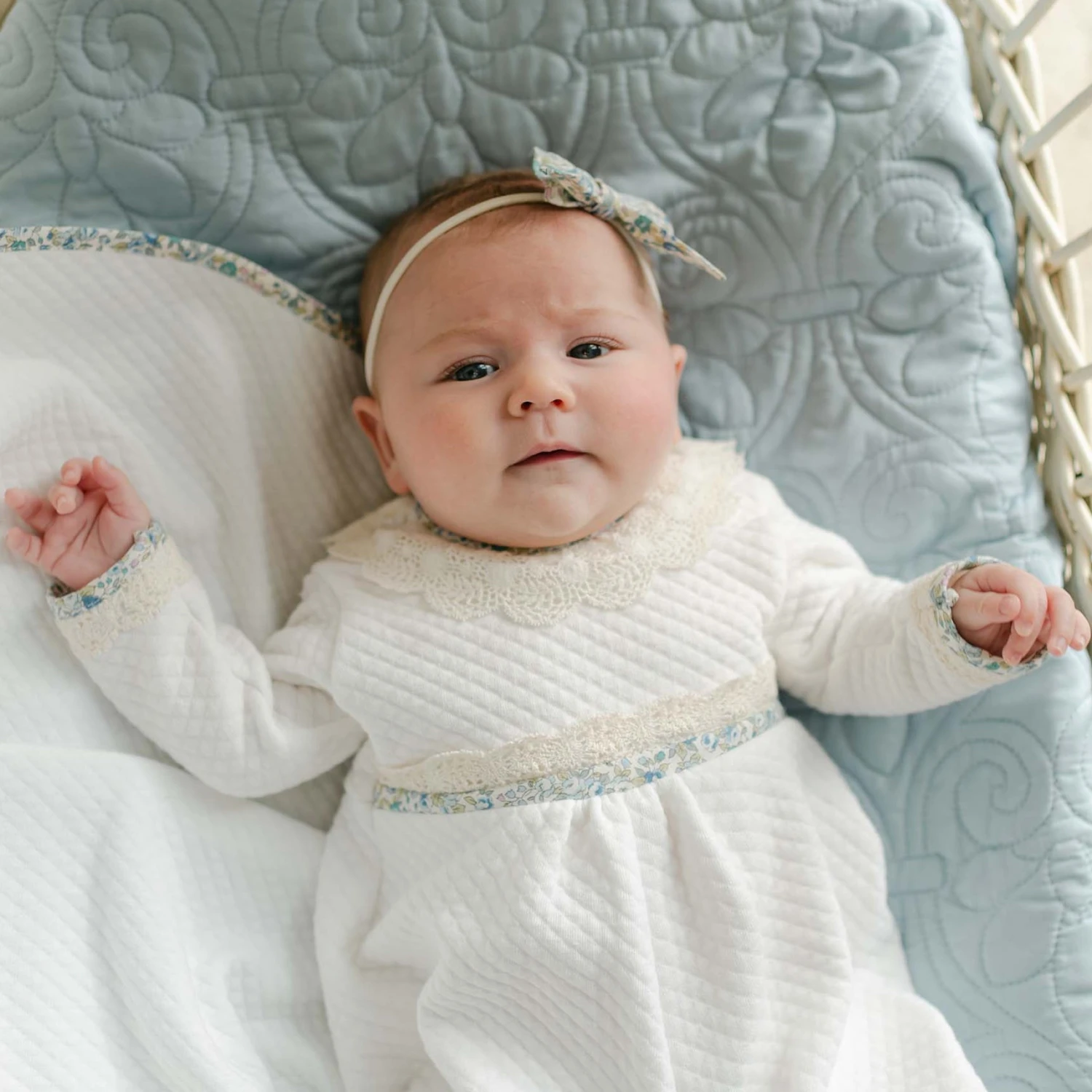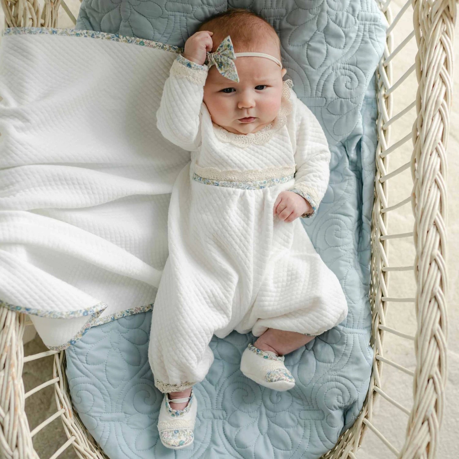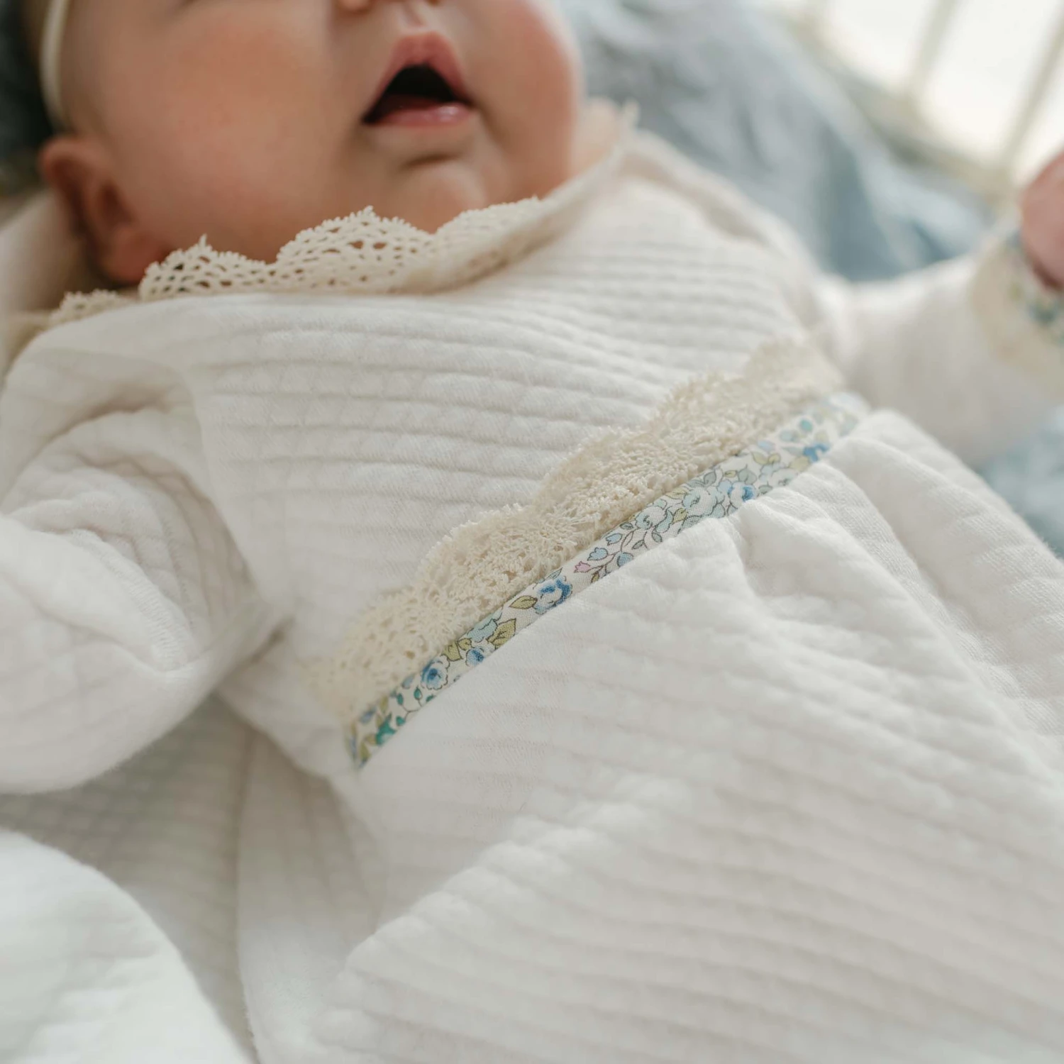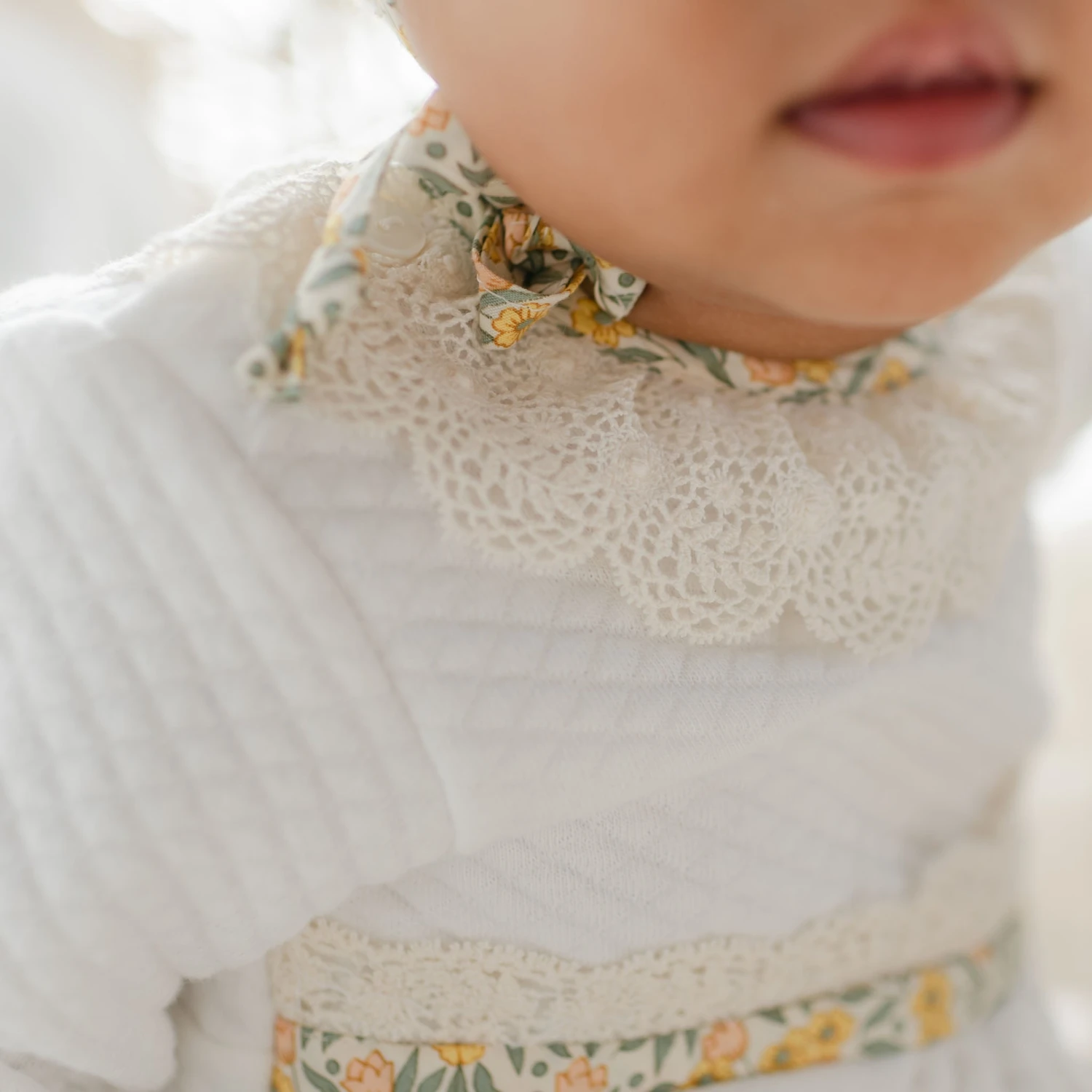 When looking for a classic outfit, you want something as comfortable as it is timeless. The Petite Fleur romper is the perfect boutique romper for your baby girl. Styled in a plush ivory quilted cotton, the romper features ecru lace along the neck and sleeves and floral cotton trim at the cuffs, waist and neck that add the perfect detail touch. The hidden snaps at the legs make diaper changes easy. Buttons at shoulders allow for ease getting her into her beautiful baby romper. Made to fall about ankle length depending on her height. Match with her Petite Fleur quilted cotton booties, bonnet or headband to complete the perfect look for coming home, newborn photos, or special party.