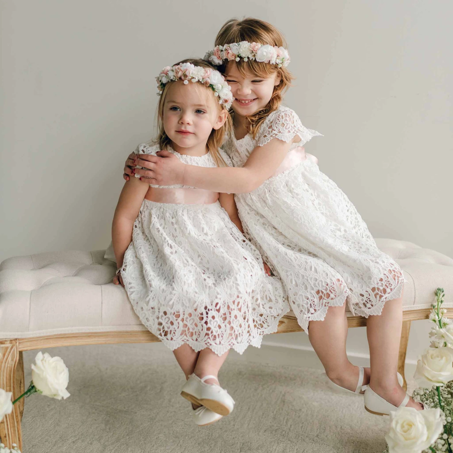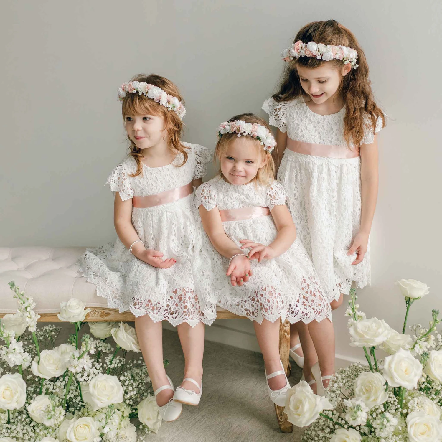 The ideal way to complete a flower girl look! Our pink floral wreath matches our flower crowns perfectly, allowing all your little ones to match! Lined with soft felt for comfort, a light ivory silk ribbon is used for a customized fit when tied into a bow. We intentionally leave the silk ribbon ends soft and unfinished, so some slight separation of fibers may occur over time.