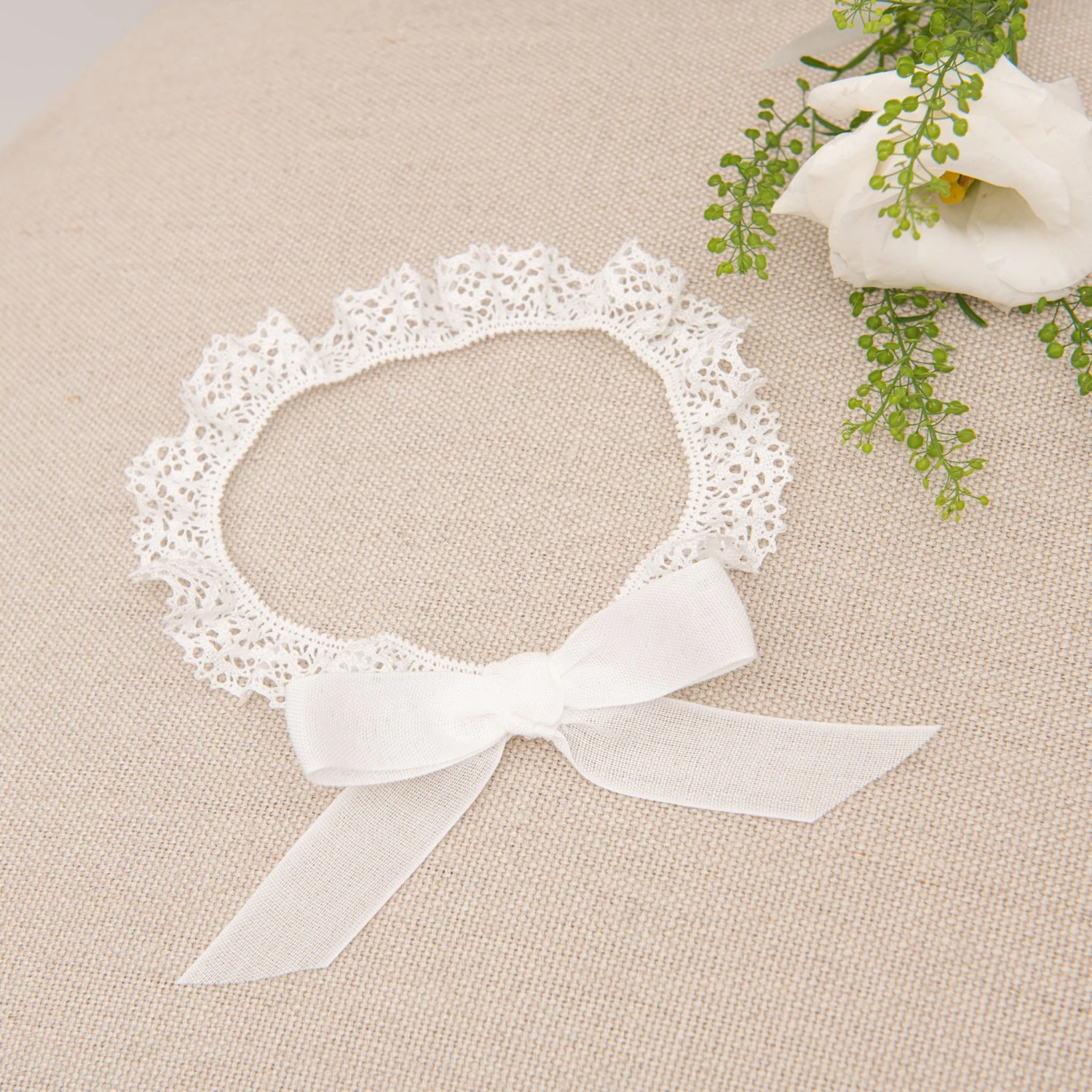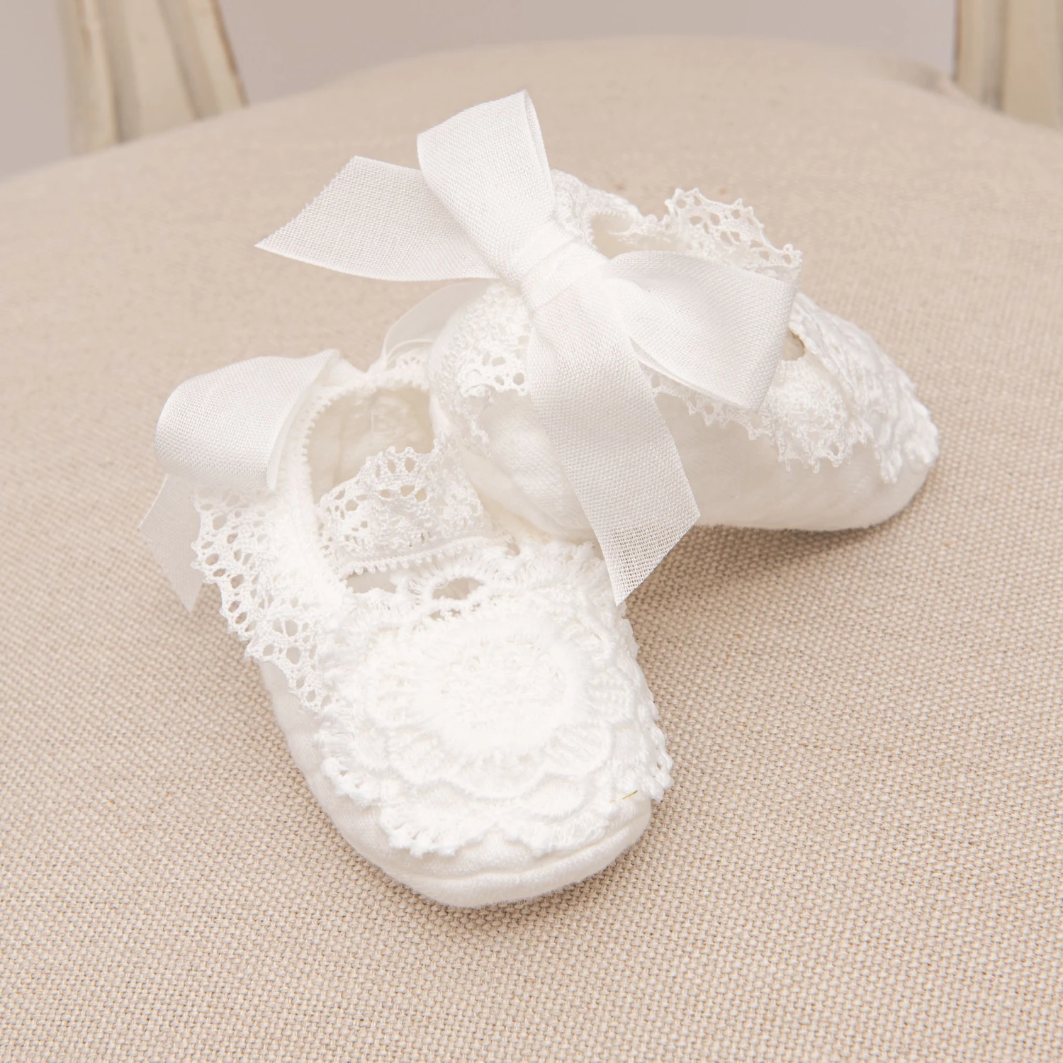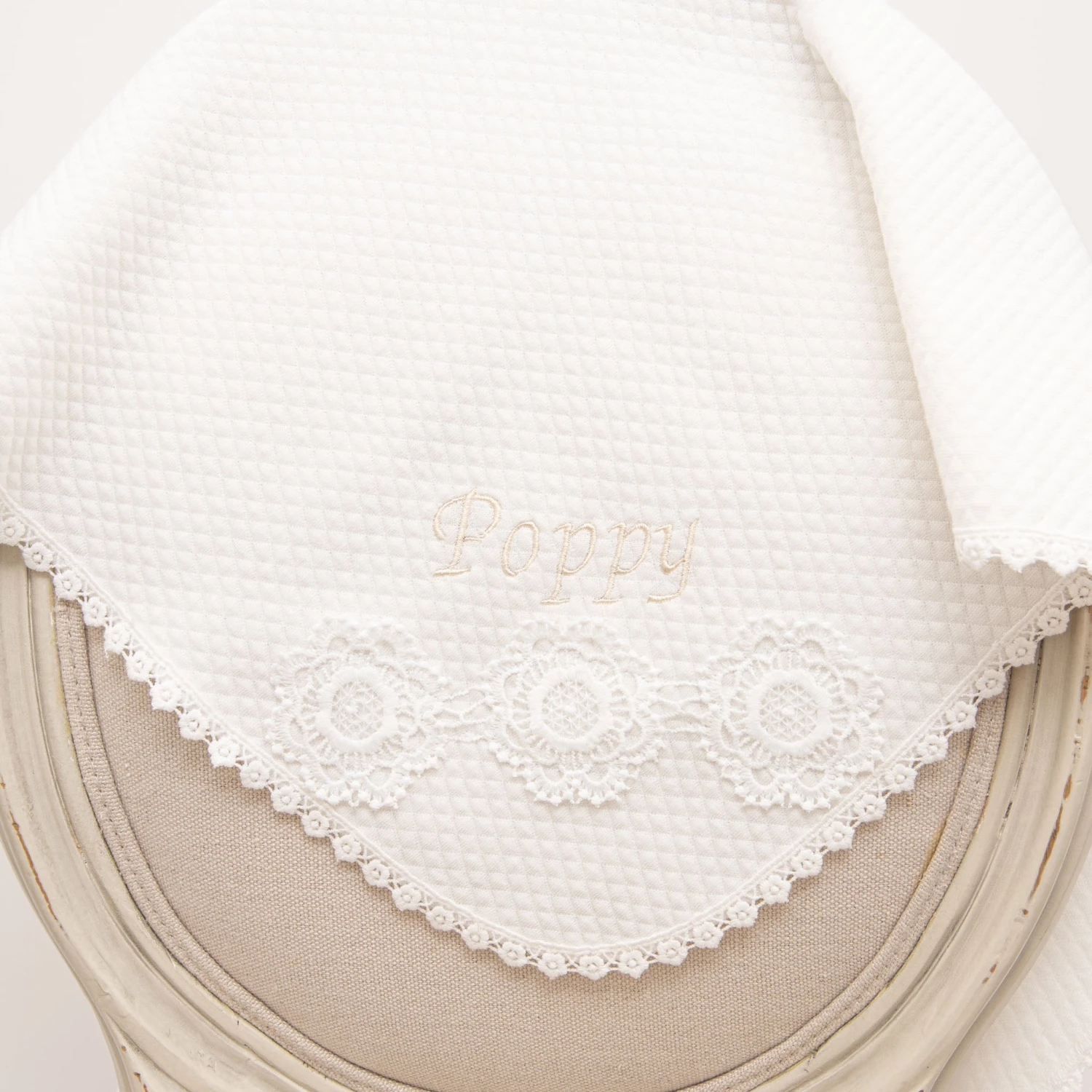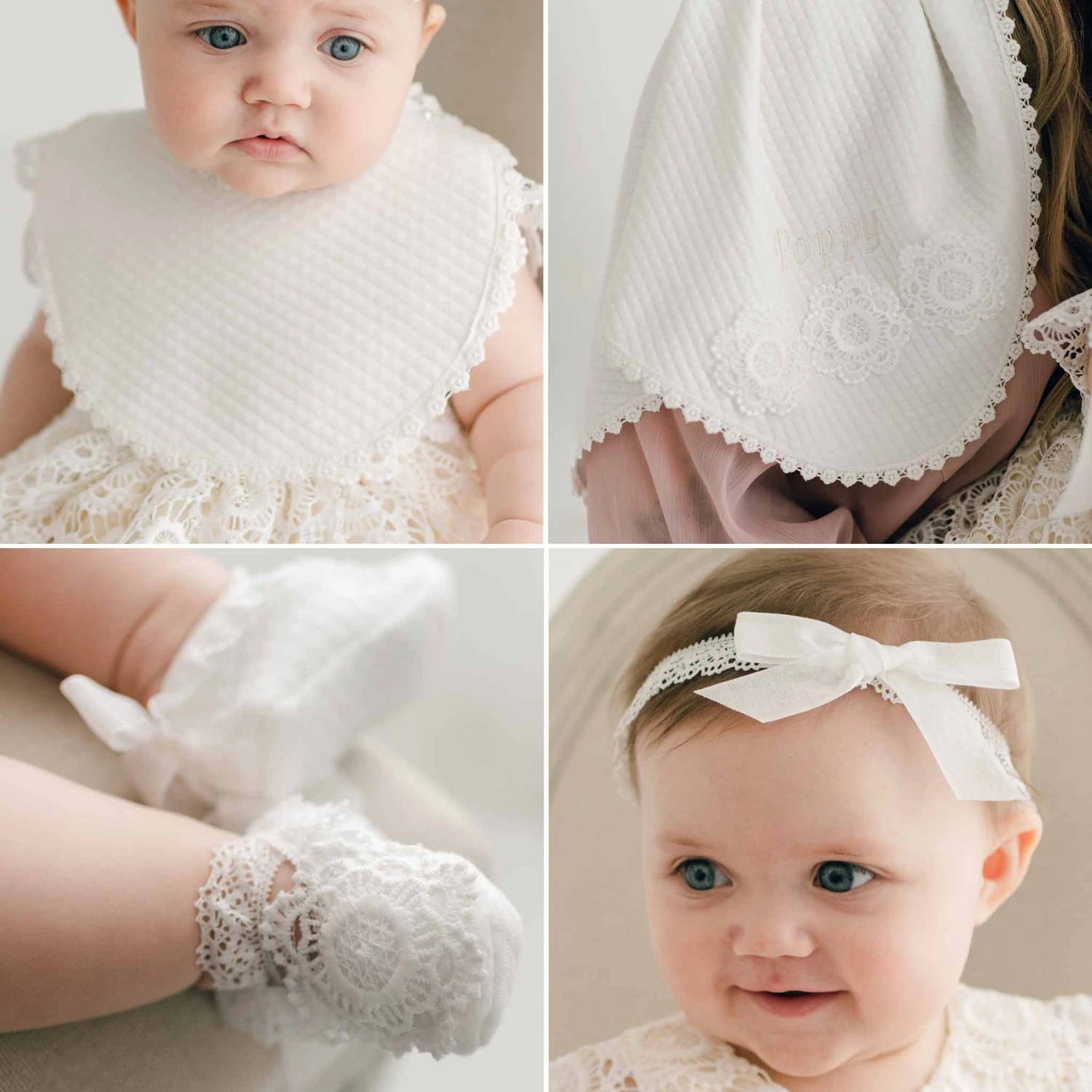 Everything needed to complete your baby girls Poppy Baptism gown or Poppy Dress are available here in this convenient package, and at a discounted price. This baby dress accessory set includes her Ivory Cotton baby shoes so her designer blessing gown or dress are perfectly styled from head to toe. It also includes her quilted Poppy bib to protect her special occasion dress from messes, and her personalized quilted blanket with her name embroidered in champagne thread on the corner for a gift she will cherish for years. The darling lace headband is perfect to switch with her bonnet for a more contemporary style. This set is timeless enough that it makes a perfect baby shower gift to pair with any special occasion baby dress such as her first birthday dress, blessing dress, or flower girl dress. Save 15% over purchasing these pieces separately.