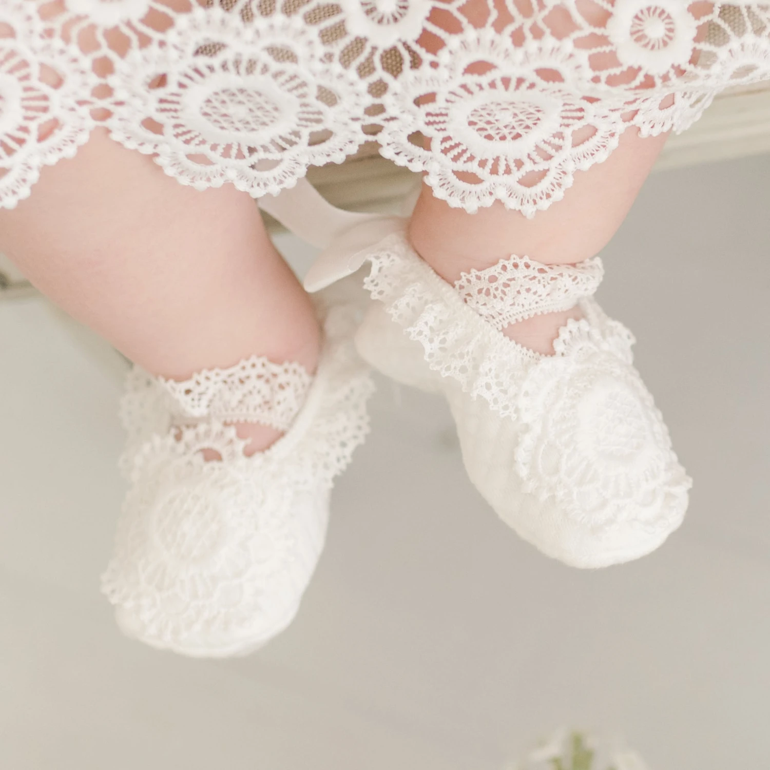 The sweetest little cotton baby shoes to keep her toes warm! The Poppy booties are handmade with a soft ivory quilted cotton for your little girl’s comfort, and are beautifully detailed with our unique Poppy lace applique so they perfectly match her blessing gown or dress. Cute cotton ribbon bows add an adorable touch, and soft elastic lace across the foot keeps a secure but comfortable fit, and also adds elegant detail around the edges. These are simply designed, so they can match with any special occasion outfit for baby girls.