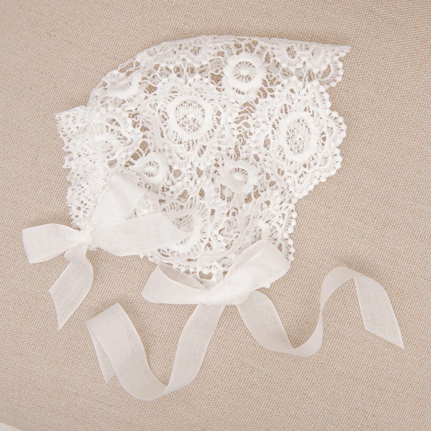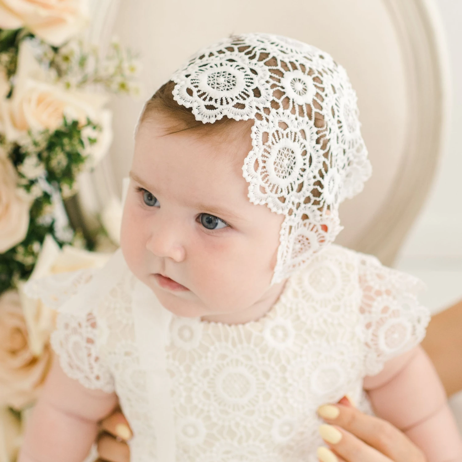 Designed to expertly pair with her Poppy dress and gown, the Poppy Lace bonnet, made with the same pretty scallop lace to frame her face and cotton ties to keep the traditional style, it will make her dress complete. The adorable cotton bow at the keyhole opening on the back of her bonnet is just another thoughtful detail that makes our girls baby designs special.