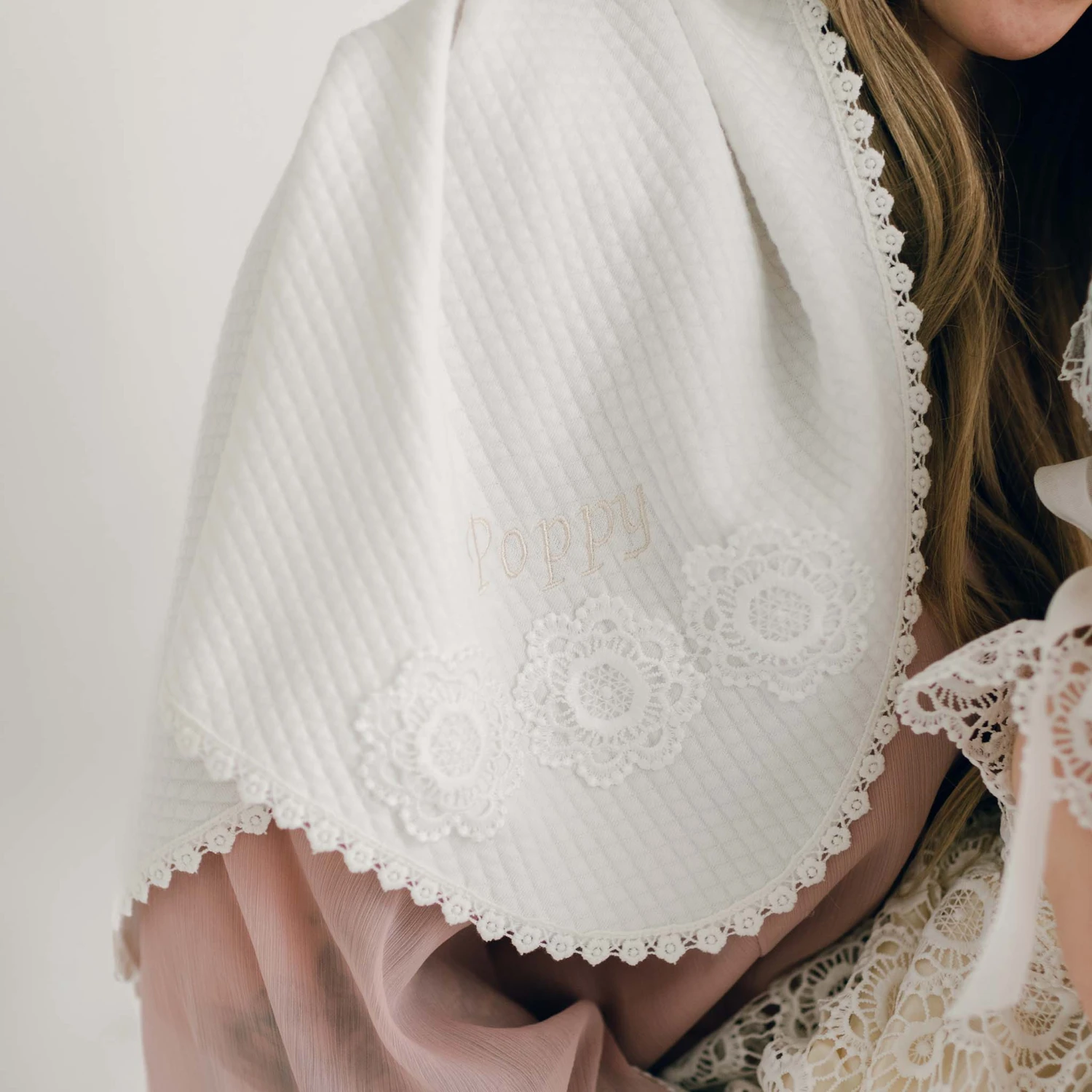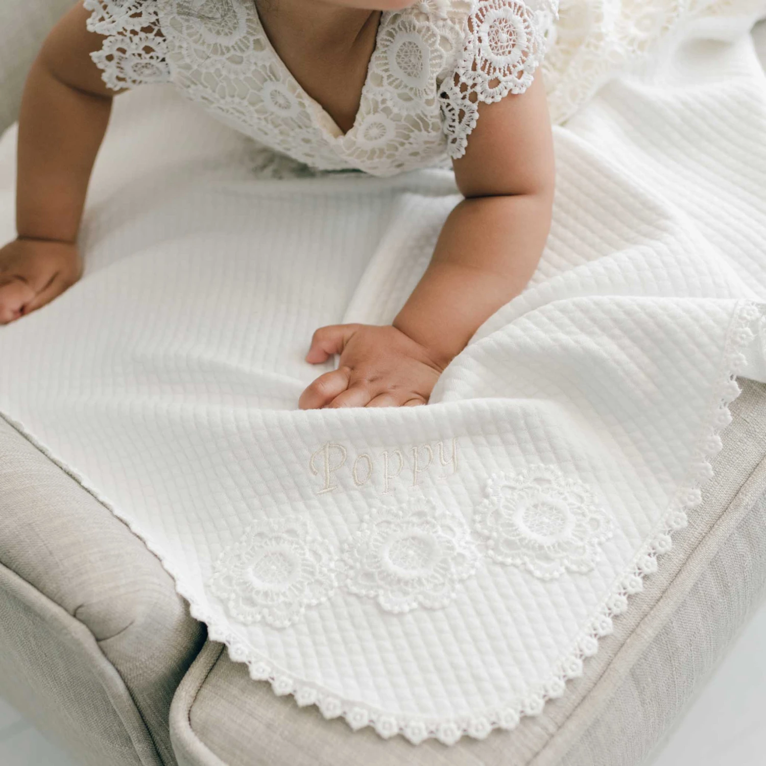 Complete her girls dress set with our gorgeous Poppy blanket. This cozy blanket is handmade with plush quilted cotton, so you know you will be wrapping her up in something soft. A corner is elegantly detailed with our special Poppy lace applique so it perfectly matches her heirloom length Baptism gown or her shorter dress. A beautiful lace edge finishes the look. The option to add her name embroidered on the corner in champagne thread makes this a sweet gift she will cherish for years. While it matches the Poppy collection, it is simple and pretty enough to match with any special occasion outfit! Pair with the Poppy baby bib, booties, and lace headband for a wonderful gift set.