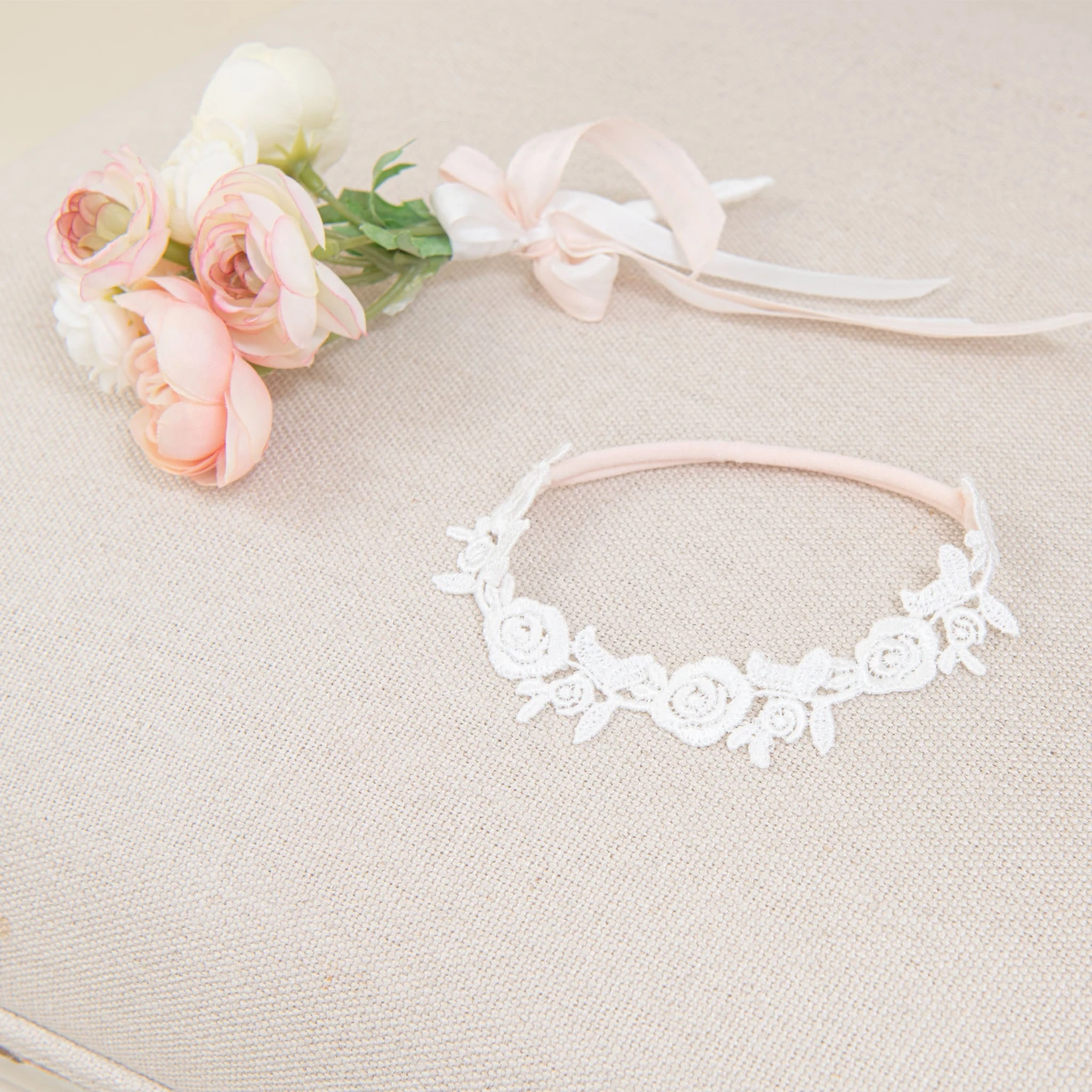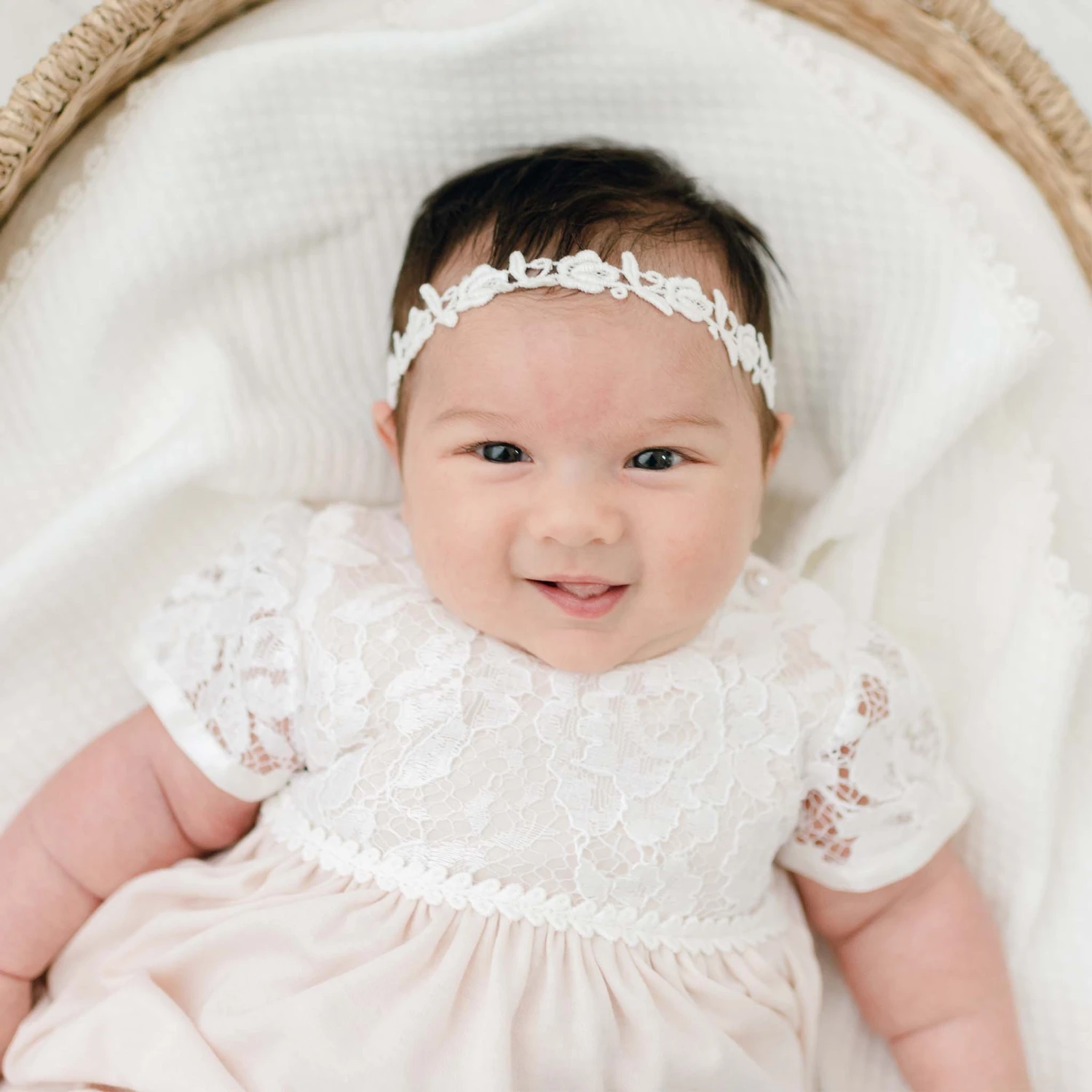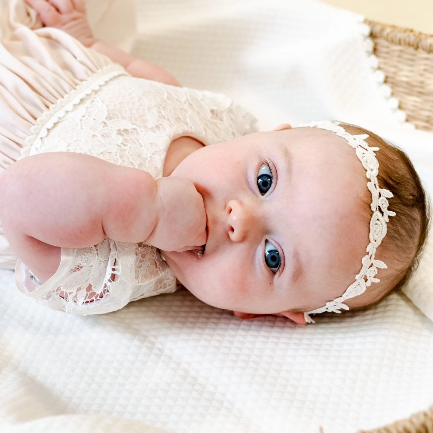 A fun and unique headband to create a new look for her Rose gown, dress or layette when not wearing her bonnet. The Rose lace headband is made with a soft hand-stretched nylon band to allow for plenty of stretch for a comfortable fit that will grow with her!