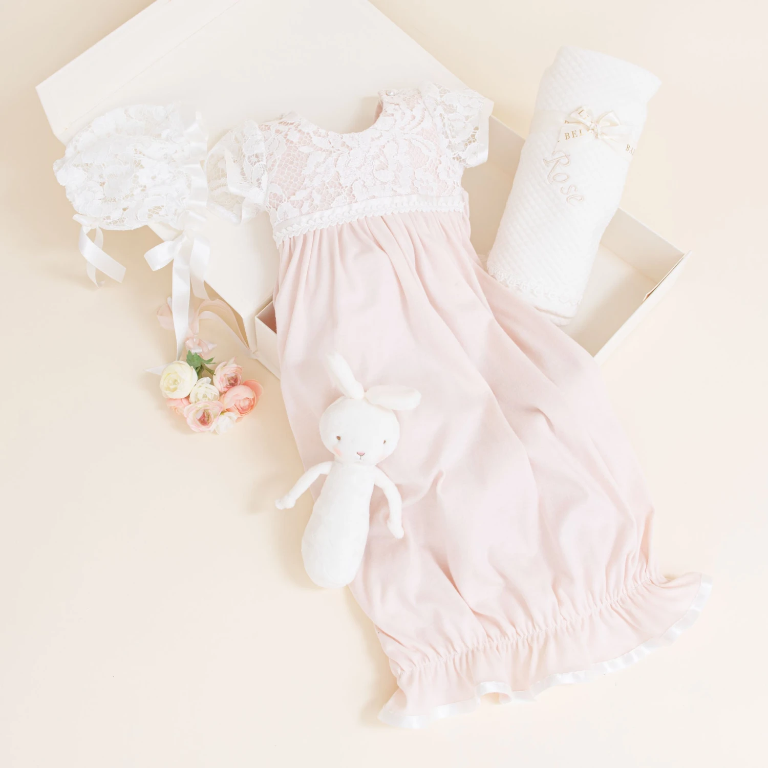 When looking for a newborn coming home gown, comfort and style are essential. This newborn gown is made with soft pima cotton in blush pink that was selected with baby’s comfort in mind and beautiful rose patterned lace on the bodice for just the right touch. The ivory Venice lace accent along the waist adds a special detail that is not found in most newborn baby outfits. Ivory silk ribbon trim adds the perfect delicate touch. This classic baby gown is as stylish as it is functional-the open skirt design keeps baby covered while also allowing easy diaper changes. Gift set includes the Rose layette gown, matching lace bonnet, white bunny chime rattle and Rose blanket with optional name embroidery! All pieces will come expertly pressed and packaged in a lovely tissue lined gift box.