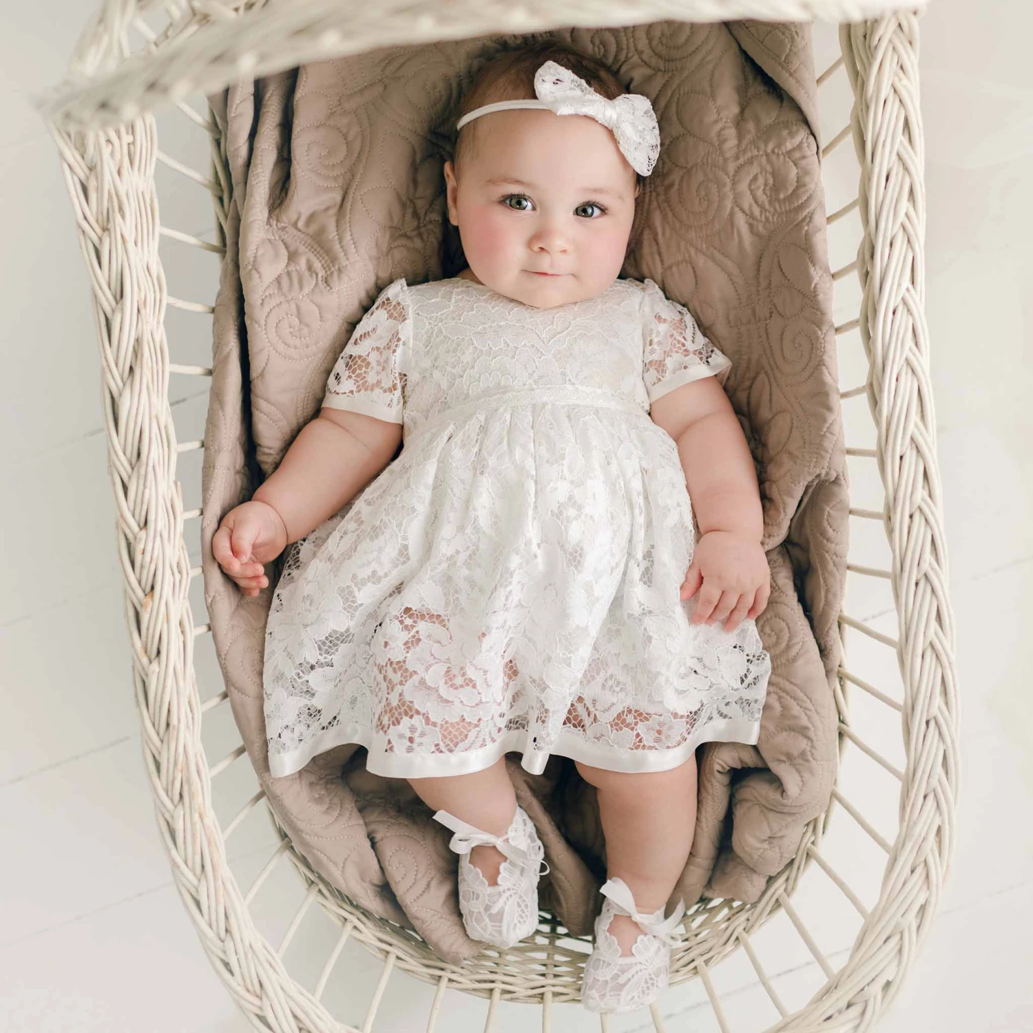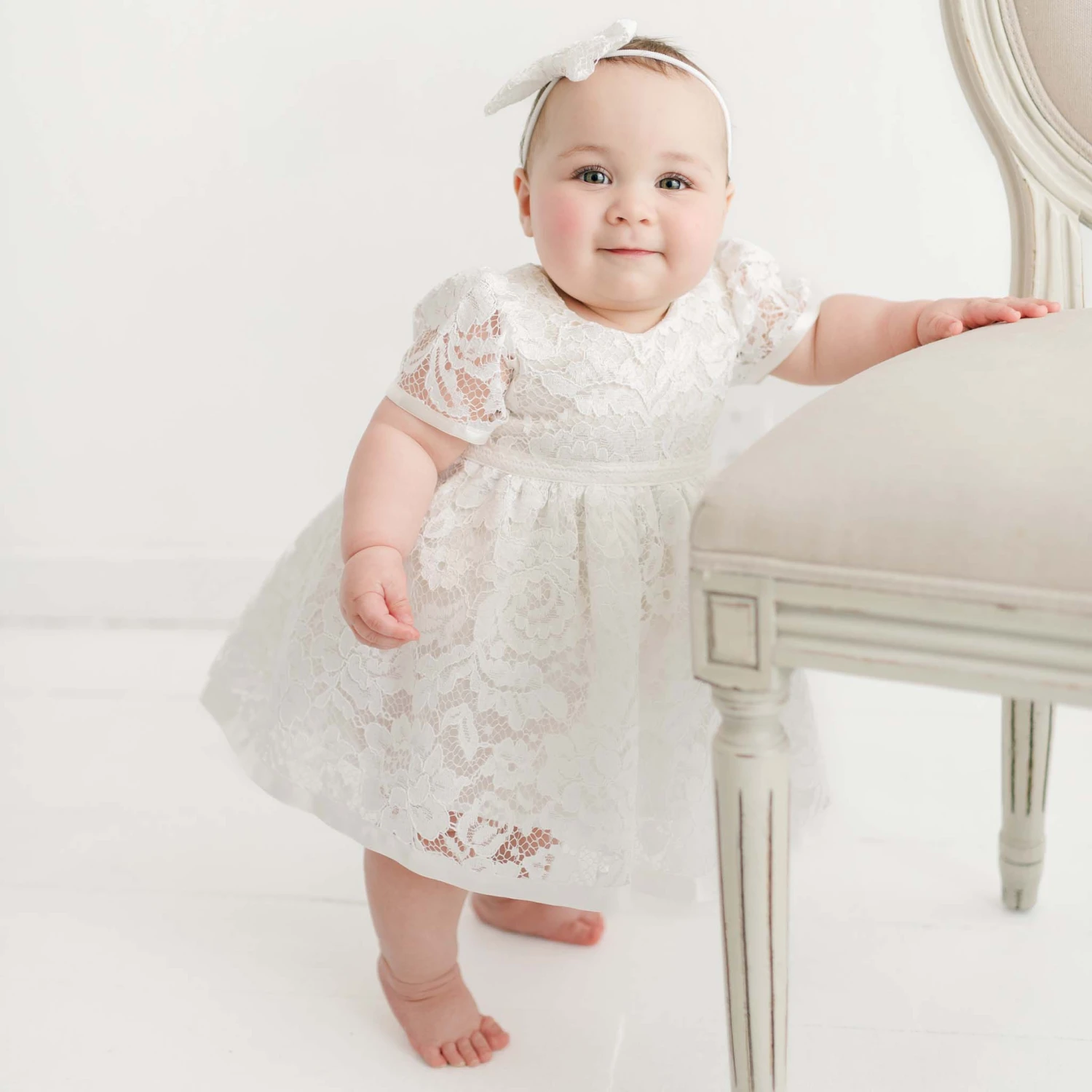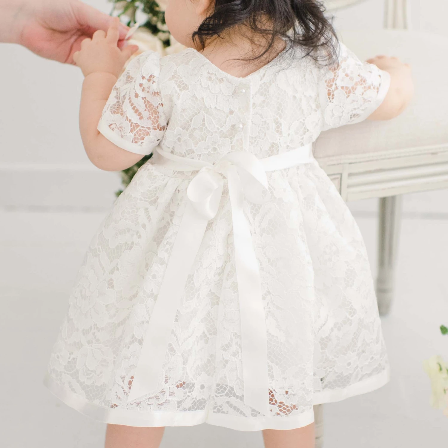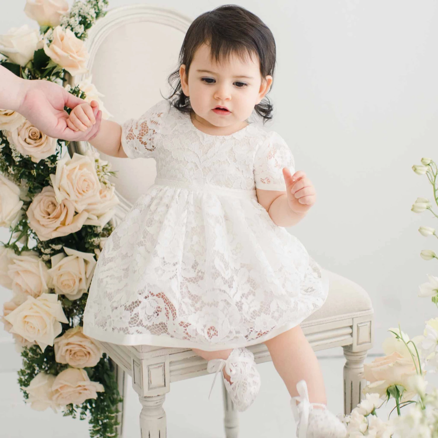 The Rose Christening dress is picture perfect! Made with a lovely light ivory lace in a pattern of delicate tea roses and leaves over a super soft cotton lining and trimmed with silk satin ribbon, to ensure she is as happy and comfortable as she is beautiful! A soft white cotton lining skirt with a romper underneath made in a natural cotton gauze with snaps for easy changes! Secured on the back with pearl style summarys and a silk ribbon sash for an easy fit. Designed to fall between her mid-calf and ankle, depending on her height, to allow ease of movement all day! Add one of our flower crown headbands to complete her sweet look!