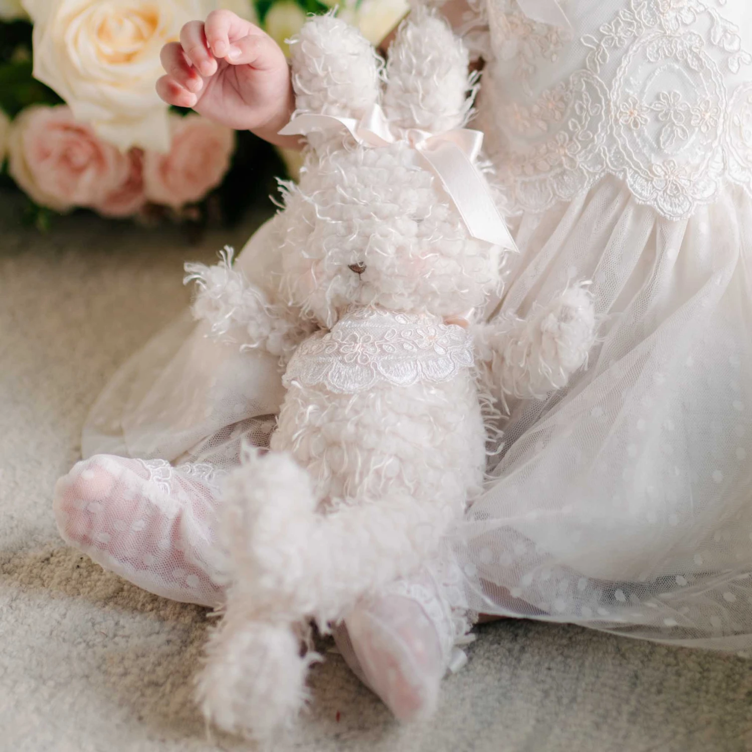 An adorable bunny to cuddle with just the right touch of lace and ribbon detail of lace to make it extra special! This super soft plush shaggy bunny will be well loved. Features soft cream fur and a sweet embroidered face. The perfect bunny friend to gift at a baby shower or christening!