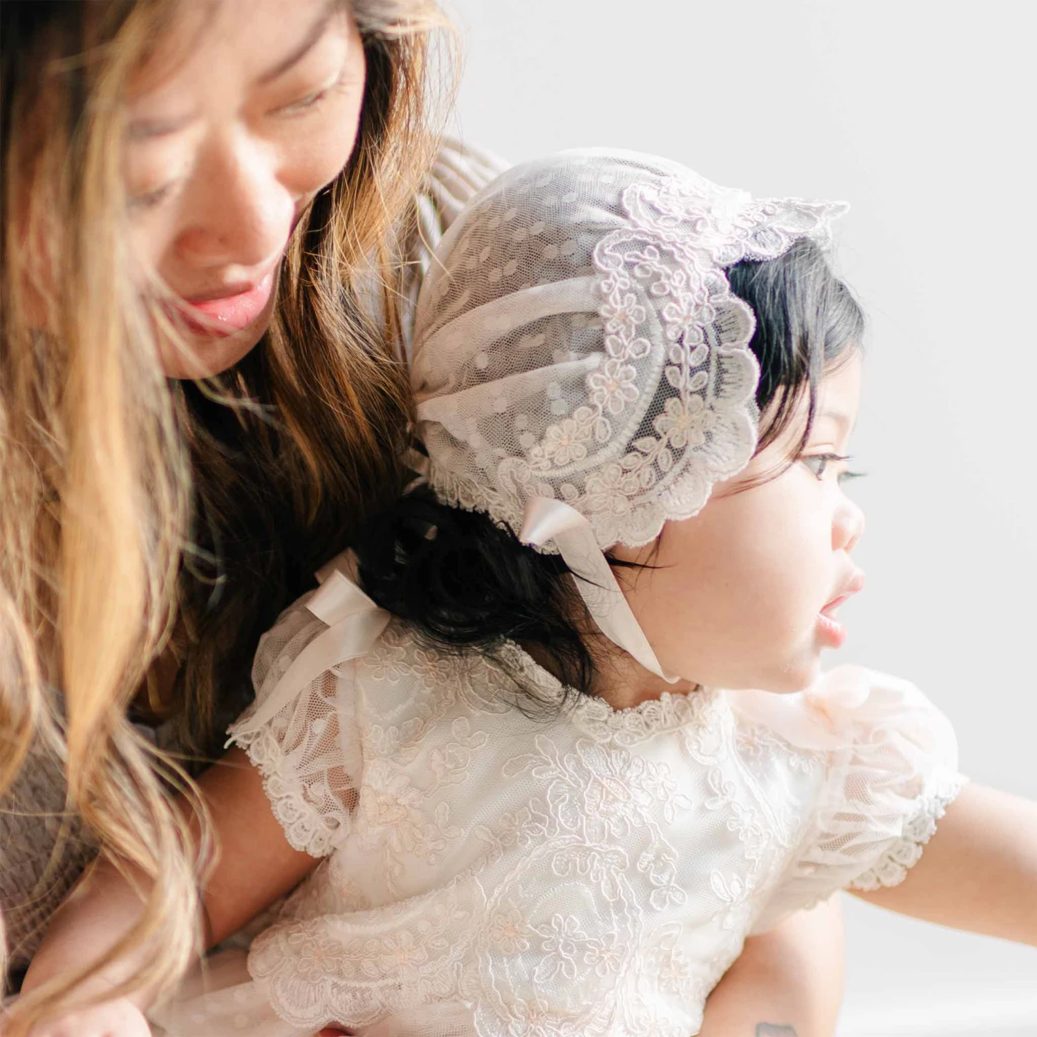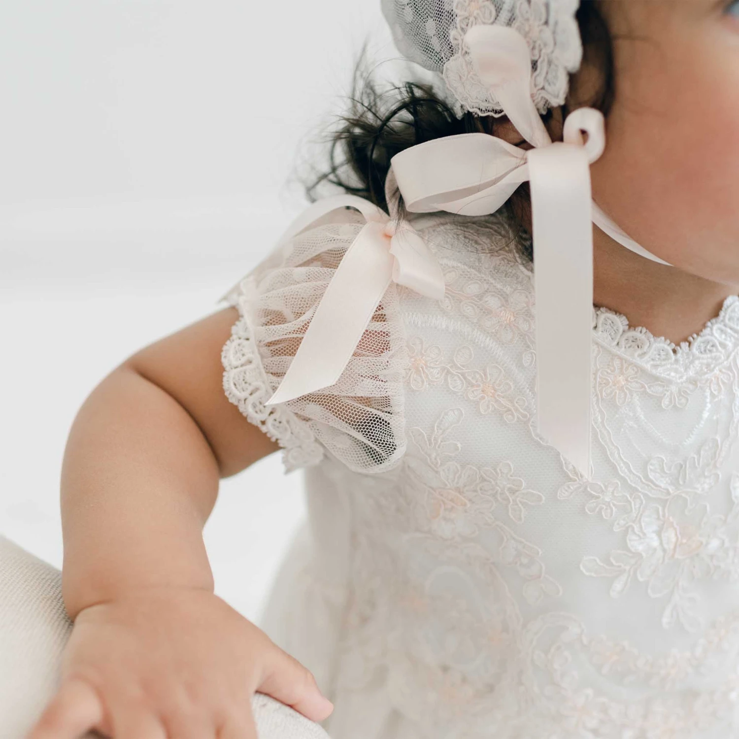 The Sophia dress and bloomer set uses layers of whimsical dotted lace in ivory and lined with soft pima cotton in ivory, to give your little one the perfect volume and flounce to her look. The bodice features an intricate corded and embroidered lace with scalloped edge to provide stunning detail. It has lace cap sleeves that are accented with an ivory lace trim, finished with sweet pink silk ribbon bows on the shoulders and a summary closure for a secure and comfortable fit. Paired with matching ivory pima cotton bloomers trimmed with matching ivory edge lace and a soft elastic wait to create an all-day comfortable fit. This dress is designed to fall between her knee and mid-calf depending on height. To complete the look, pair with the Sophia lace bow headband or lace bonnet.