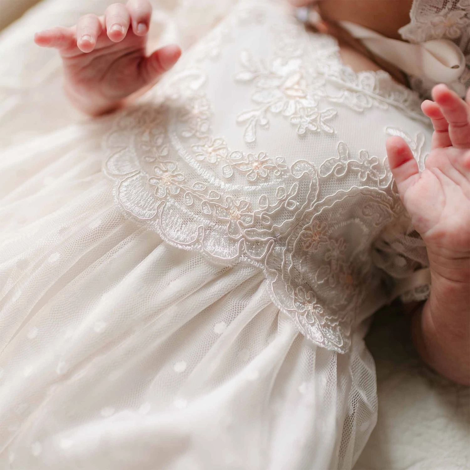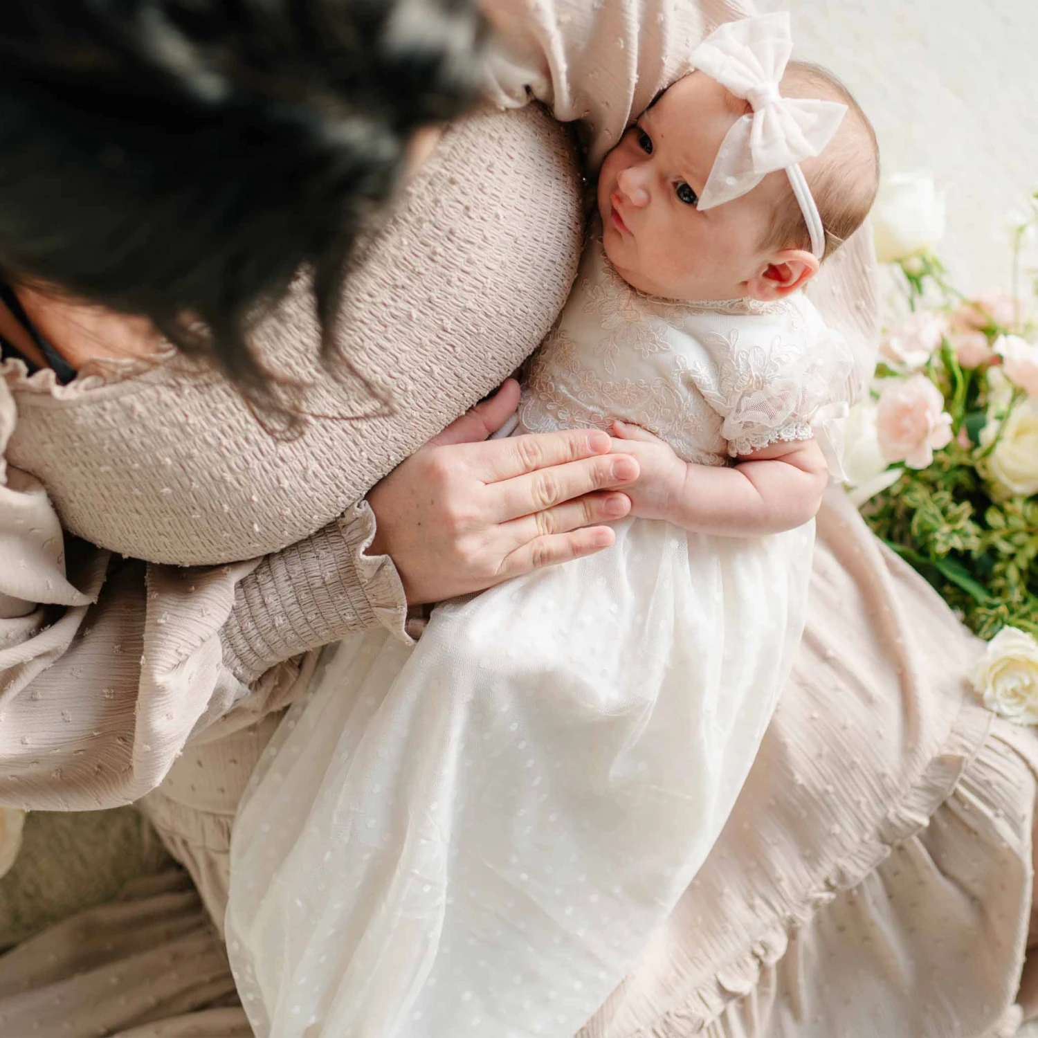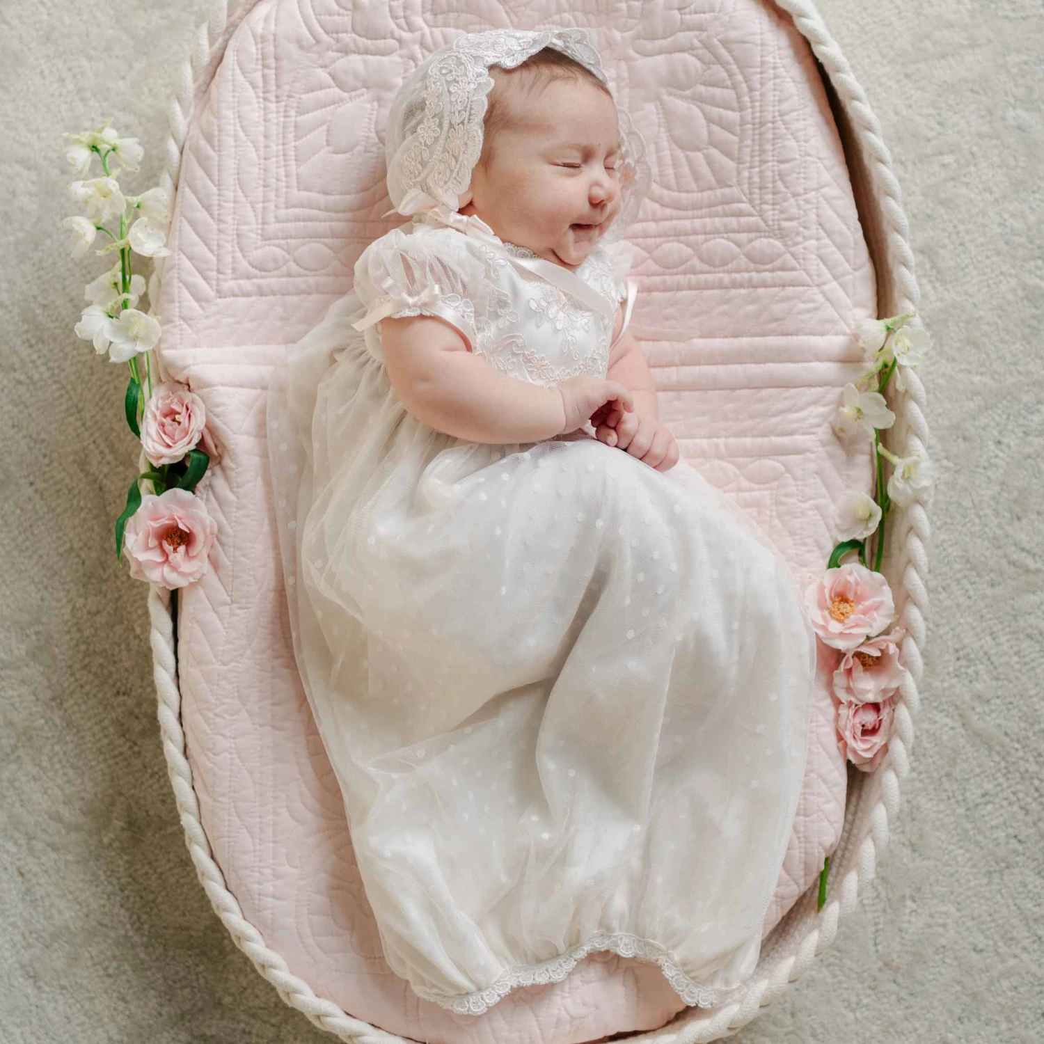 Welcome your little one into the world with our chic newborn gown. Made with a whimsical dotted lace in ivory and lined with soft pima cotton in ivory, we ensure ultimate comfort for your littlest bundle of joy. The sleeves and skirt hem feature a delicate edge lace, adding a charming touch from head to toe. The bodice showcases an elegant corded lace with convenient summary closure on the back make for effortless changes. Pink silk ribbon bows adorn the sleeves for a perfect finishing touch. Pair with the matching Sophia lace booties and bonnet or one of our Sophia headbands to complete her look! This gown is perfect for capturing those precious newborn photos or her blessing day.