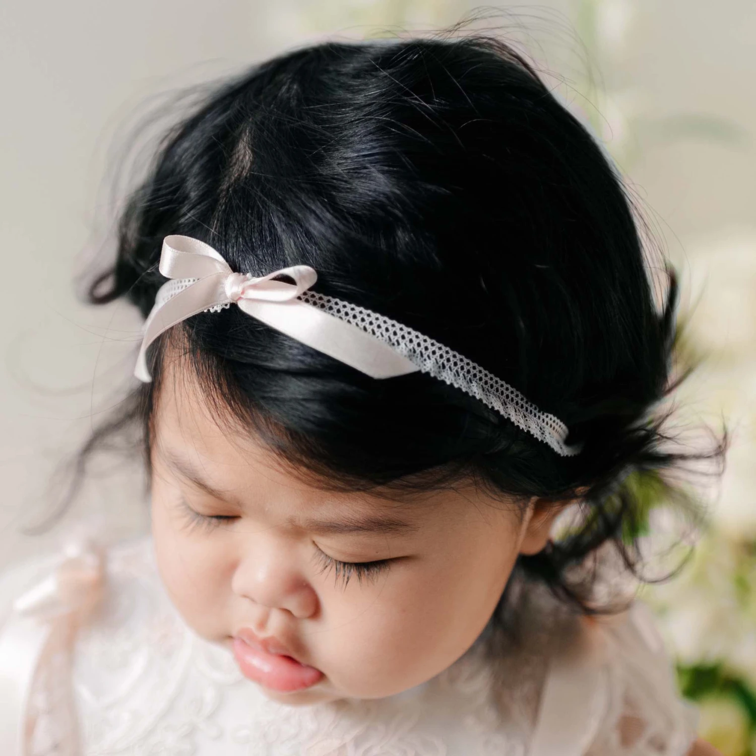 So simple and sweet! Made with a soft ivory lace elastic that stretches to a comfortable and secure fit. Detailed with the same pink silk ribbon bow featured on the Sophia dress and layette. A beautiful way to complete her Sophia outfit if you prefer a small and dainty accessory.