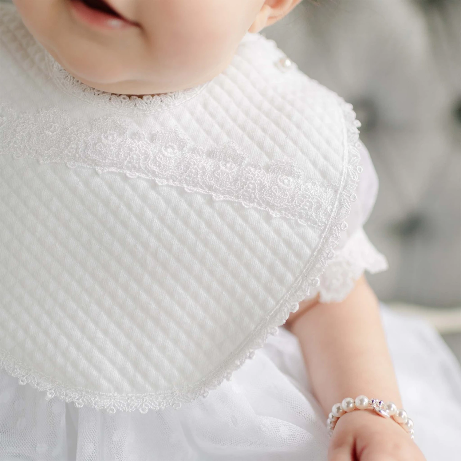 A beautiful bib to help keep your little one’s special outfit clean! Crafted with our soft and plush quilted cotton and trimmed in a beautiful white edge lace. Detailed with the matching Stella venice lace for an extra touch. A pearl style summary closure finishes the timeless look.