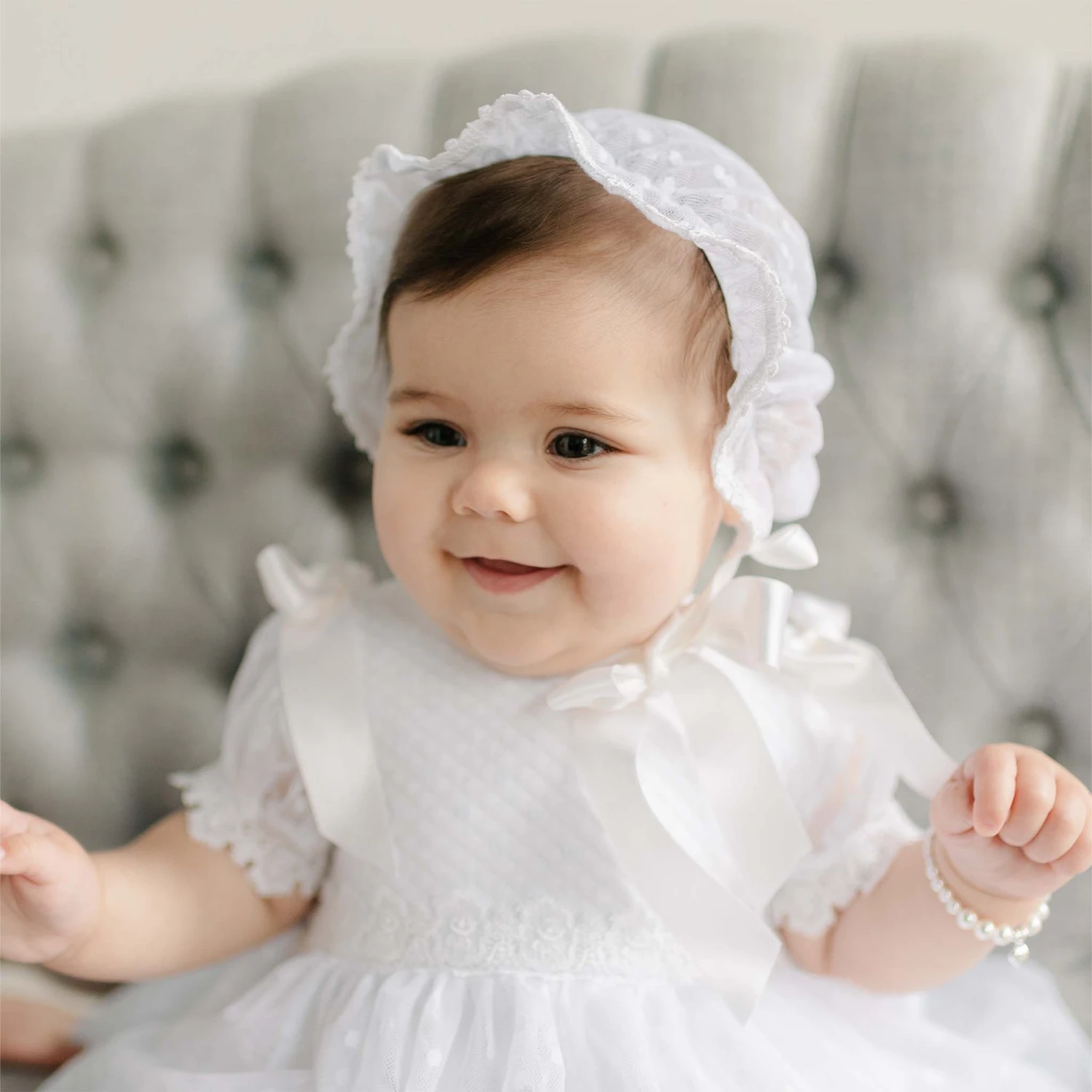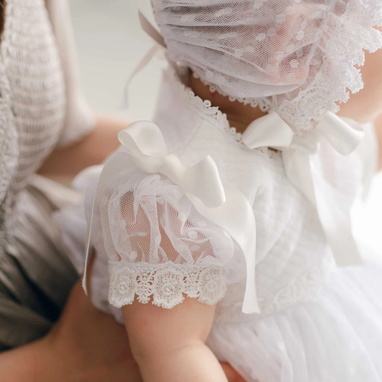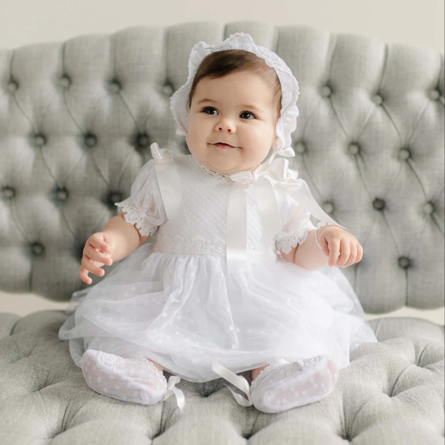 The Stella Dress & Bloomers set features layers of delicate white dotted lace, lined with soft white pima cotton to create graceful volume and movement. The bodice is adorned with intricate scalloped Venice lace, complemented by lace cap sleeves trimmed with white lace and finished with elegant white silk ribbon bows on the shoulders. A summary closure ensures a secure and comfortable fit. The coordinating white pima cotton bloomers are trimmed with matching edge lace and a gentle elastic waistband for all-day comfort. Designed to fall between the knee and mid-calf, this ensemble pairs beautifully with the Stella lace headband or bonnet for a refined, complete look.