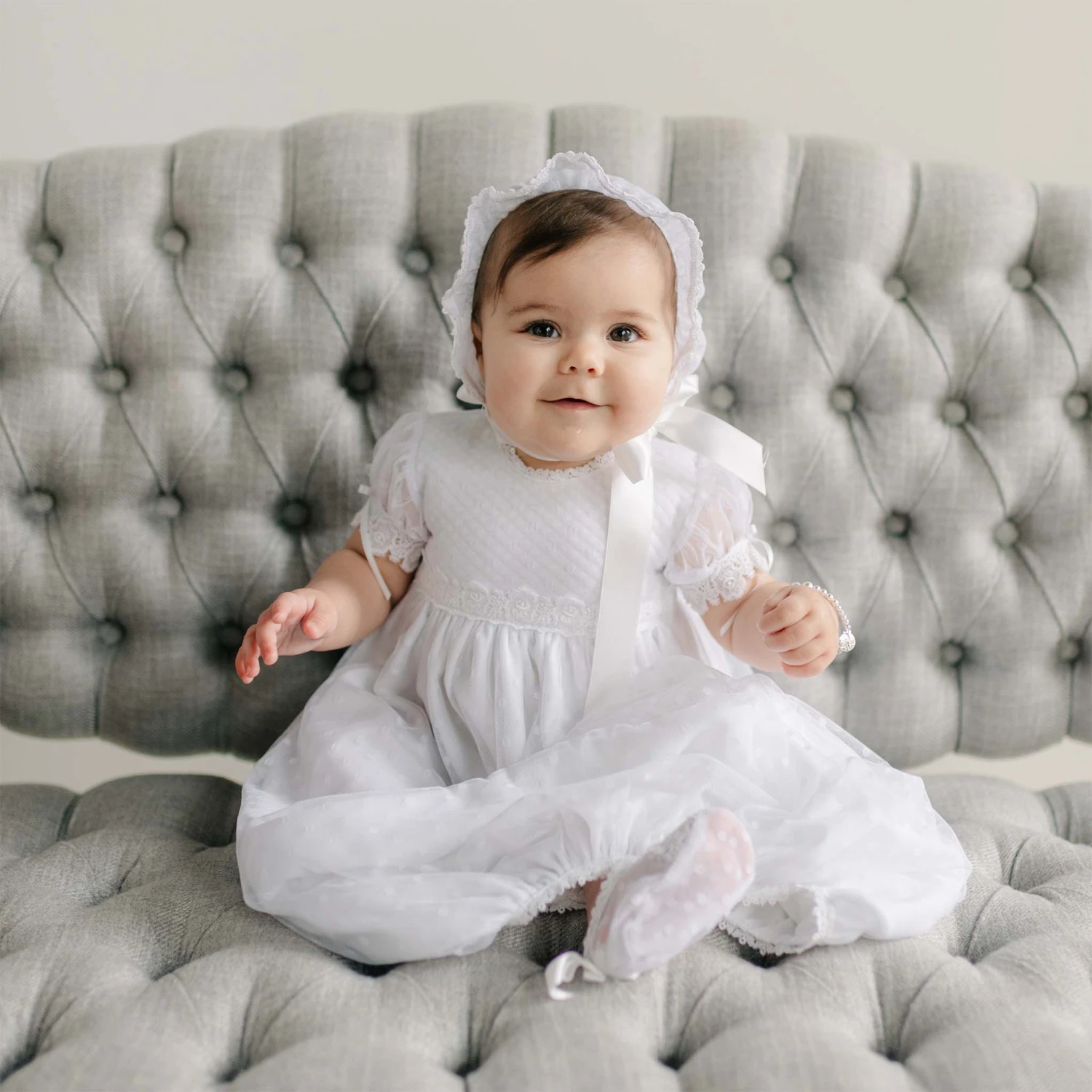 Welcome your little one in style with the charming Stella Layette gown! Made from soft white dotted lace and lined with cozy white pima cotton, it keeps your baby comfy and cute. Sweet edge lace decorates the sleeves and skirt hem, while the bodice shines with delicate venice lace and a handy summary closure in the back. White silk ribbon bows on the sleeves add a delightful touch. Match it with the Stella lace bonnet or headband for an adorable outfit perfect for newborn photos or a special blessing day.