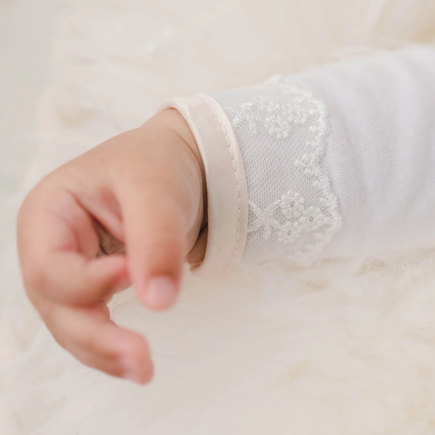 When looking for a newborn coming home gown, comfort and style are essential. The newborn gown is made with soft pima cotton in white, and features a plush white quilt bodice that was selected with baby’s comfort in mind. The ivory Venice lace accent along the neck and cuffs adds a special detail that is not found in most newborn baby outfits. Pink champagne silk trim adds the perfect delicate touch. This classic baby gown is as stylish as it is functional-the open skirt design keeps baby covered while also allowing easy diaper changes. Add her newborn baby booties, bonnet or headband for a complete coming home outfit that is as sweet as she is.