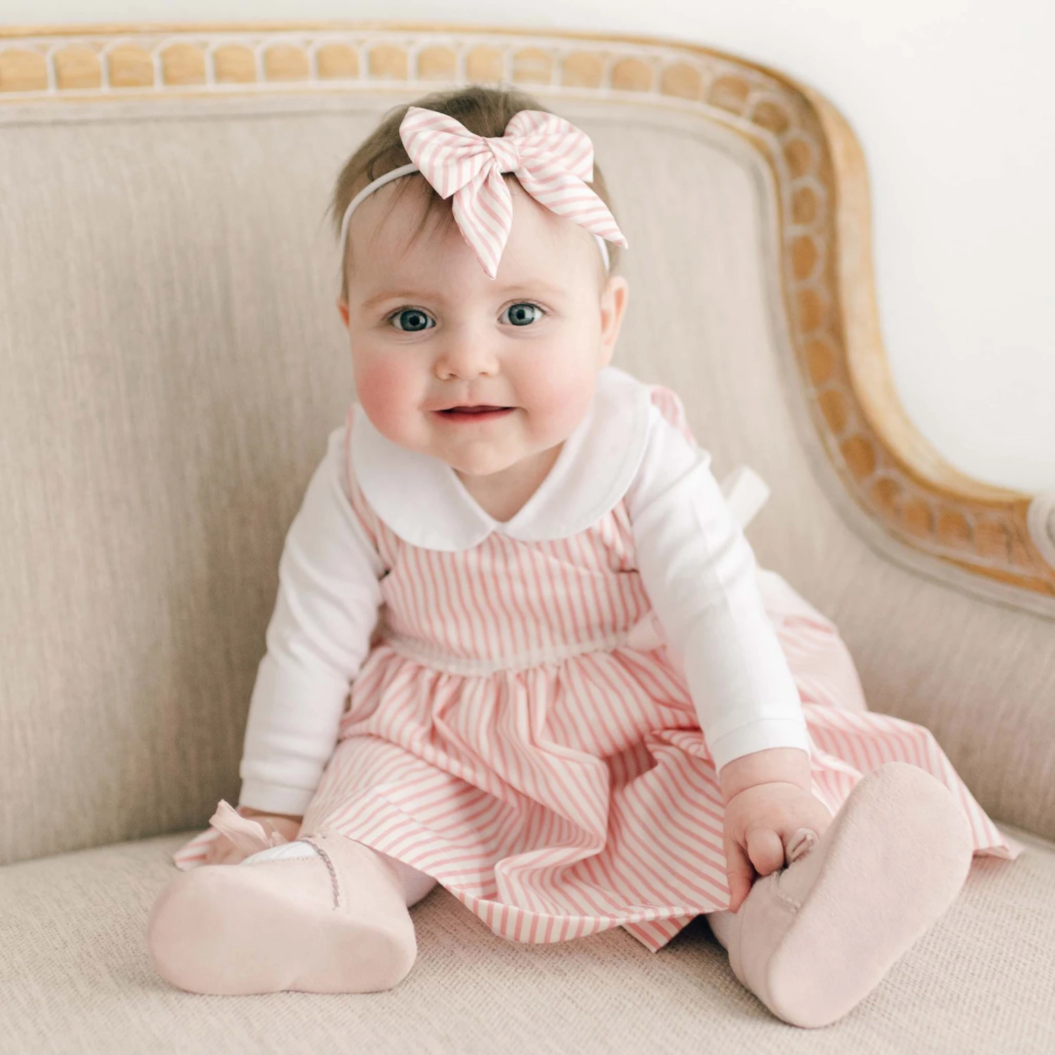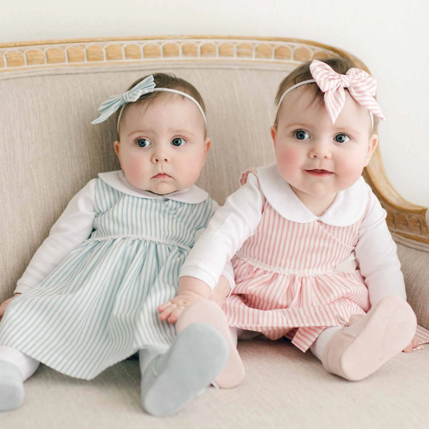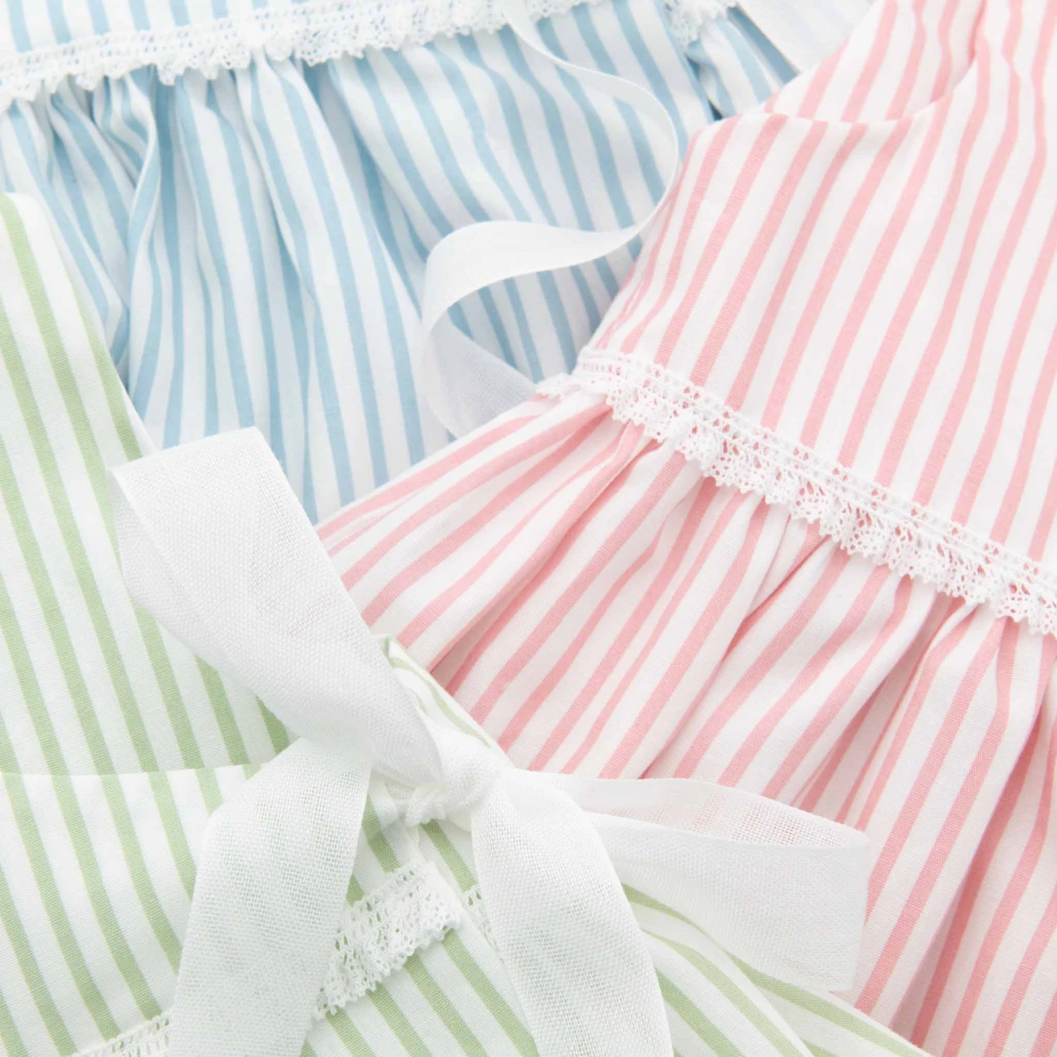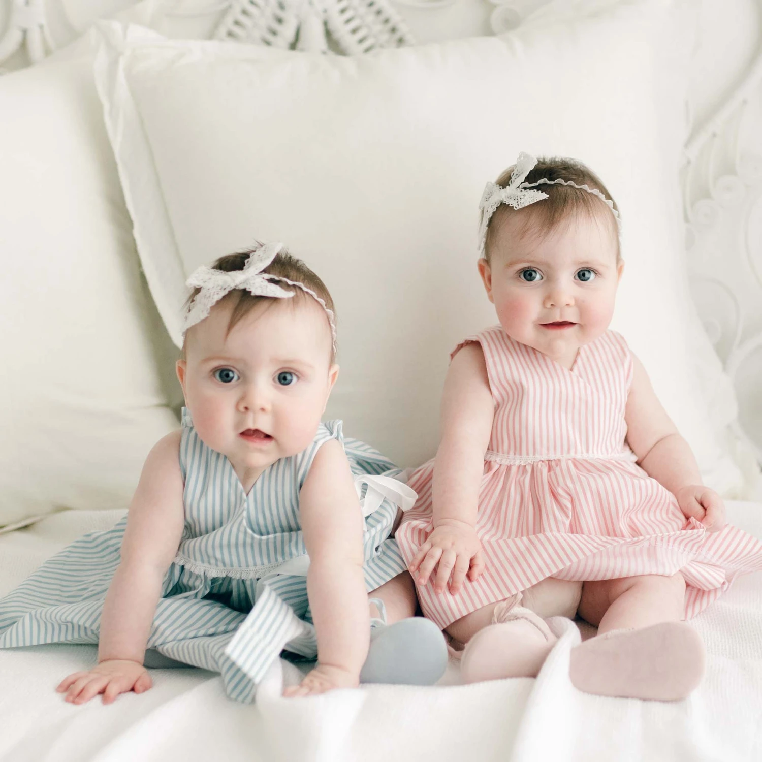 A simply charming wrap dress perfect for a party or special occasion! The Thea wrap dress is made in a soft and light striped cotton in a choice of colors, Pink, Robin’s Egg or Sage! With a sweet and delicate lace detail on the waist. Securely fastened with an inner cotton ribbon tie that allows you to create the most comfortable fit for her and a coordinating cotton ribbon tie on the side for a perfect finishing bow! Paired with her matching Thea Bow Headband and Suede Tie Mary Jane Shoes, it is an excellent outfit for her first birthday!
