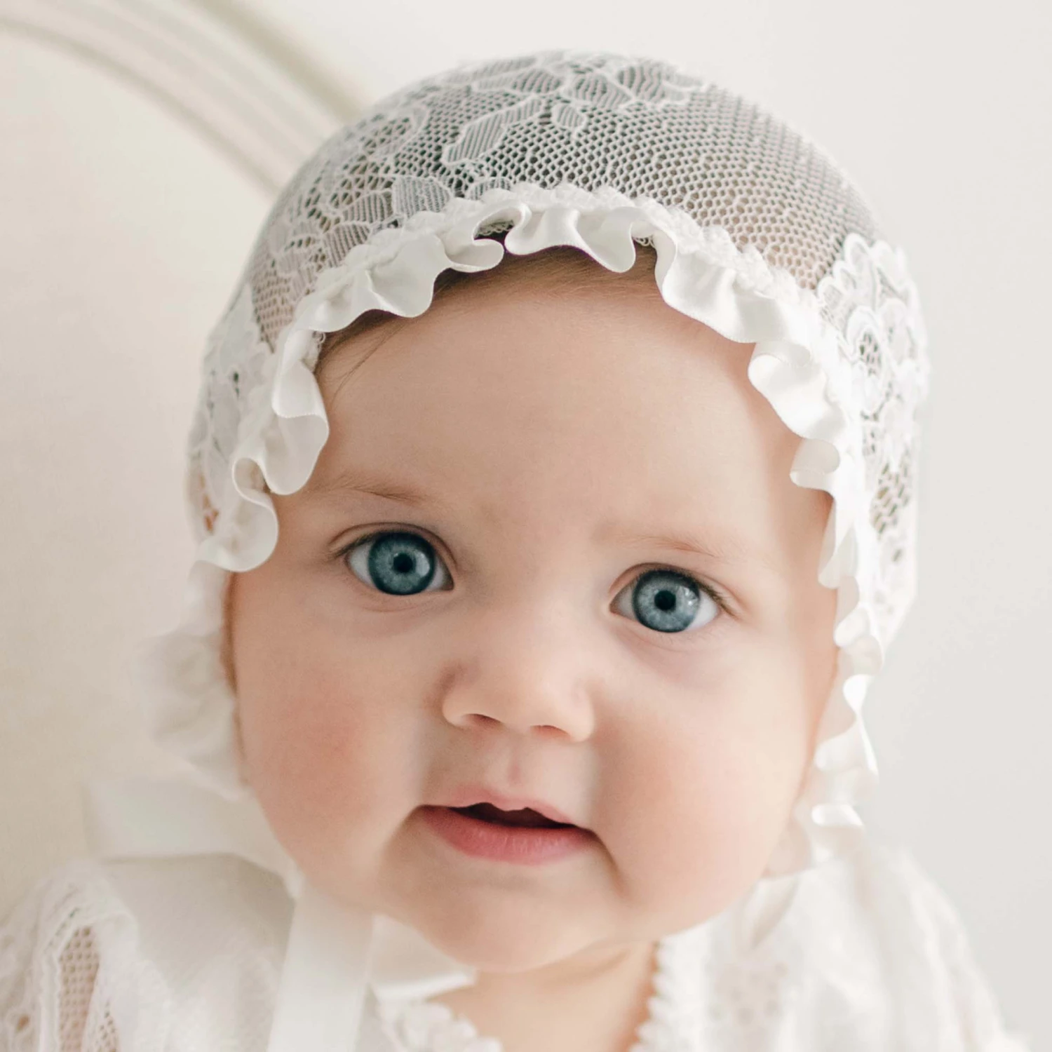 The Victoria Lace Bonnet is the perfect match to the Victoria Lace Dress. Crafted with a lovely ivory floral lace. Designed in a fitted style that frames her face so beautifully. Ivory silk ribbon ties and ruffle are a sweet finish.